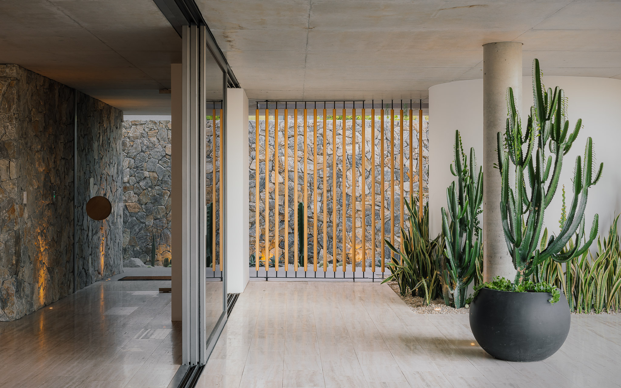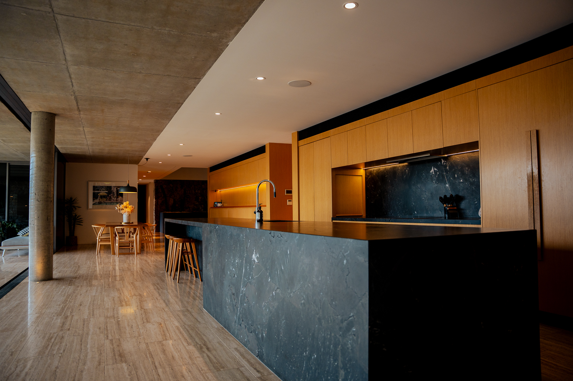 The entrance into Aluminaire sets the tone for the rest of the home, establishing an ambience of grandeur from the moment you step through the oversized black front door. The open-plan layout of Aluminaire seamlessly integrates an earthy colour palette and natural textures, featuring striking rock and concrete walls that exude elegance. This location boasts four generously sized bedrooms, including a stylish master with incredible views, and a delightful children’s bedroom with a bunk bed. There are two functional bathrooms that utilise the marble tiling and timber cabinetry seen throughout the home. Moving through this location, you will find a well-equipped home gym complete with a sauna, a sunlit laundry and games room that features 5 arcade machines.