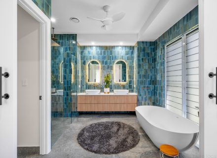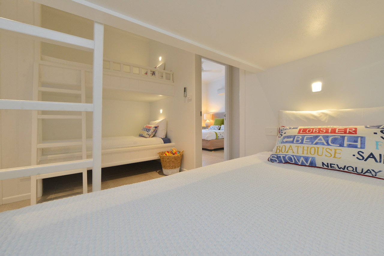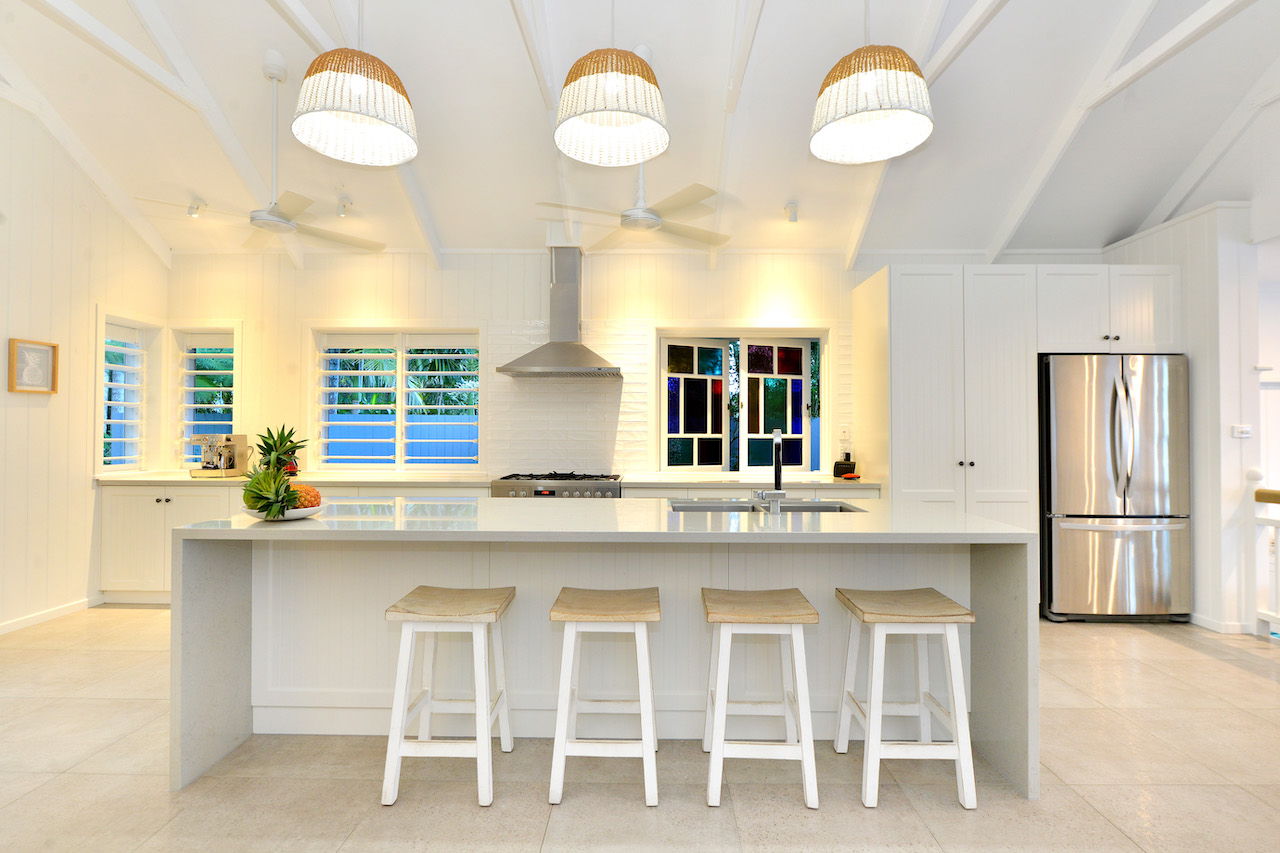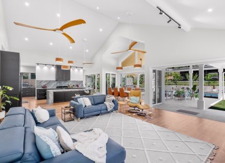 The interior of the property is a seamless blend of modern design and traditional ‘Queenslander’ charm. High rafters and wooden louvres create an airy and welcoming atmosphere, while the pavilion style architecture adds a touch of sophistication to the space. The 5 bedrooms and 4 bathrooms offer ample space for your crew to prepare and recharge, ensuring comfort and convenience throughout your stay.