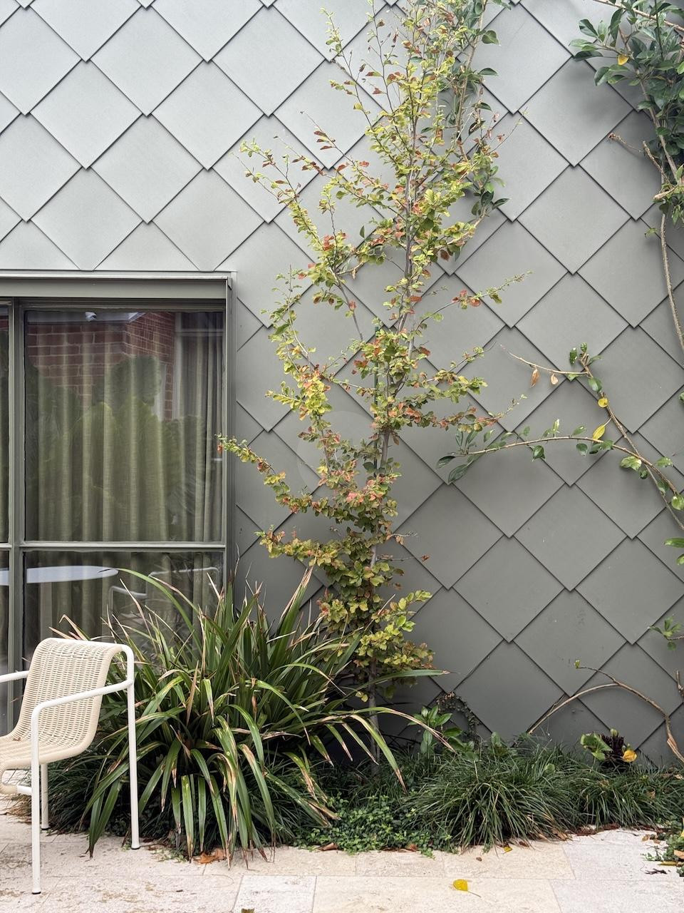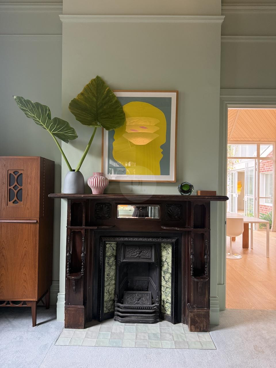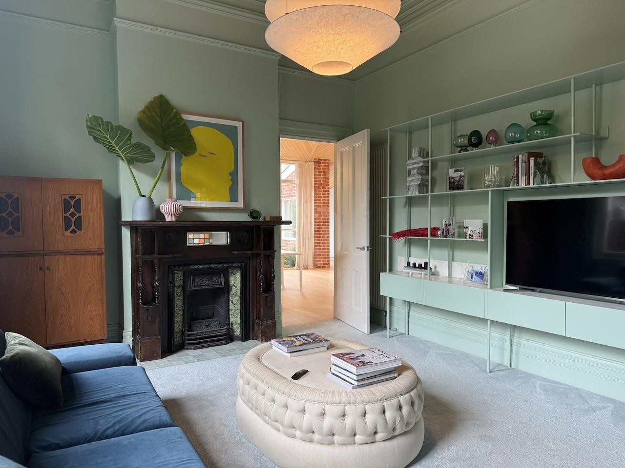The original Federation façade gives way to a dramatic rear extension clad in green zinc shingles, a sculptural and unexpected design moment that elevates the home’s creative energy. Inside, light pours in through expansive windows and oversized skylights, casting a glow across natural stone surfaces and custom joinery throughout the kitchen and bathrooms.