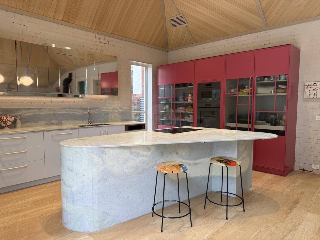 Bonbon offers an array of beautifully styled, functional spaces ideal for both photoshoots and filming, with a nod to mid-century modern style with a green carpet staircase.. From the colourful, statement kitchen with island cooktop to the bold bathroom tile selections, every room offers unique texture and visual interest. The living and dining spaces are generous yet curated, perfect for capturing everything from intimate lifestyle moments to polished commercial content.