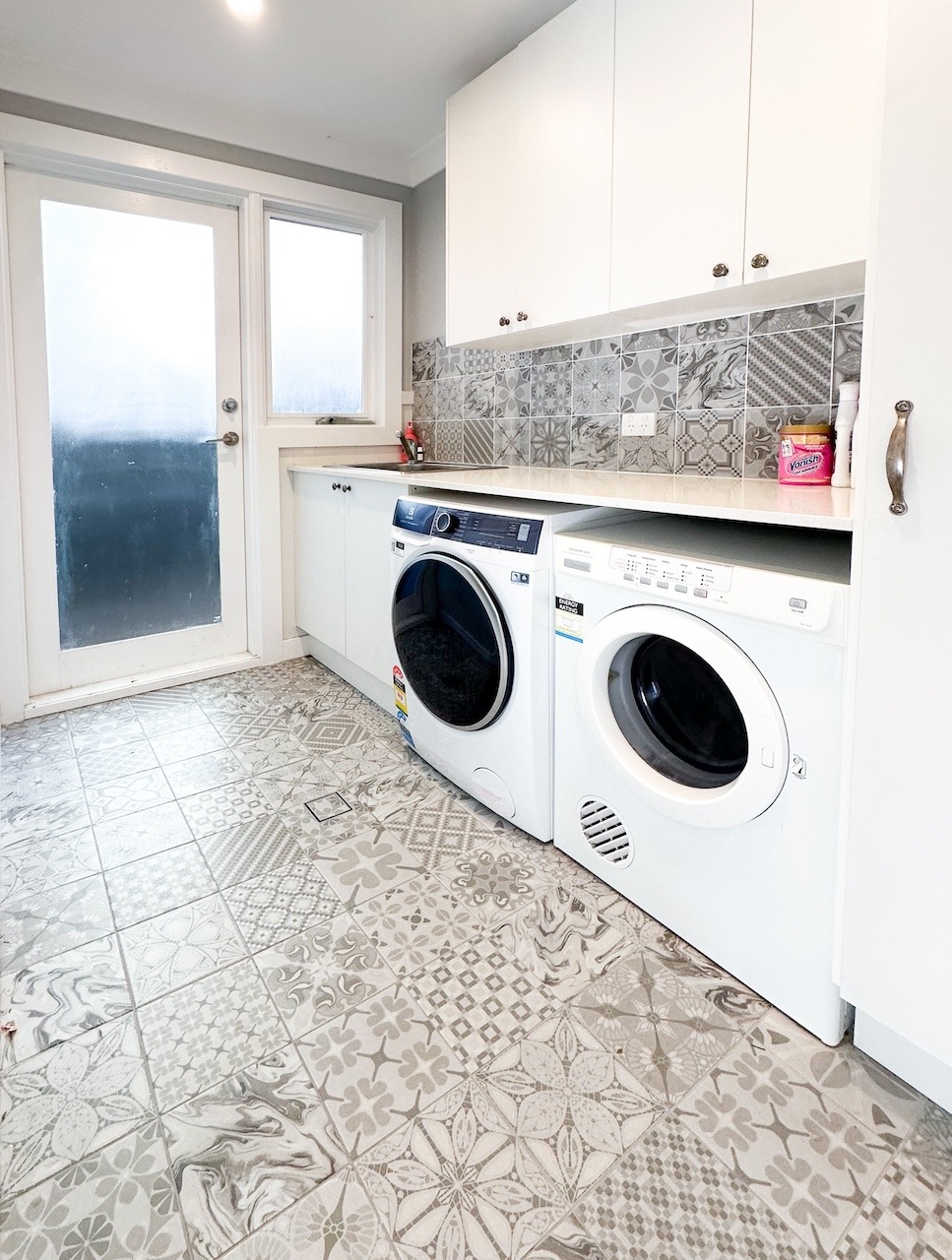 As you step inside, you’ll be greeted by a large white kitchen featuring homely country-style cabinetry and a clear glass splashback that offers views of the lush external greenery. The main living zones boast elegant timber floorboards, while high cathedral ceilings add a touch of loftiness and airiness to the space. This property offers four bedrooms, including a spacious master bedroom with a WIR, a charming pink teenage girls’ room, a cool blue teenage boys’ room, and a neutral guest bedroom for brands looking for bedding and homewares inspiration for their next creative campaign. With three bathrooms and a spacious laundry, all adorned with stylish grey and white Moroccan tiles, every corner of this house offers both character and sophistication.