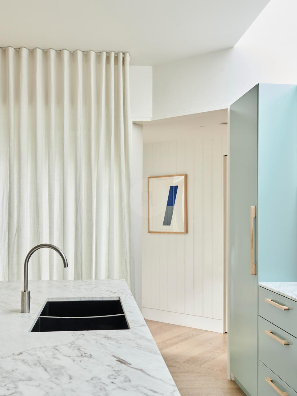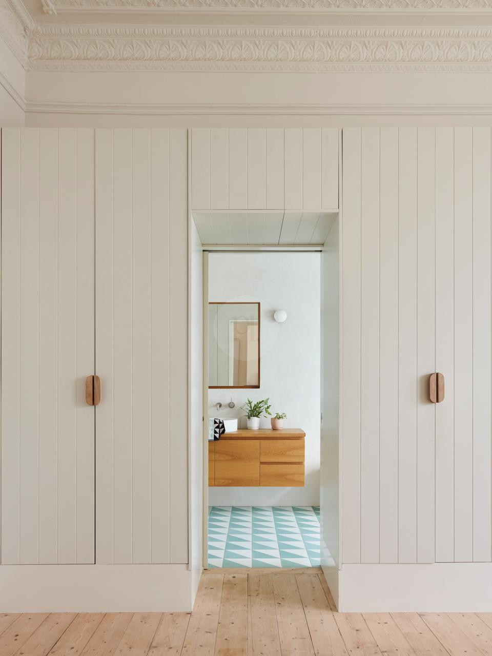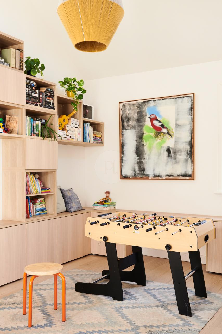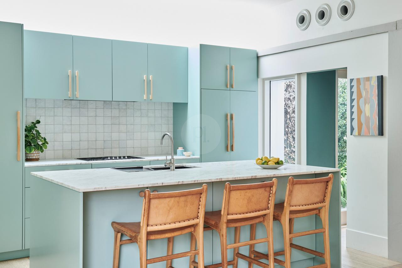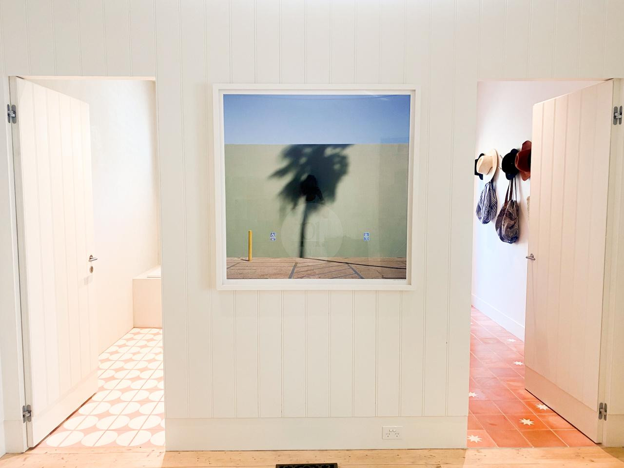 The pastel green coloured kitchen and butler’s pantry add unique pops of colour, ideal for vibrant lifestyle or culinary shoots. Bathrooms with patterned statement tiles and clever hidden storage in the gallery’s timber panelling further enhance the home’s creative potential.