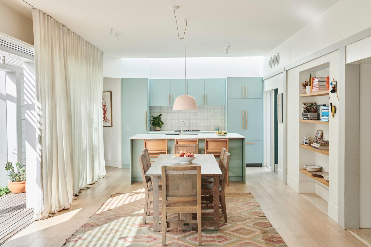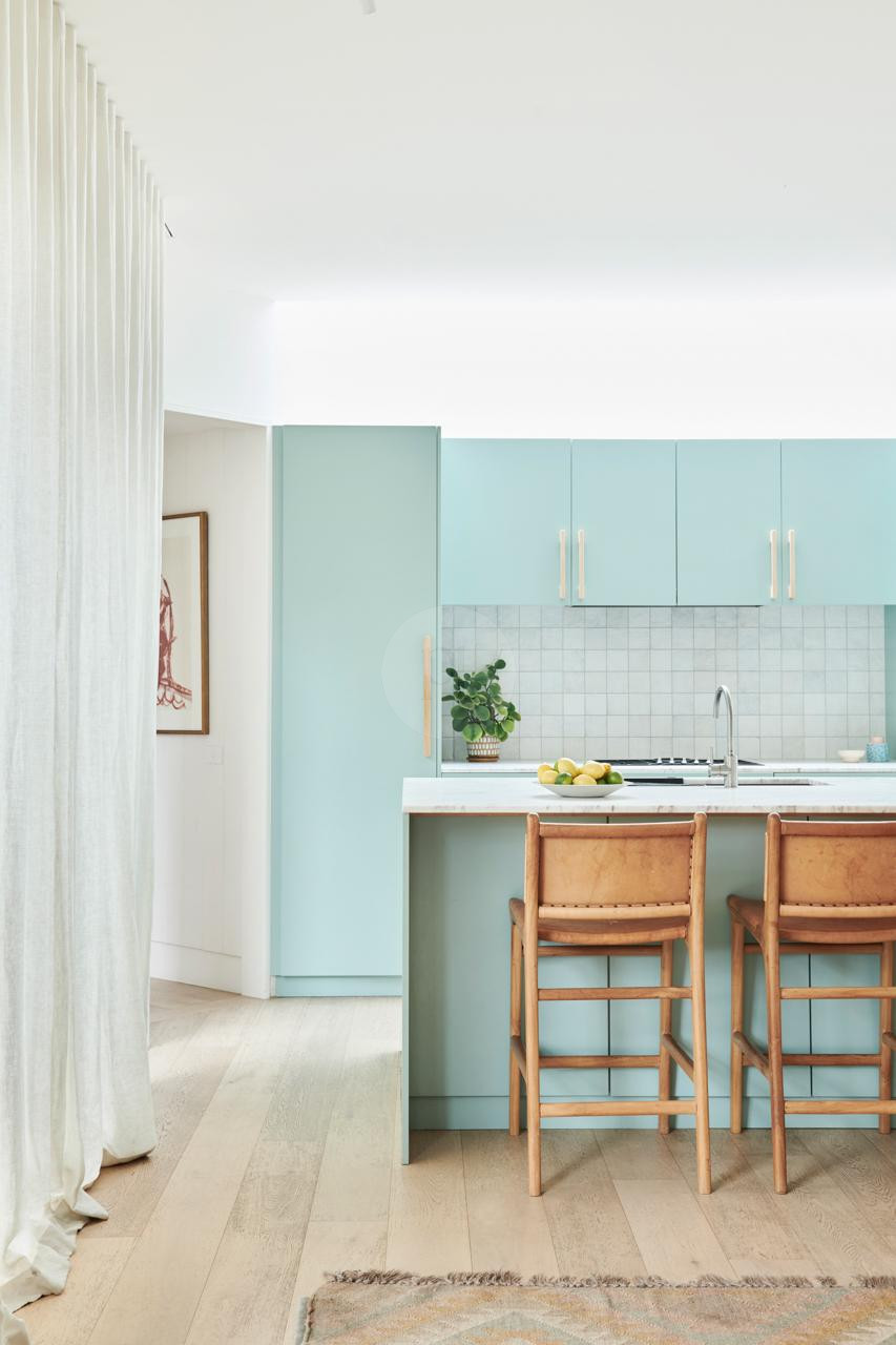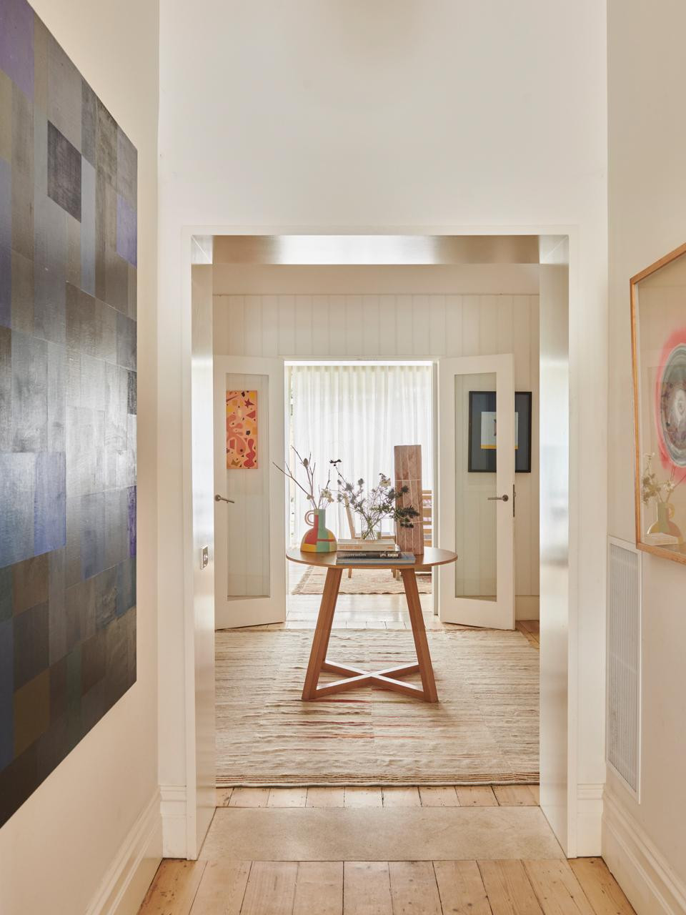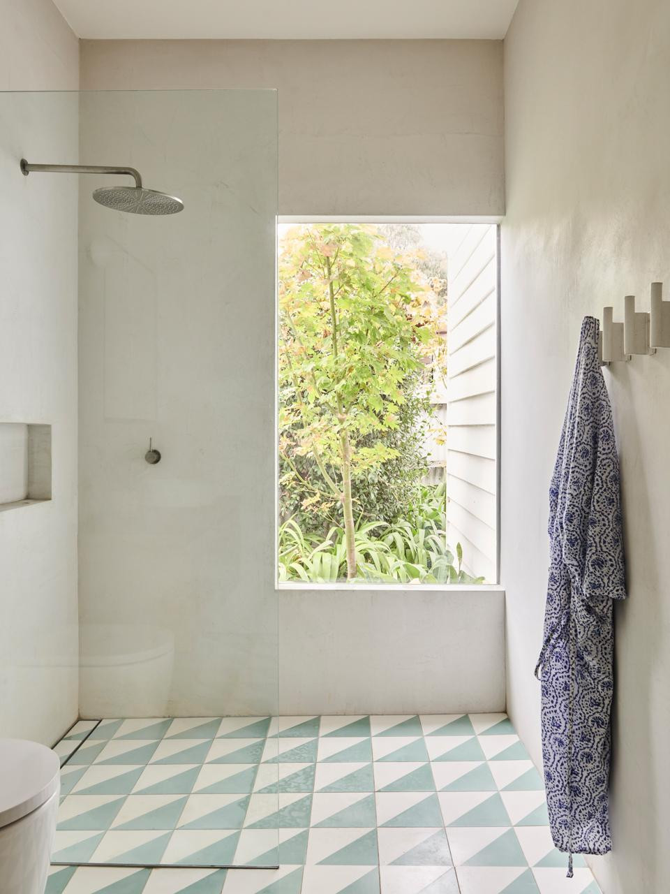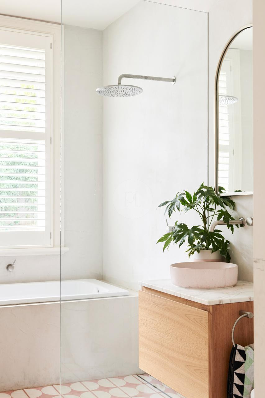 The pastel green coloured kitchen and butler’s pantry add unique pops of colour, ideal for vibrant lifestyle or culinary shoots. Bathrooms with patterned statement tiles and clever hidden storage in the gallery’s timber panelling further enhance the home’s creative potential.