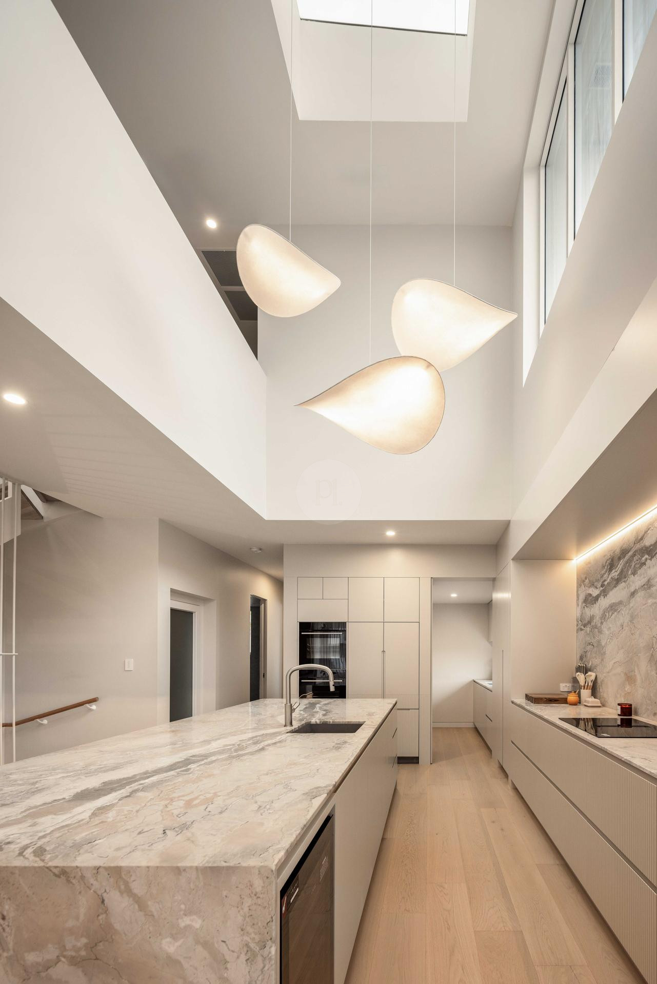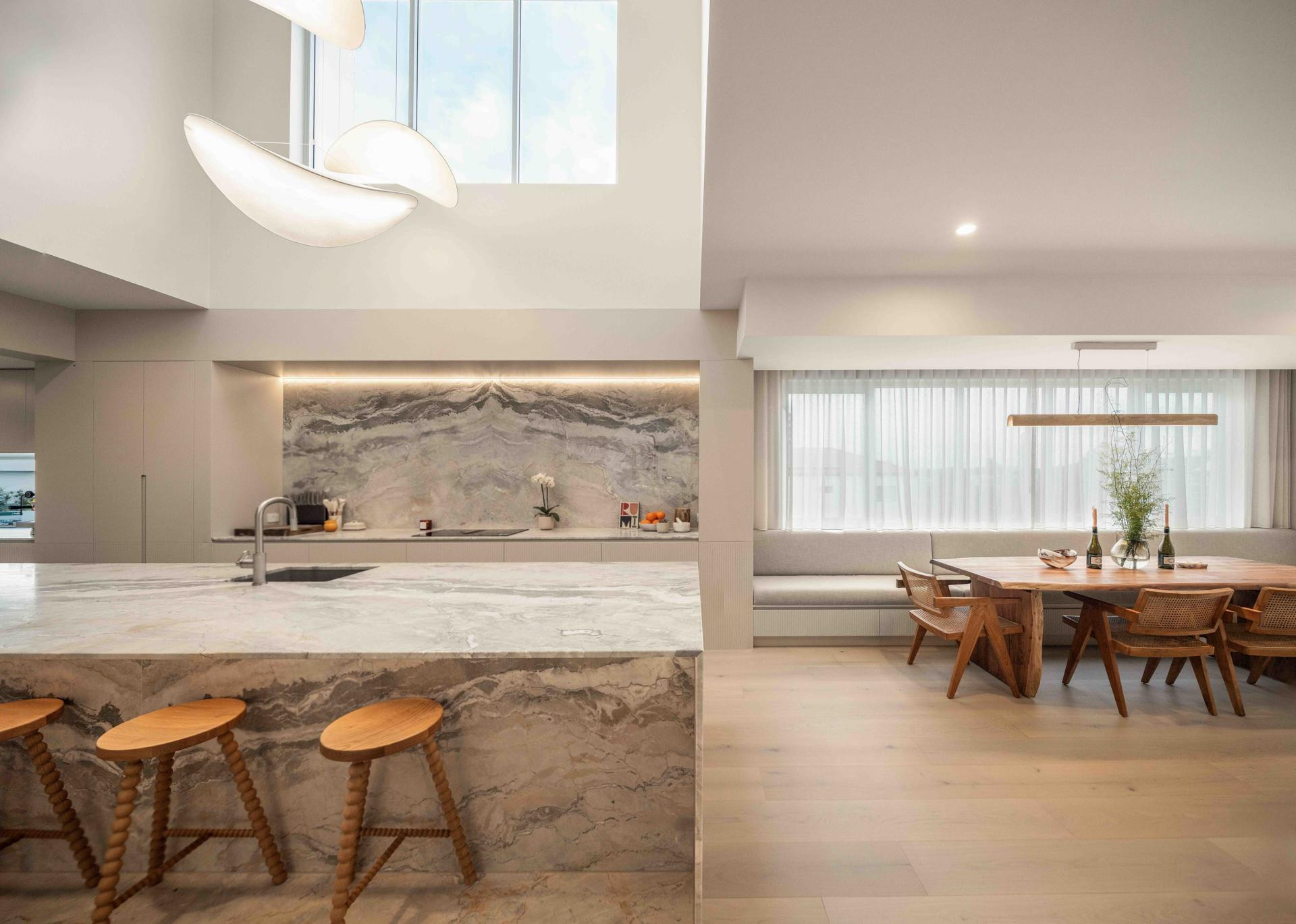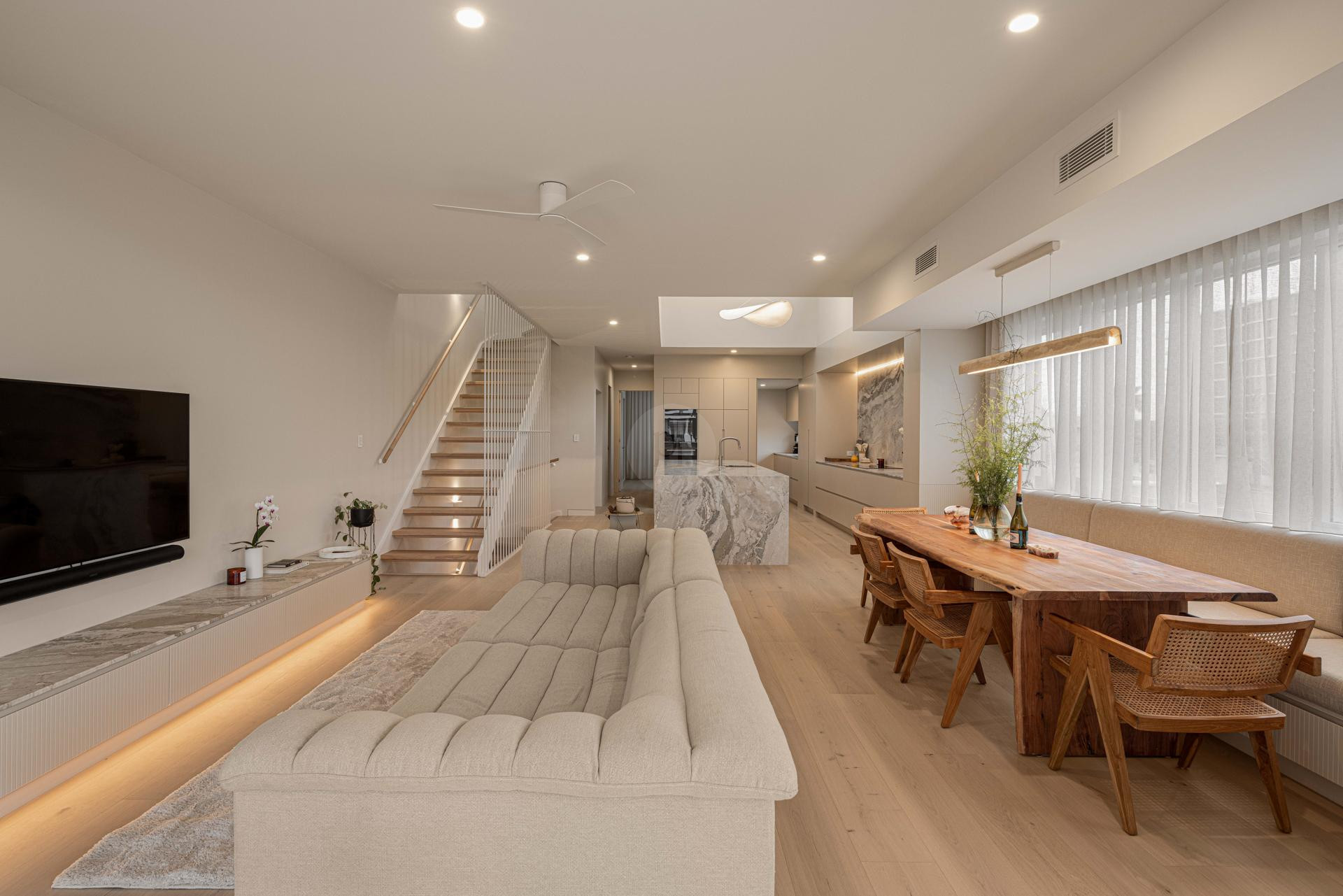 At the heart of the home is a designer kitchen featuring a dramatic four-metre island bench, fully integrated appliances, and a separate butler’s pantry. This space offers a polished and functional backdrop for culinary content, lifestyle campaigns, and editorial shoots.