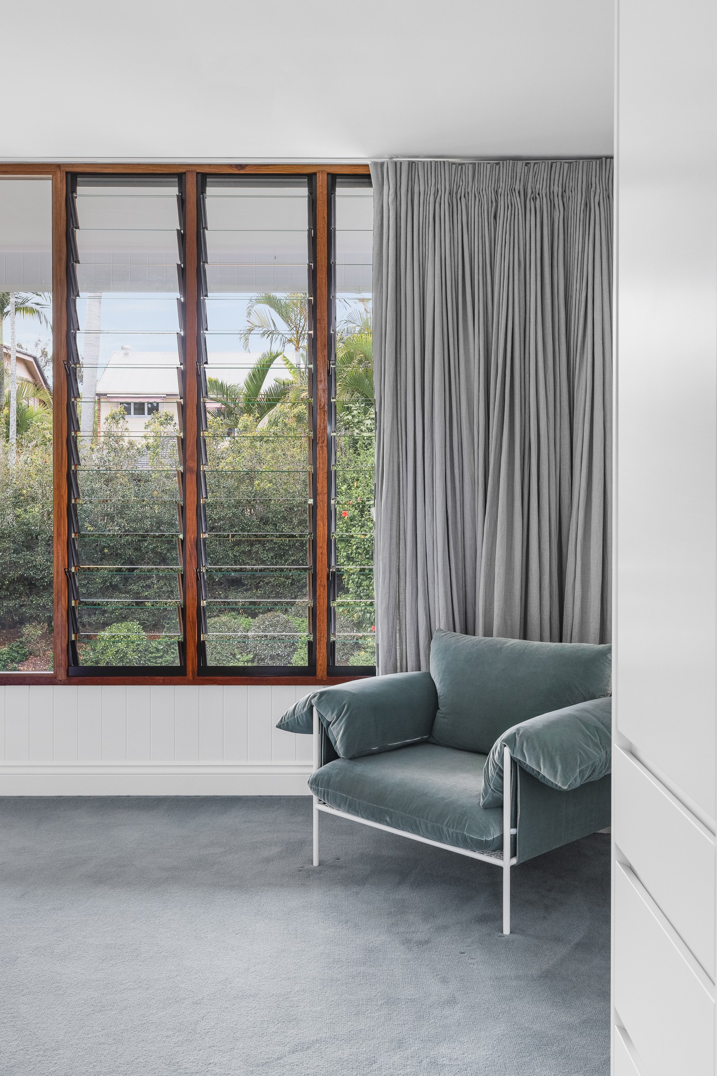 The master bedroom, located on the top level, is a true retreat. With an open plan ensuite and an enormous fixed pane window offering views of the garden and Mt Coot-tha, this space is perfect for capturing intimate moments or luxurious scenes.