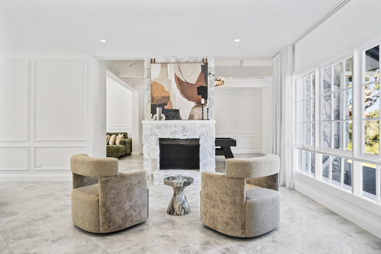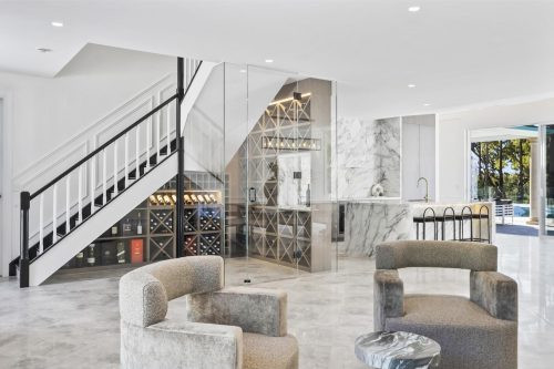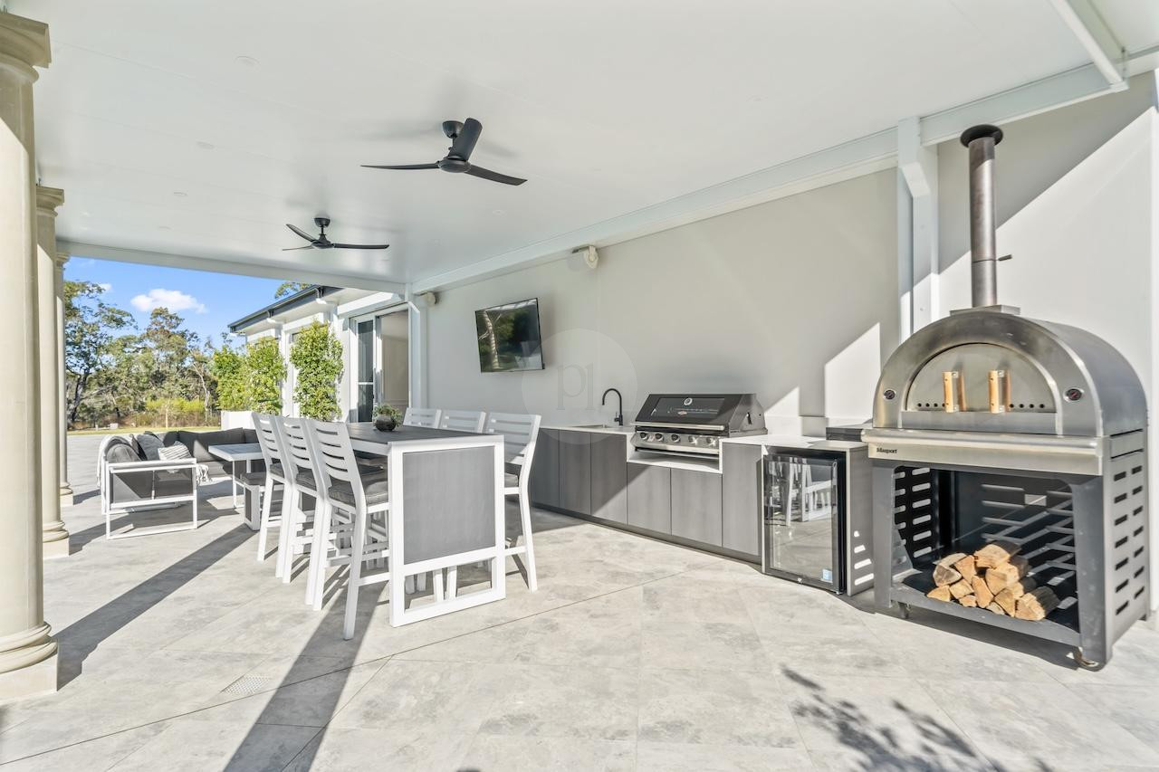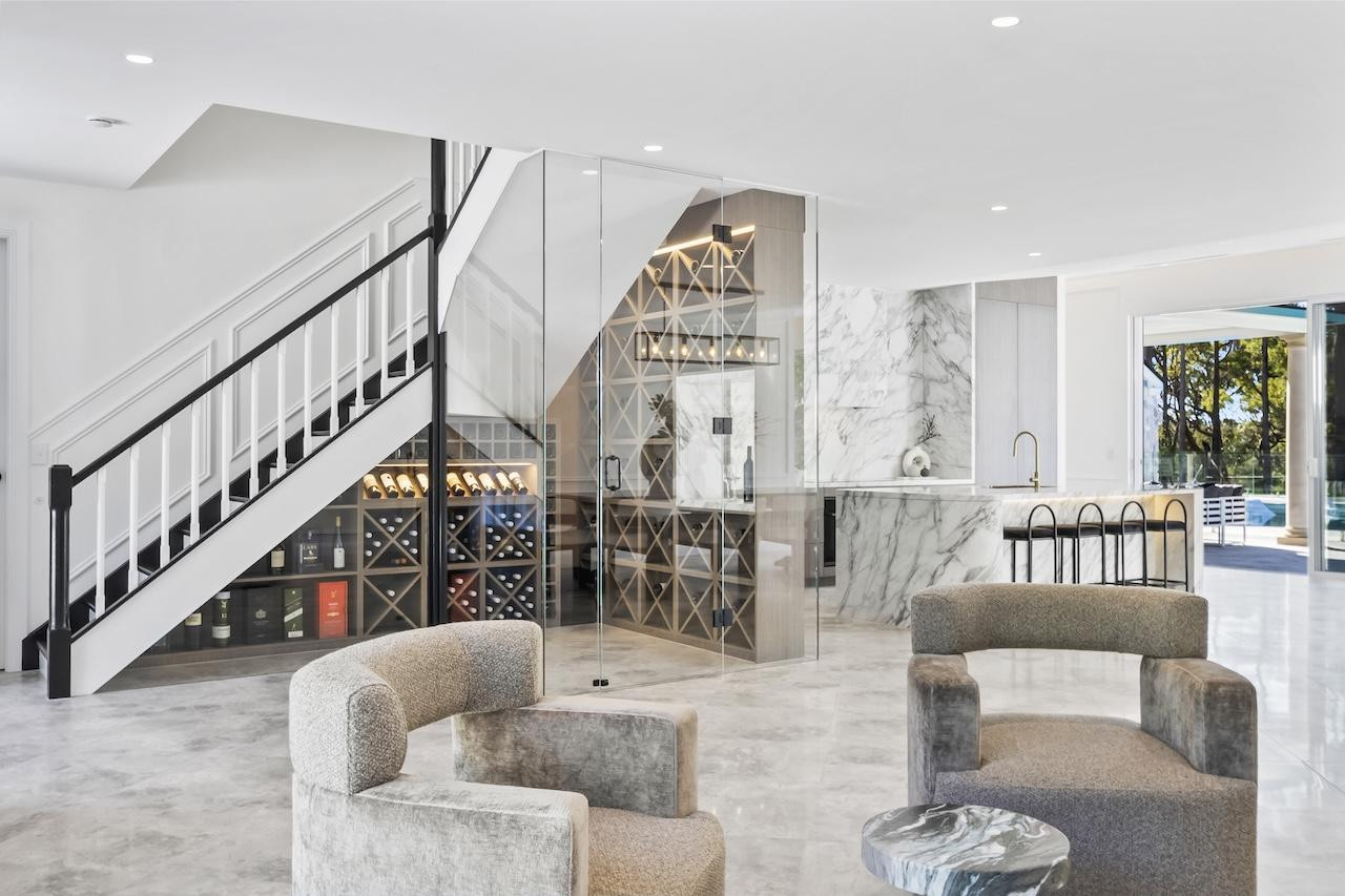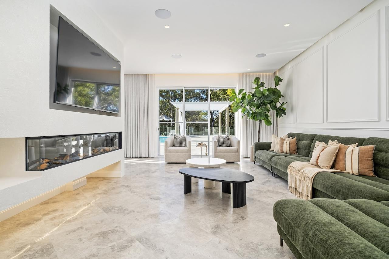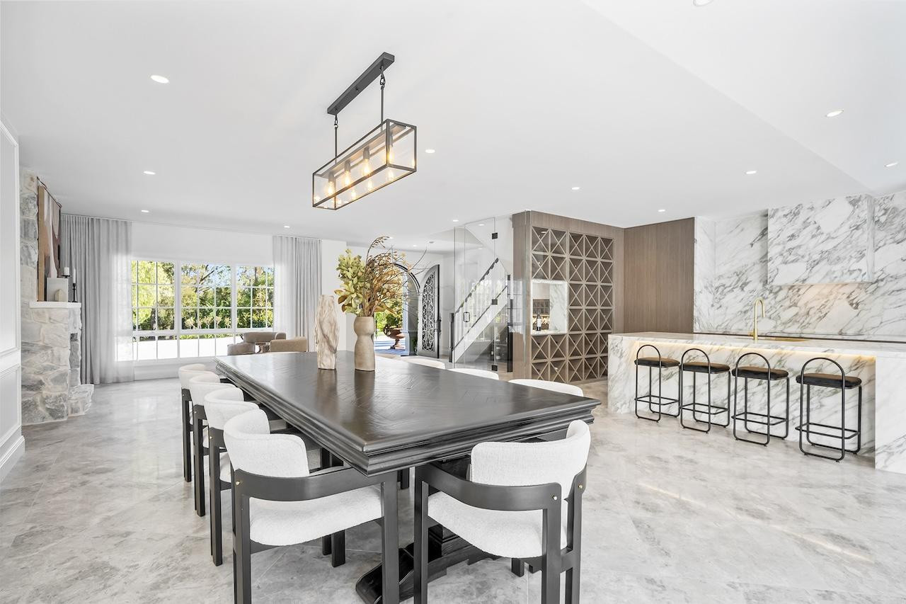 The outdoor area is an entertainer’s oasis, featuring a magnesium saltwater heated pool and a stylish alfresco area. The additional pool pavilion enhances the experience, complete with a cosy fireplace, full bathroom, and integrated fridge/freezer and appliances, providing a perfect backdrop for captivating visuals.