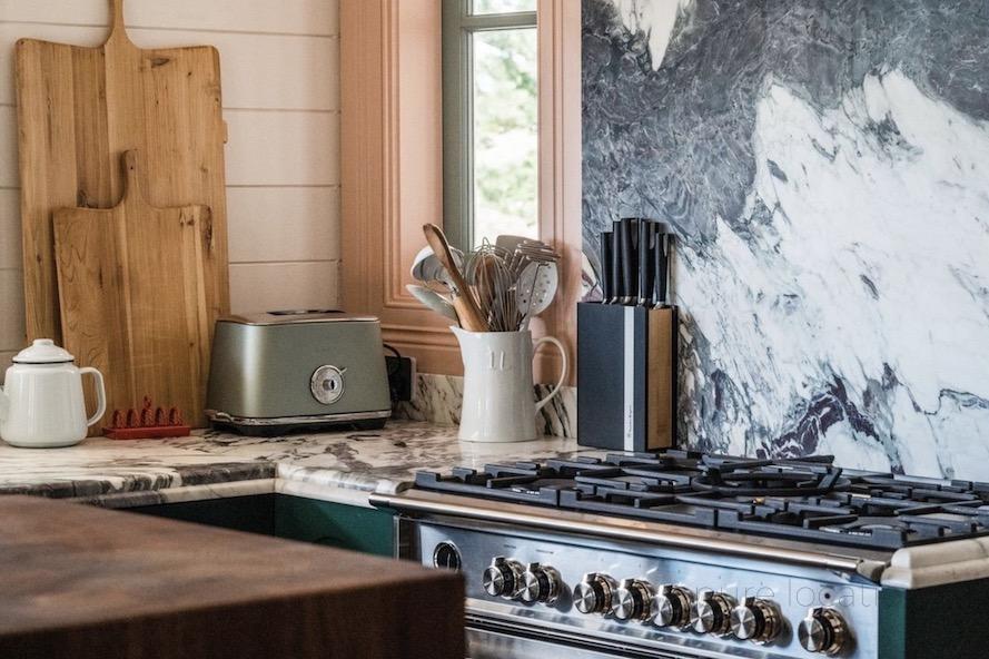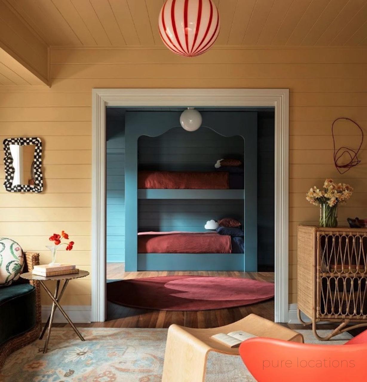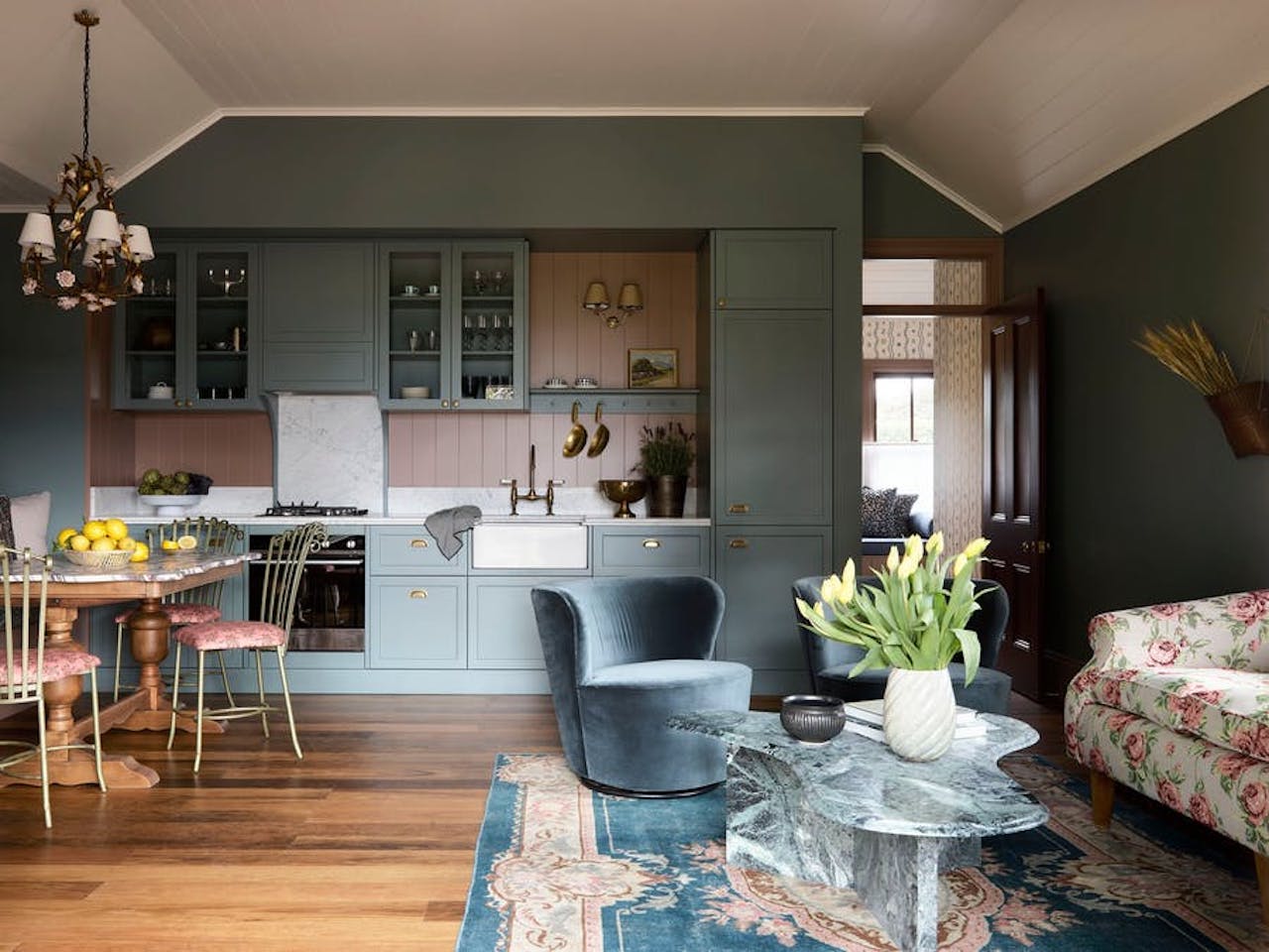 The main homestead is a wonderful blend of charming farmhouse style elevated by playful, whimsical pieces. Featuring four cozy bedrooms that burst with colour and character and a bathroom complete with a bathtub facing a balcony that overlooks the garden, the main homestead creates a warm, inviting atmosphere. The main homestead includes a coloured kitchen with a large farmhouse sink, coloured bespoke cabinetry, marble bench tops and splash back and complete with french doors that open up into the dining room. The living room is a maximalists’ dream, from the unique paintwork on the fireplace, to the multitude of vintage finds, vibrant textiles and quirky decor. To juxtapose the quirkiness of the rest of the house, the homestead also features a tranquil spa room – perfect for hair and makeup.
