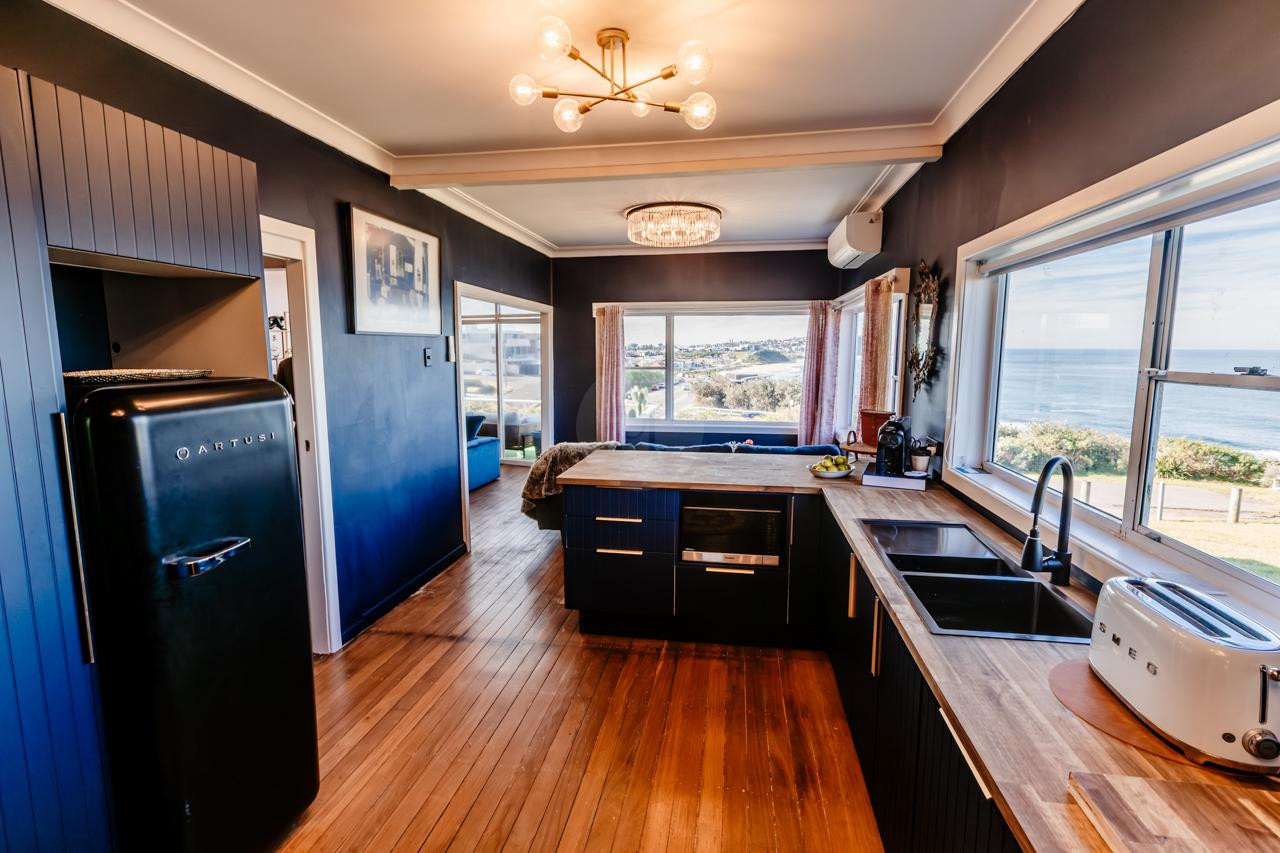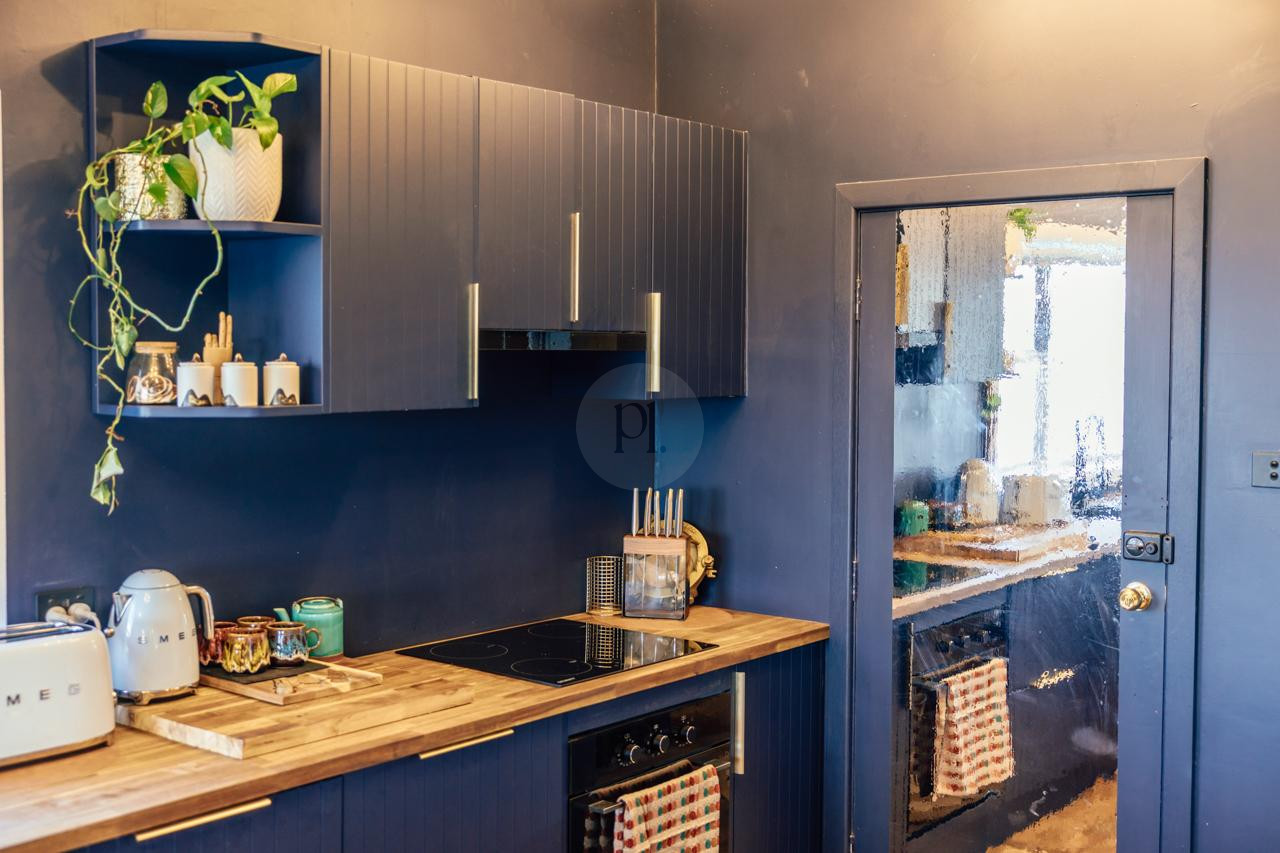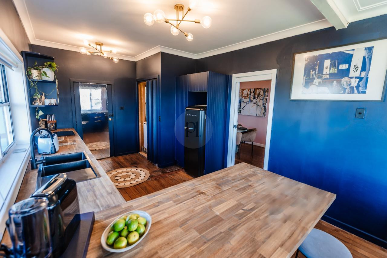 With sweeping waterfront views and an inviting outdoor living space, the single-storey layout includes a spacious balcony perfect for capturing sun-drenched coastal moments. Inside, the bold, retro navy-accented coloured kitchen offers a nostalgic yet modern setting ideal for lifestyle or culinary shoots. The living room, styled with plush velvet couches, exudes warmth and personality, allowing for relaxed, visually rich scenes.