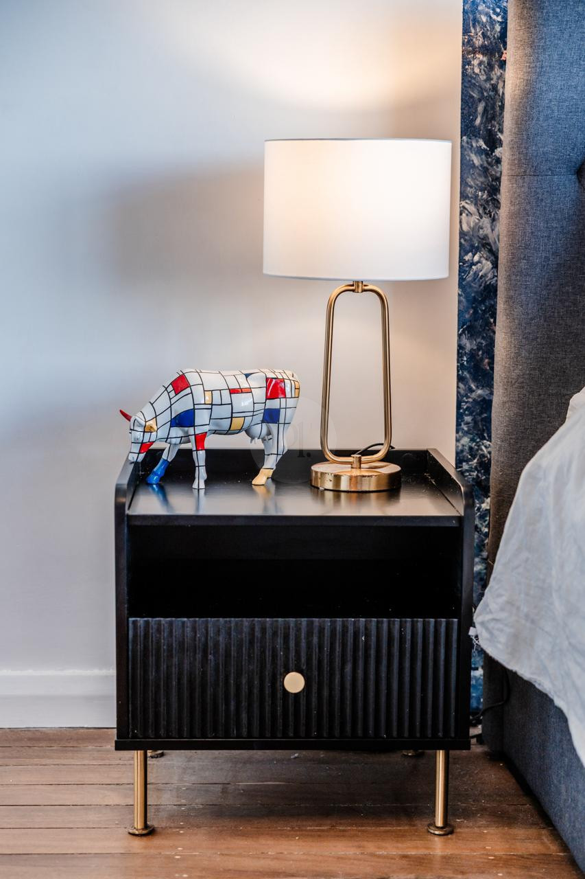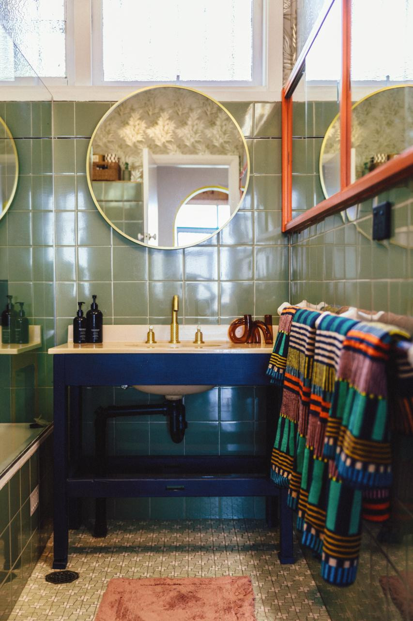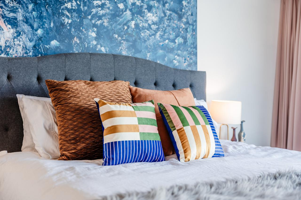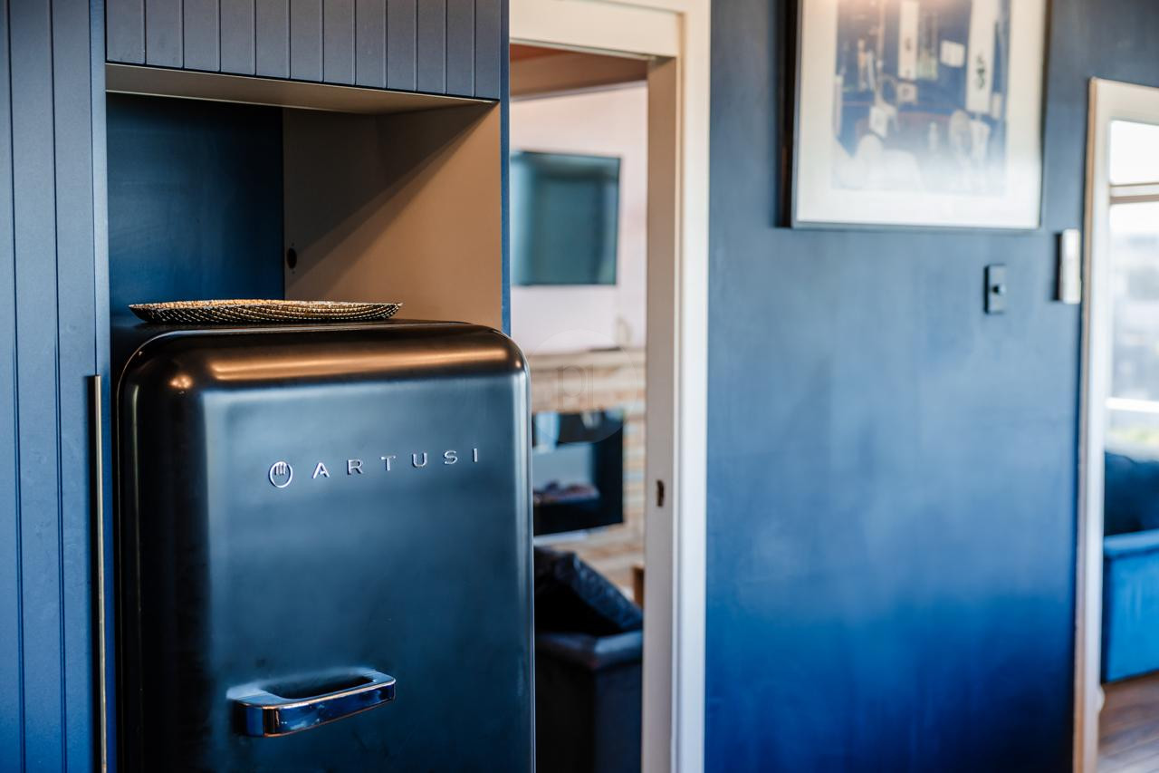 With sweeping waterfront views and an inviting outdoor living space, the single-storey layout includes a spacious balcony perfect for capturing sun-drenched coastal moments. Inside, the bold, retro navy-accented coloured kitchen offers a nostalgic yet modern setting ideal for lifestyle or culinary shoots. The living room, styled with plush velvet couches, exudes warmth and personality, allowing for relaxed, visually rich scenes.