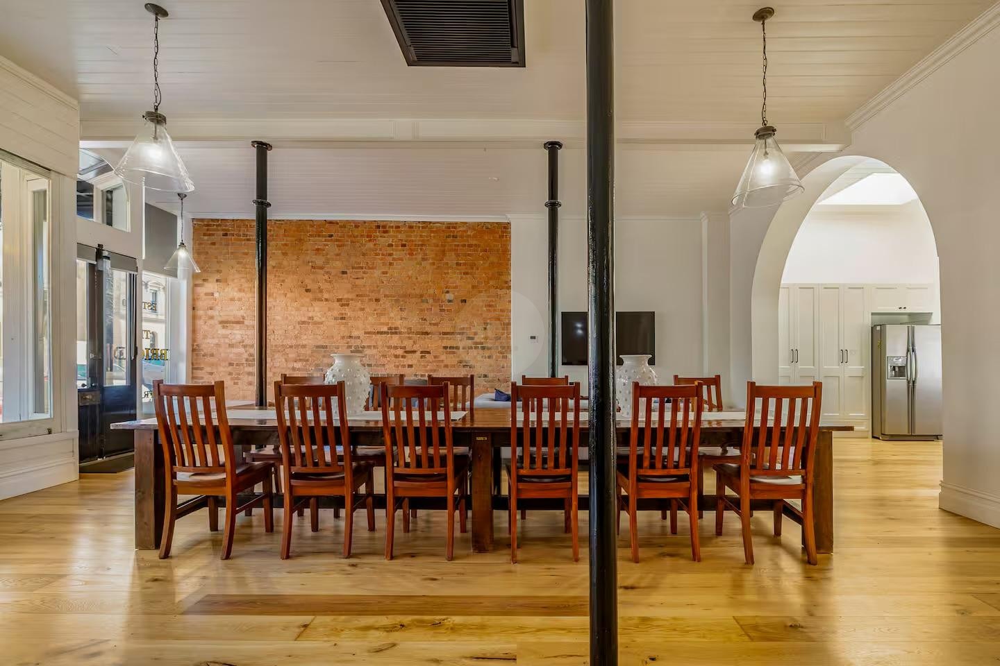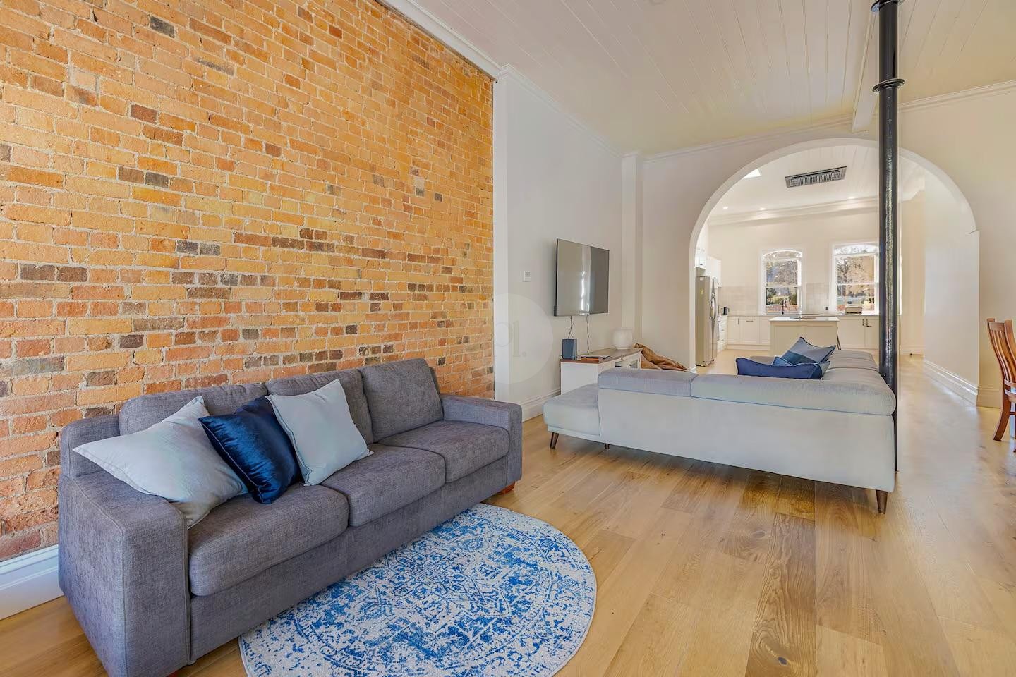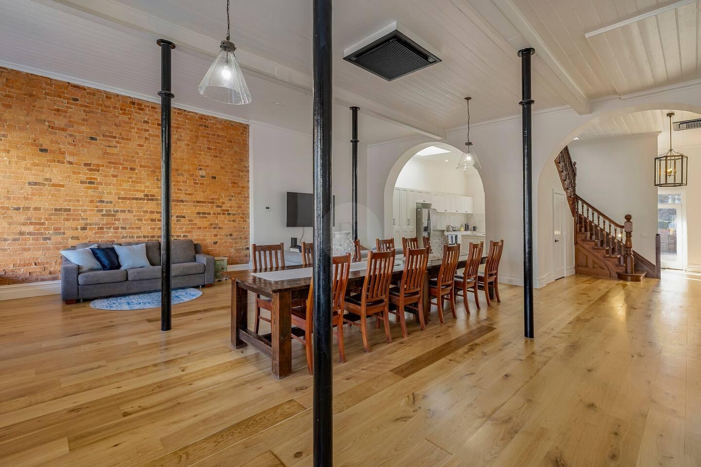 Inside, high ceilings and fine craftsmanship set the tone, with original features including handmade brick walls, heritage lacework, and an elegant staircase that brings character to every frame. Federation-style details are complemented by spacious living and dining areas, multiple bedrooms and bathrooms, and a well-equipped kitchen designed for both practicality and style. Skylights flood the interiors with natural light, enhancing the warm, inviting atmosphere.