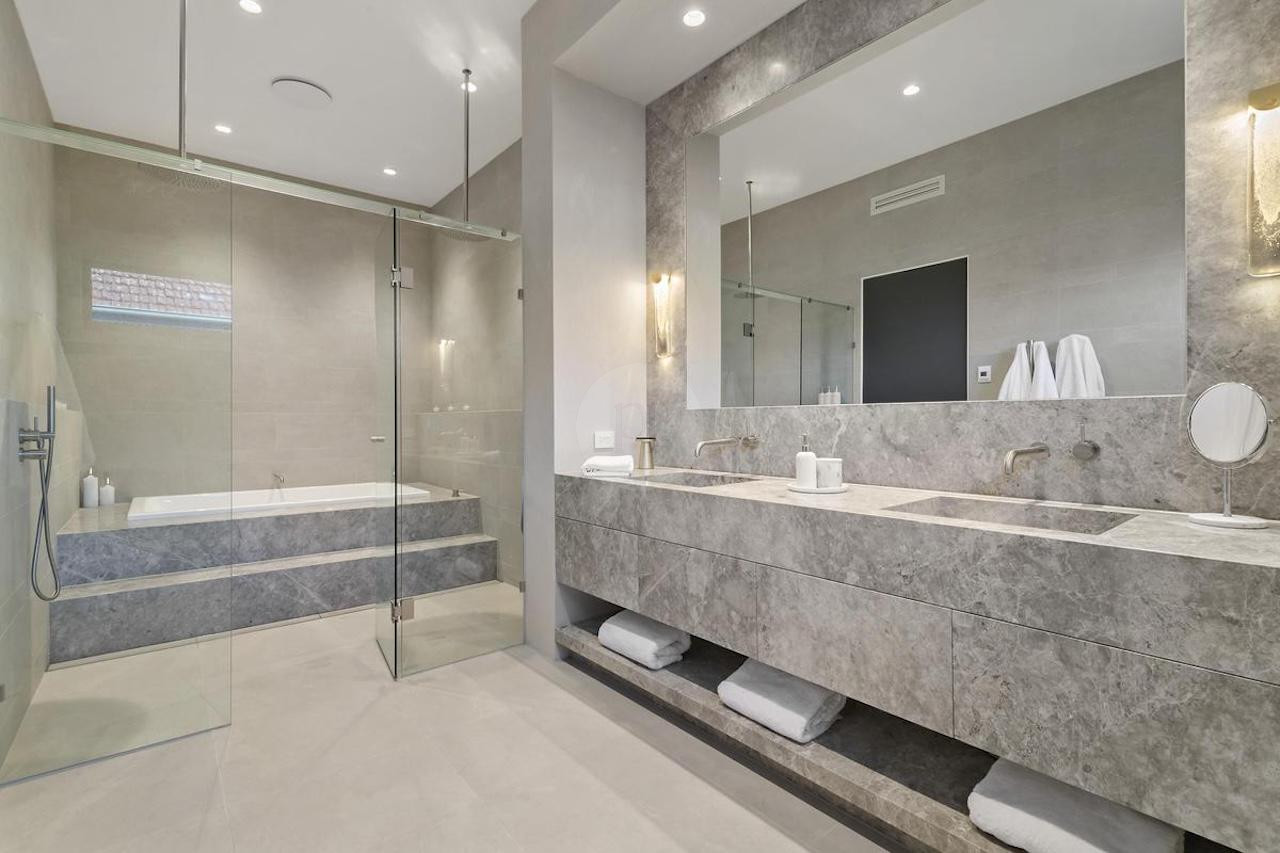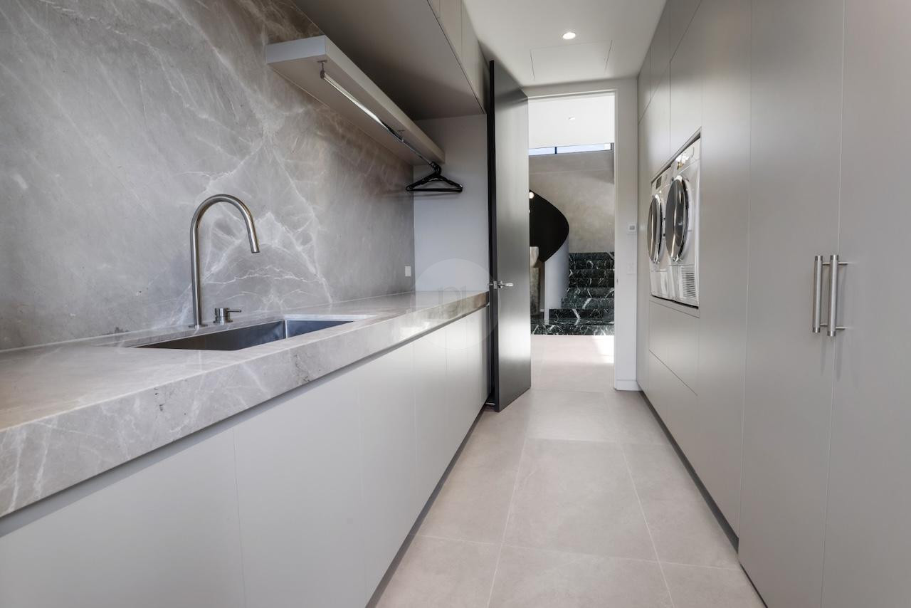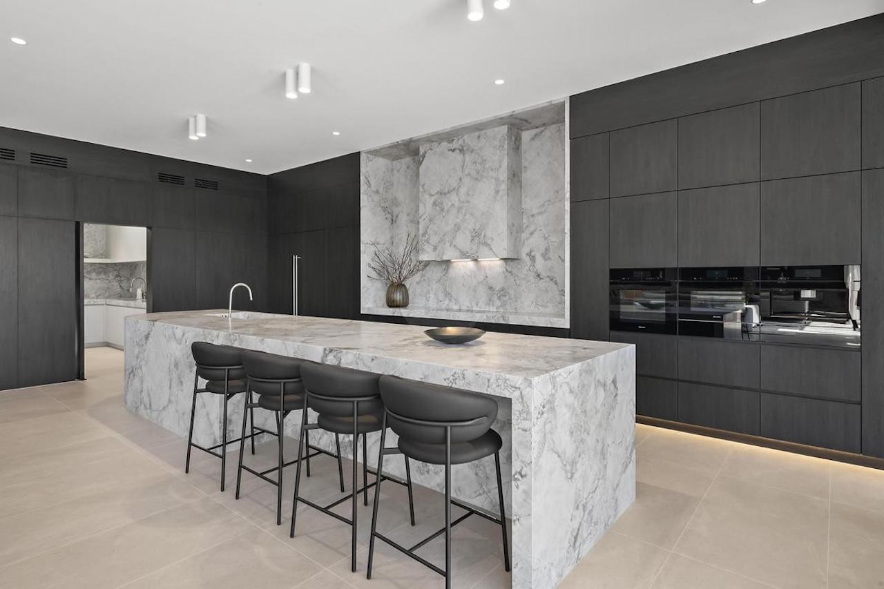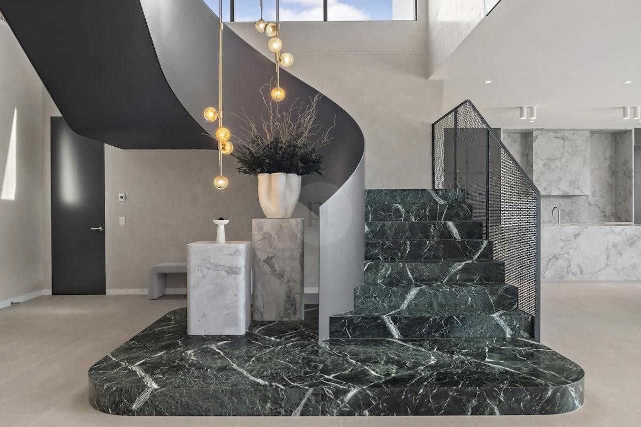 Step inside to discover expansive living spaces adorned with layered natural stone and polished marble. The interiors are bathed in natural light thanks to large windows that seamlessly connect to beautifully landscaped outdoor areas. The colour palette showcases brushed metals, striking marble, strong neutrals, and textured wall treatments, all contributing to a minimalist elegance that will leave a lasting impression.