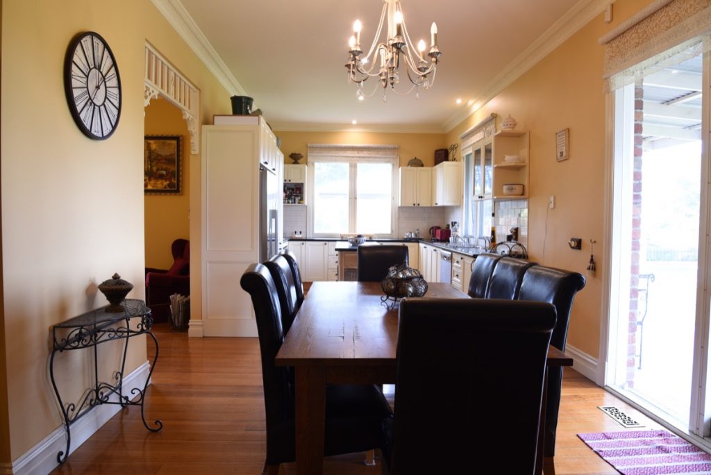 As you enter the premises, you are greeted by a grand driveway leading up to the house, surrounded by acres of lush greenery. The Federation style home boasts jarrah verandahs, genuine hardwood timber floors, and high ceilings, exuding a timeless elegance.
