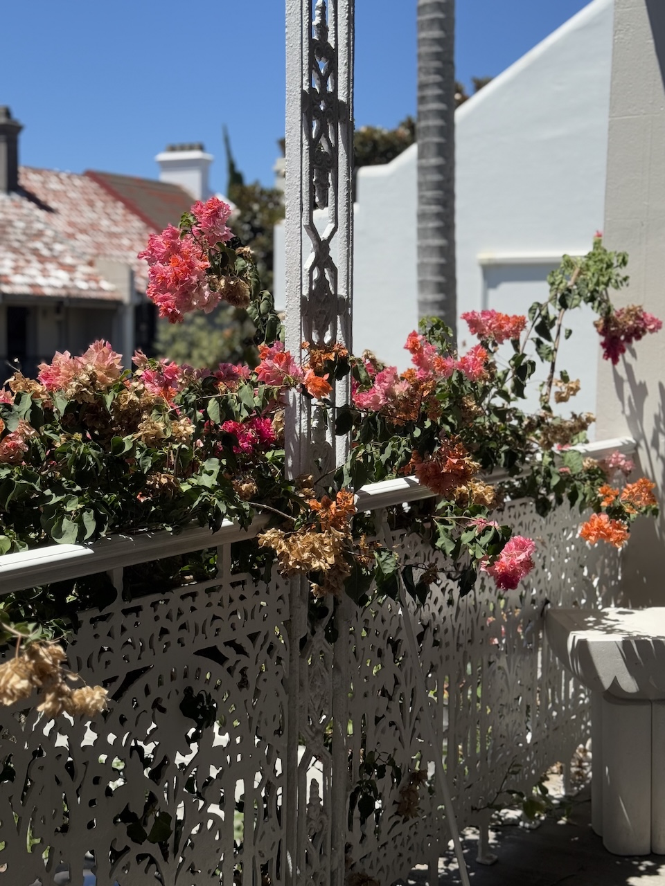 There is a romantic balcony off the main bedroom facing the front of the house. Filled with foliage and flowers, the balcony is a beautiful setting for a fashion shoot.