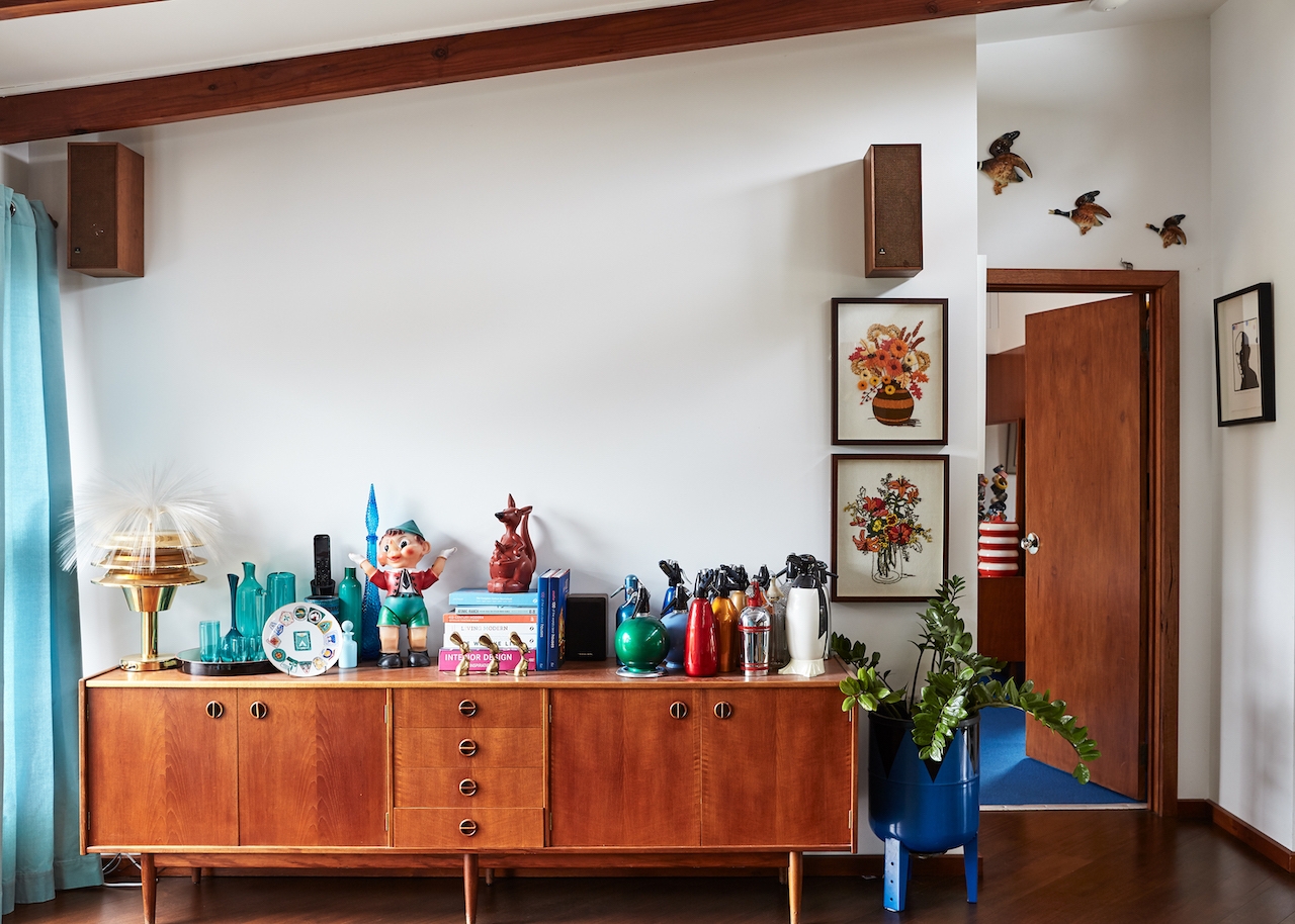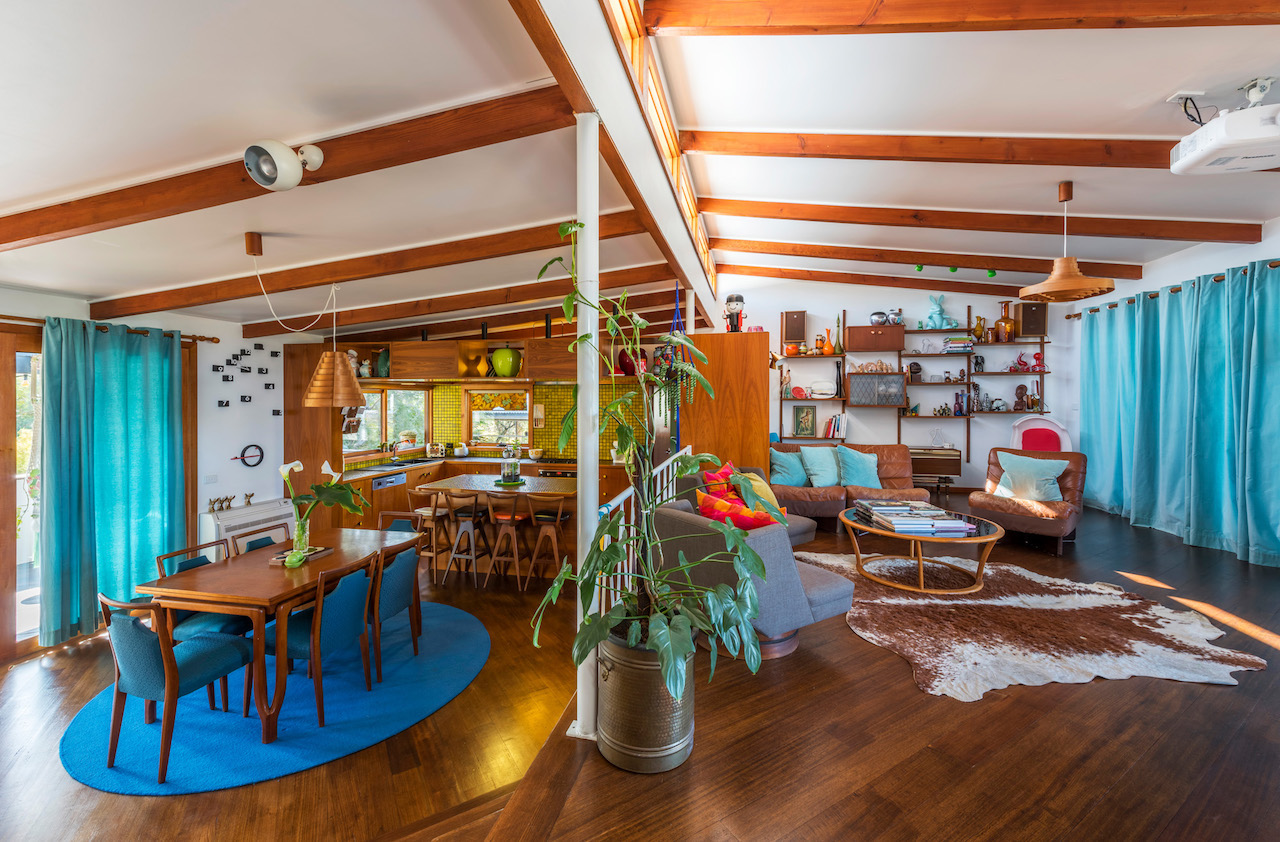 This classic 1961 home is a perfect example of mid-century modern design. Renovated to appear to be completely original, the home features vintage fixtures and finishes and is furnished with era-specific items. The location is full of bright colour and vivid designs. The home is elevated and split level, with clerestory windows and lots of timber. The garden has also received a retro renovation and features Australian native plants front and back.