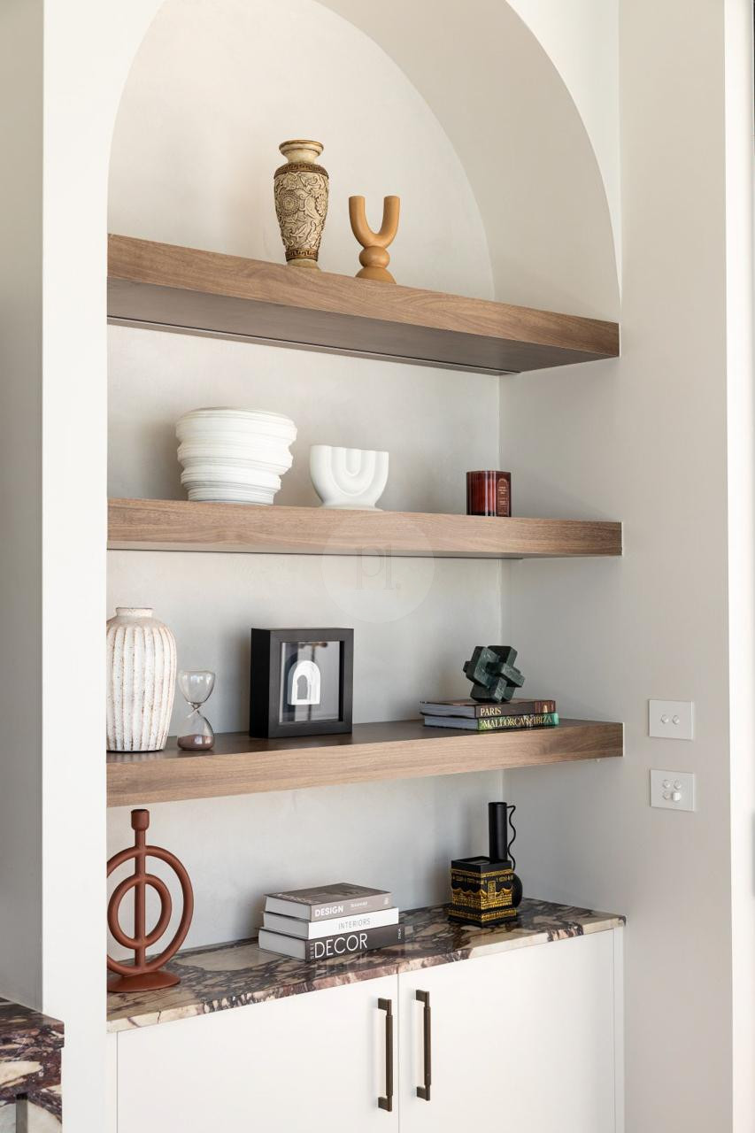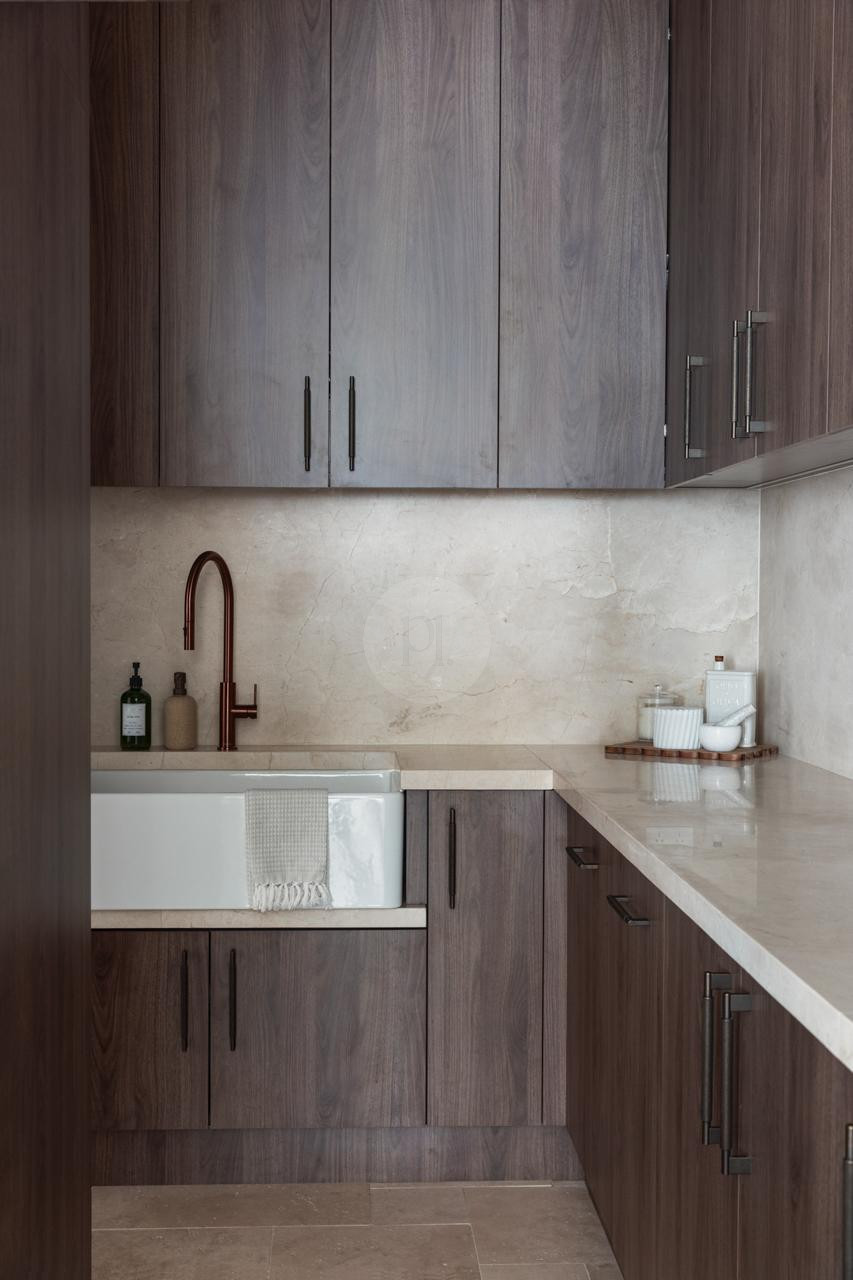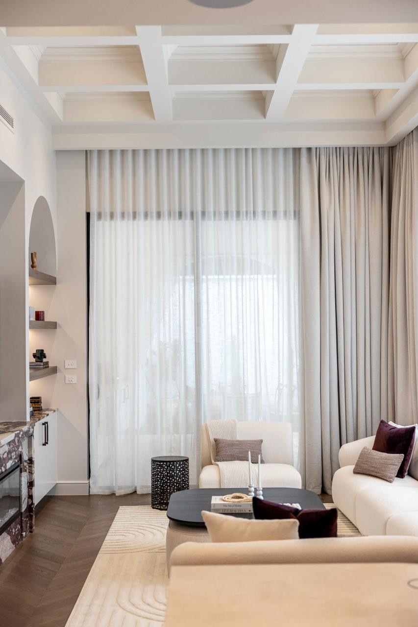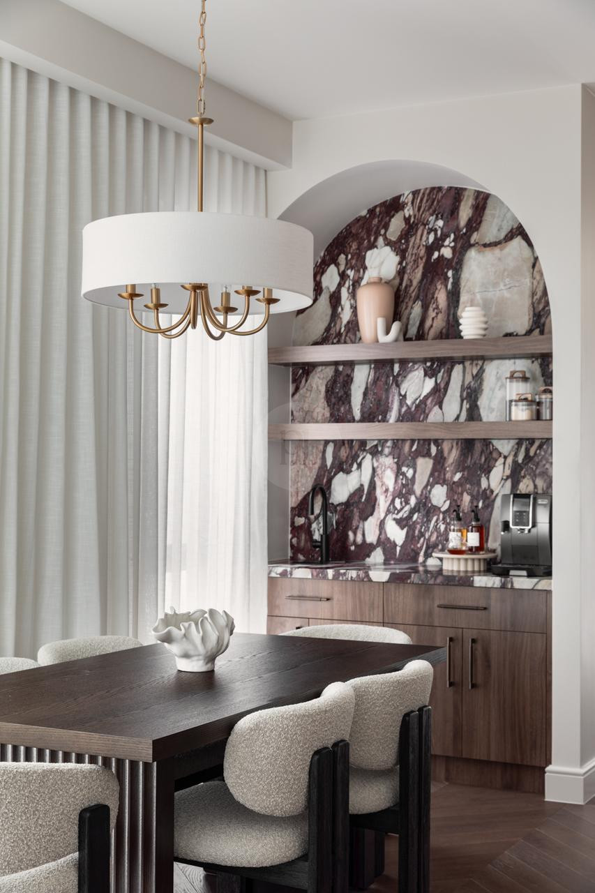 Inside, the residence showcases exquisite walnut cabinetry, natural stone benchtops, and a dedicated coffee bar finished in striking Arabescato Viola stone. The open-plan living area is anchored by a coffered ceiling and stone fireplace, styled with contemporary furnishings to create a polished yet inviting atmosphere. Neutral tones throughout provide a versatile, shoot-ready canvas suited to fashion, lifestyle, interiors, food, and brand storytelling.