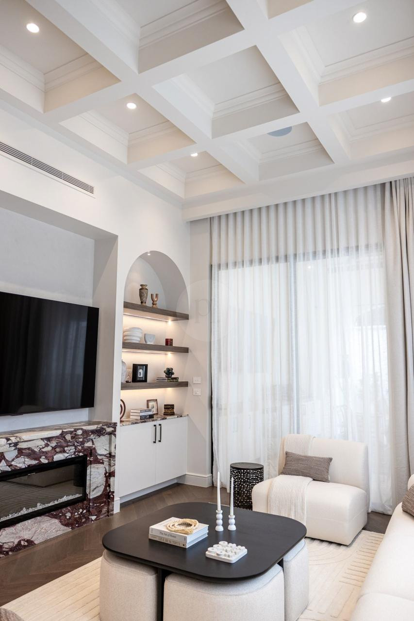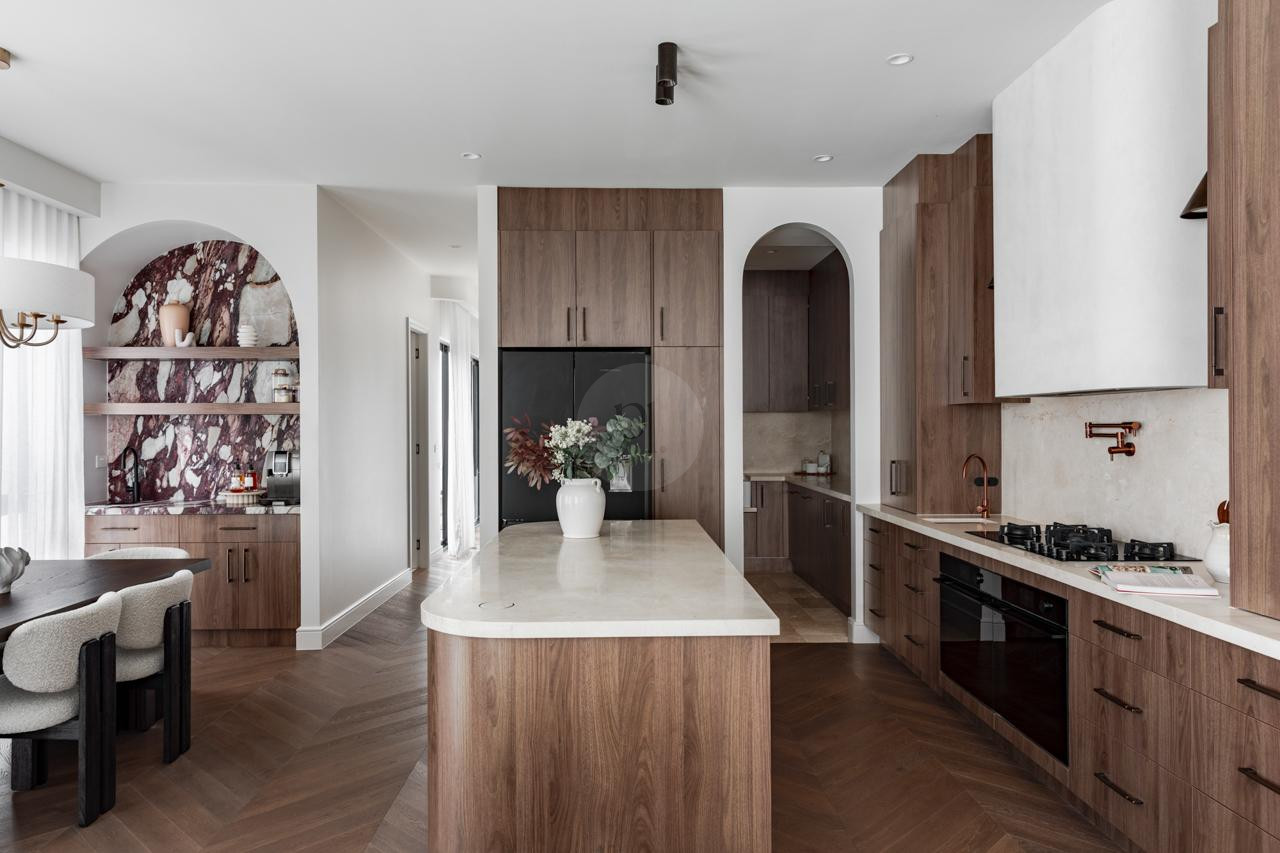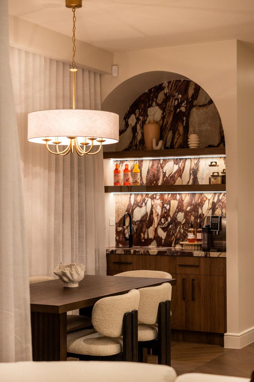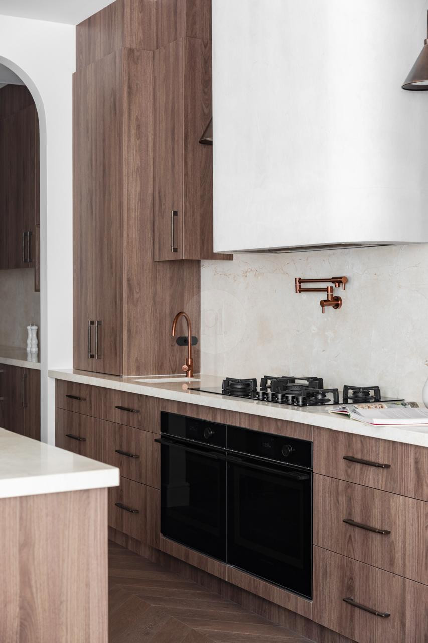 Inside, the residence showcases exquisite walnut cabinetry, natural stone benchtops, and a dedicated coffee bar finished in striking Arabescato Viola stone. The open-plan living area is anchored by a coffered ceiling and stone fireplace, styled with contemporary furnishings to create a polished yet inviting atmosphere. Neutral tones throughout provide a versatile, shoot-ready canvas suited to fashion, lifestyle, interiors, food, and brand storytelling.