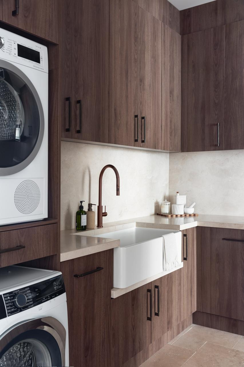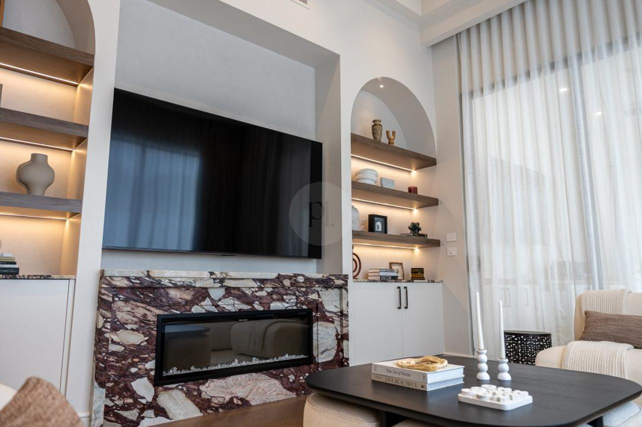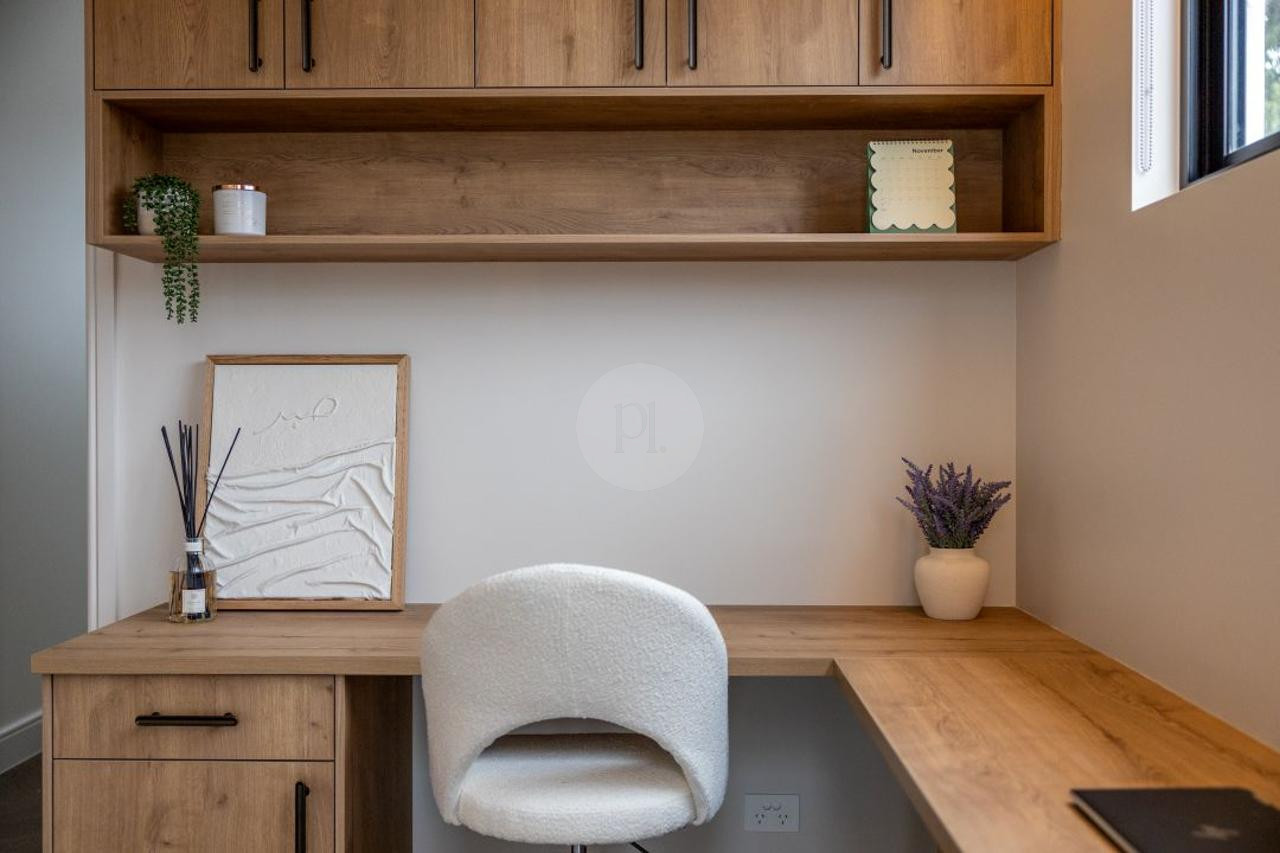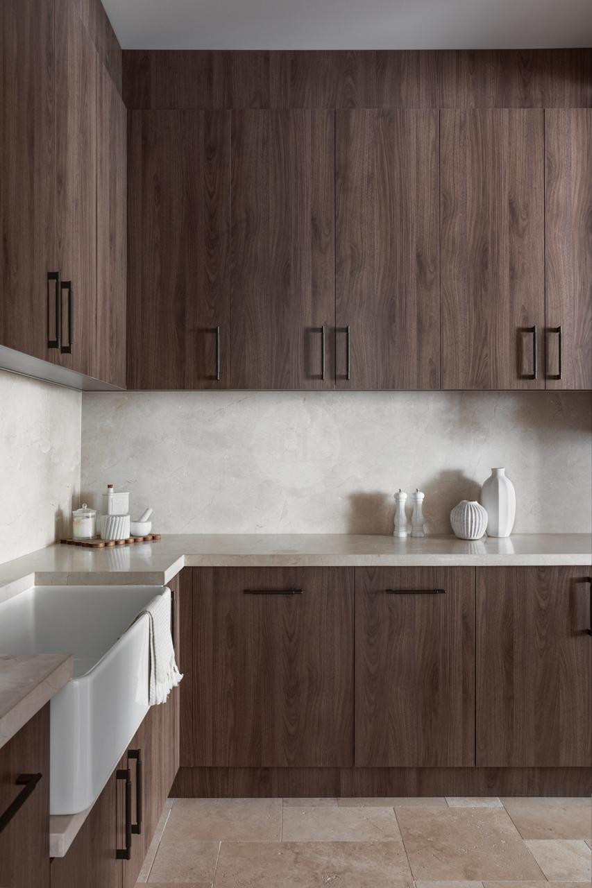 Inside, the residence showcases exquisite walnut cabinetry, natural stone benchtops, and a dedicated coffee bar finished in striking Arabescato Viola stone. The open-plan living area is anchored by a coffered ceiling and stone fireplace, styled with contemporary furnishings to create a polished yet inviting atmosphere. Neutral tones throughout provide a versatile, shoot-ready canvas suited to fashion, lifestyle, interiors, food, and brand storytelling.