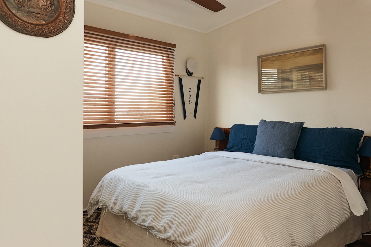 The home’s exterior is just as captivating, with its classic blue and white facade standing out against the backdrop of the beachside setting. The breezeway blocks—an iconic feature of mid-century modern Australian homes—allow for natural airflow and a relaxed, open feel, while the original balustrade and retro rope fence reinforce the home’s vintage character. This thoughtful design ensures the house is not only functional but also visually connected to the coastal lifestyle, allowing for seamless indoor-outdoor living.