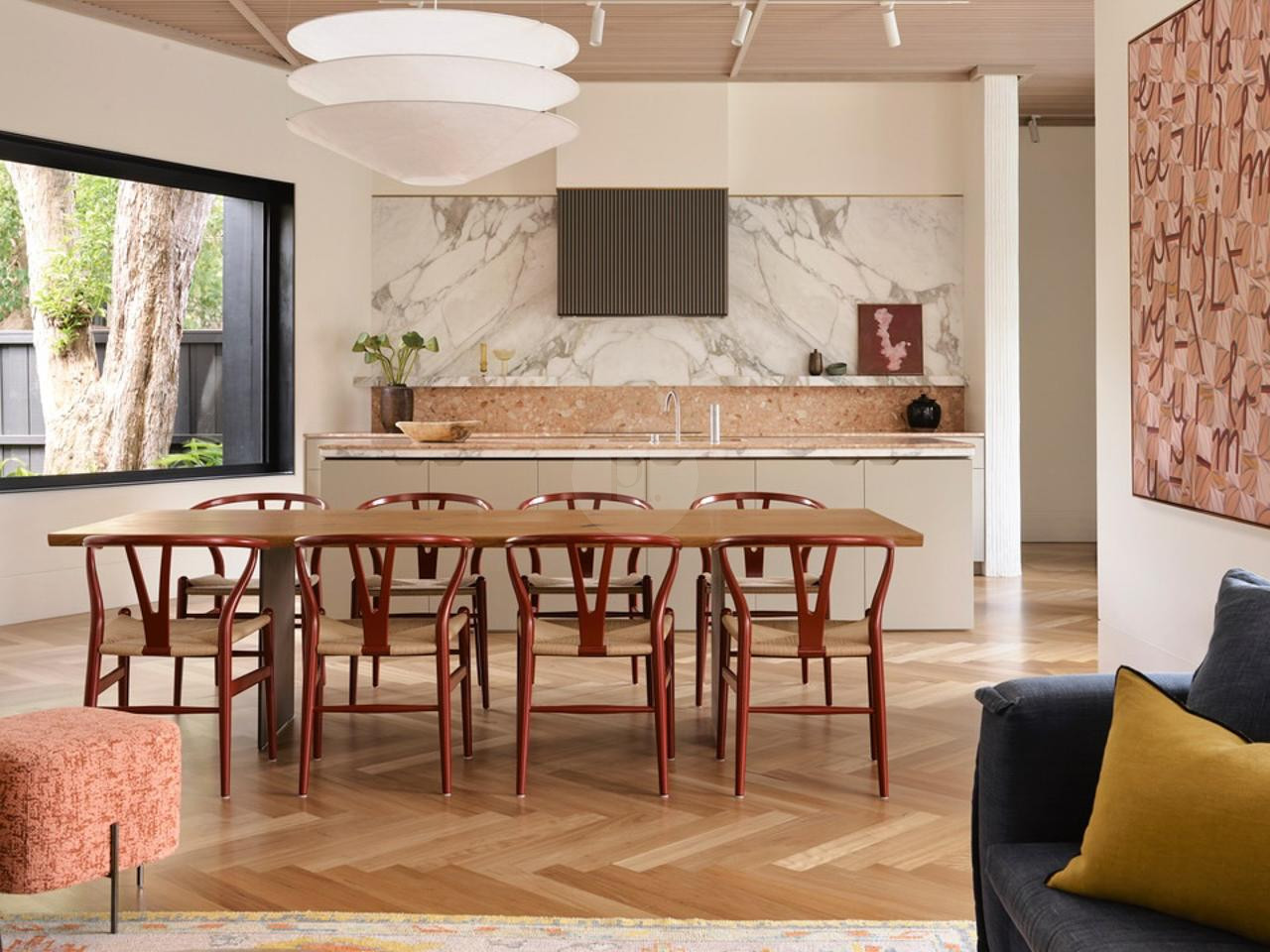 The property features a delightful garden with a pool, offering a tranquil retreat right at your doorstep. The versatile layout includes a children’s bedroom, home office, and a BBQ area, providing ample opportunities for creative shoots. Statement tiles and beautiful herringbone hardwood flooring add a touch of sophistication to the interiors.