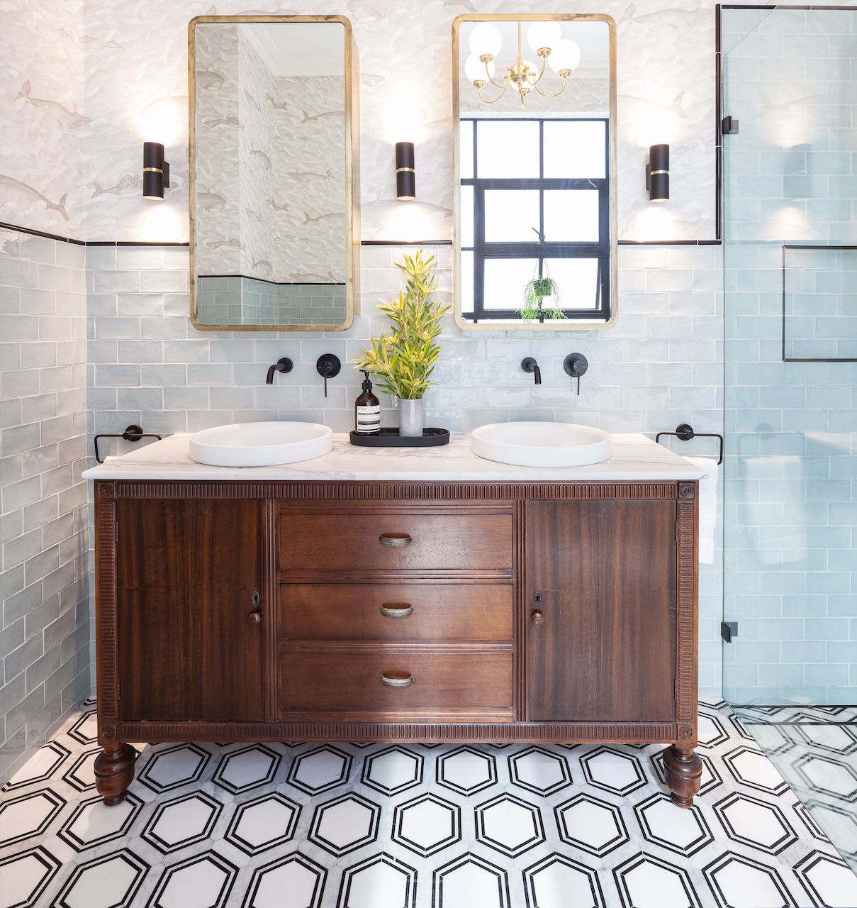 The retro and art deco designs seamlessly blend with the eclectic elements of the property, creating a visual feast for the eyes. The staircase, adorned with statement tiles and wallpaper, adds a touch of nostalgia and glamour to the space.