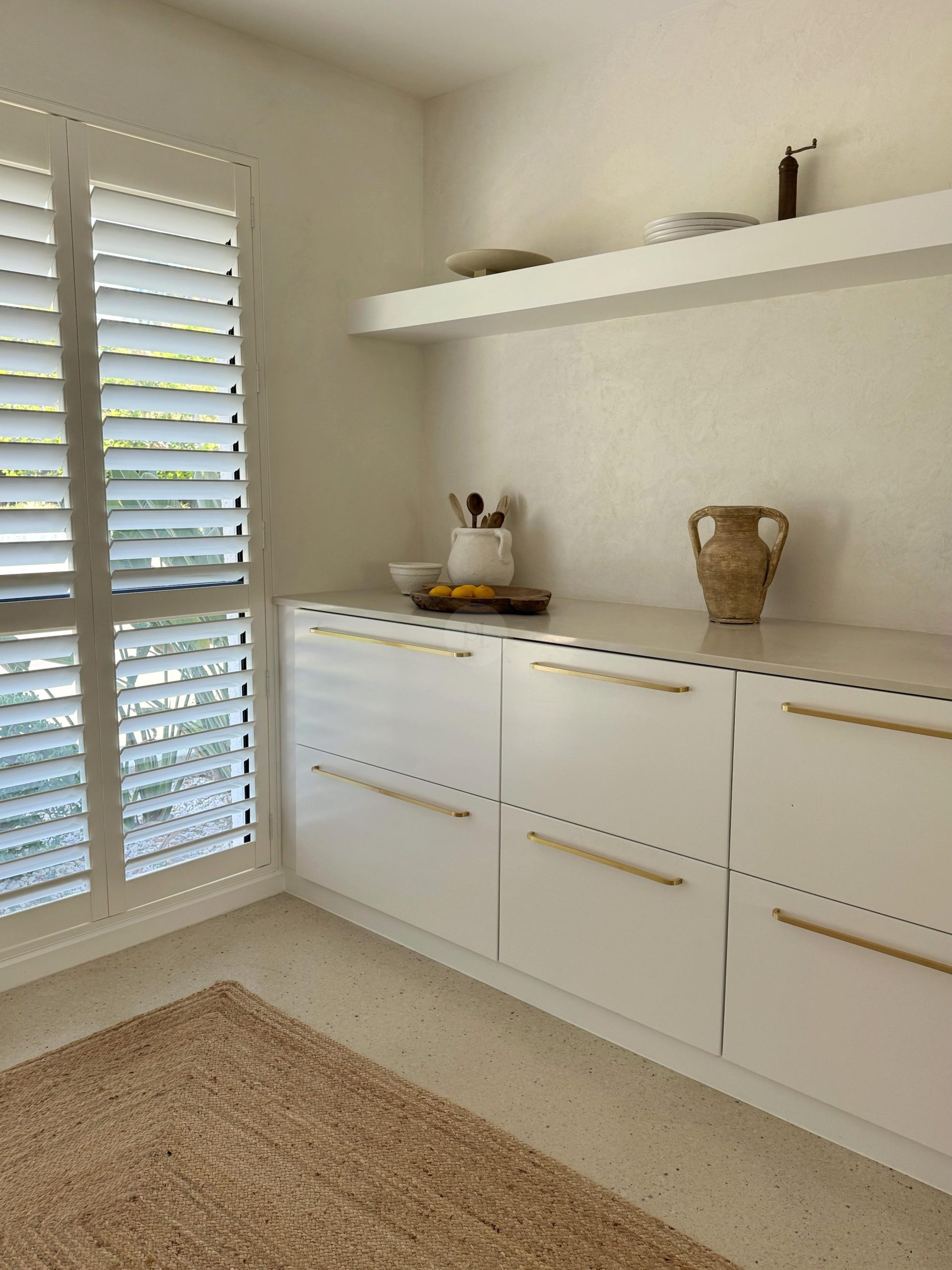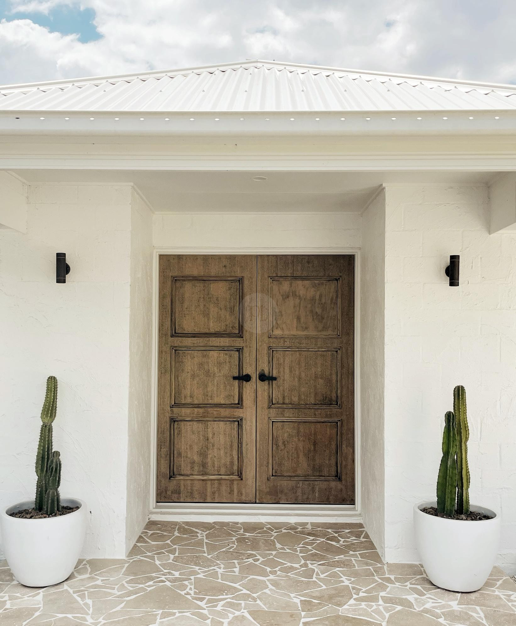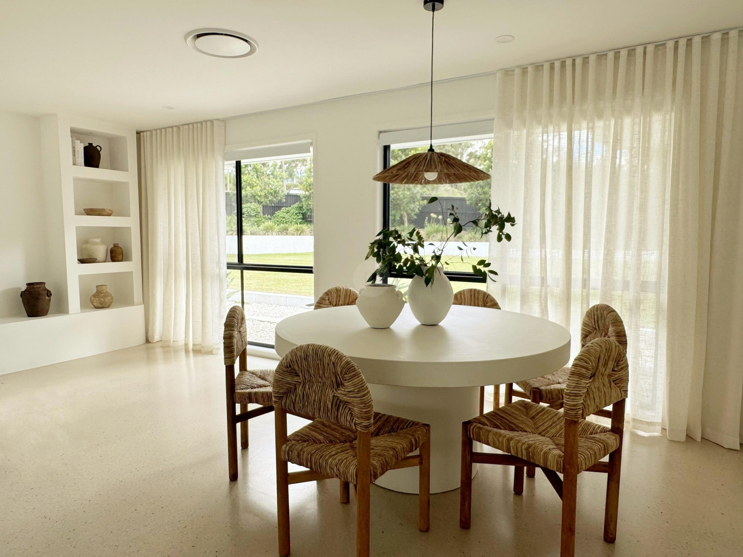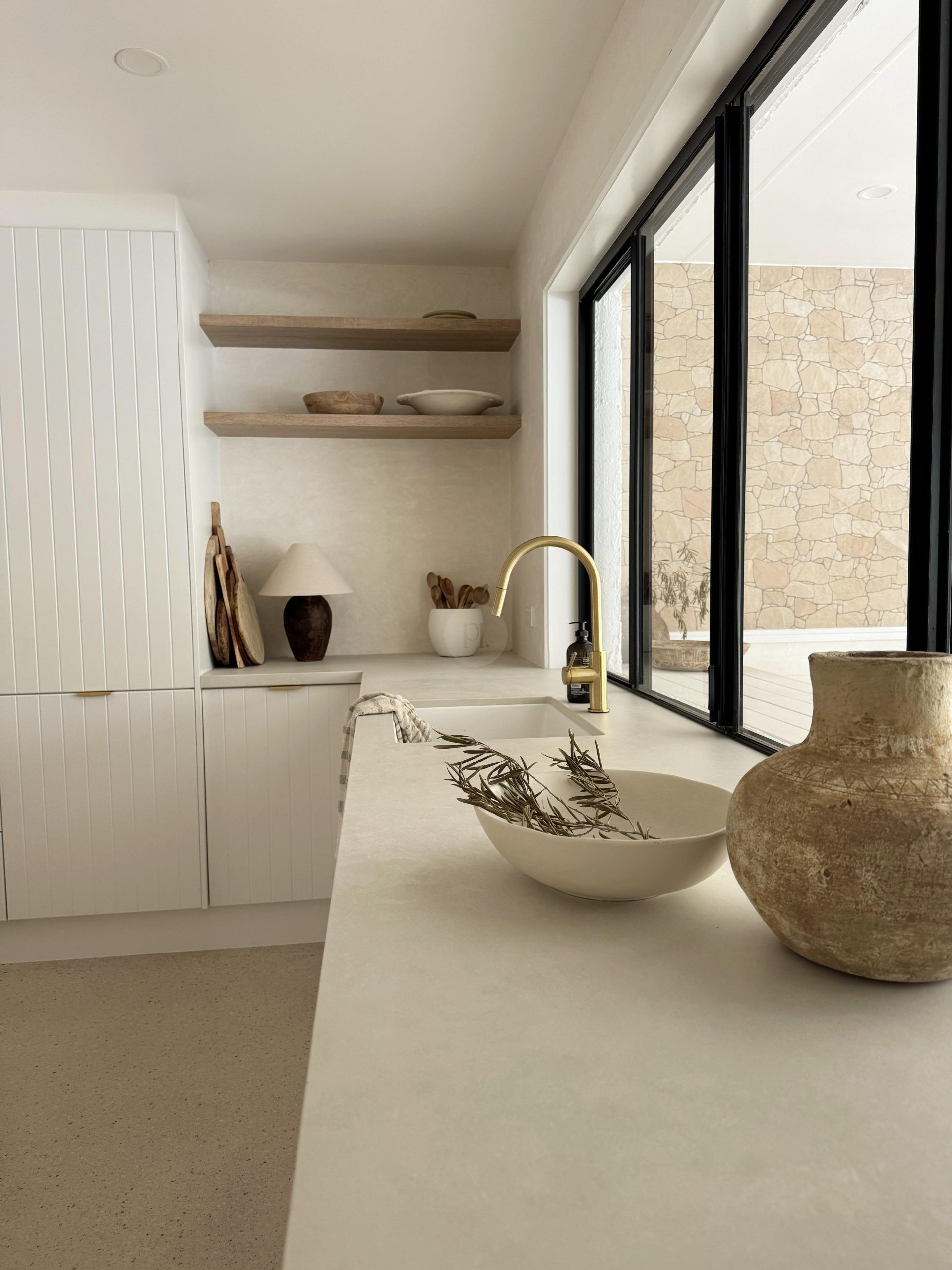The Boho Chic design of Greenview House sets the scene for a bohemian-inspired photoshoot, TV commercial, or film production. The interior features a blend of modern amenities and rustic charm, including a feature wall, fireplace, and a newly renovated kitchen that boasts wicker pendants, a concrete benchtop, brass hardware, and custom-designed arch niches.