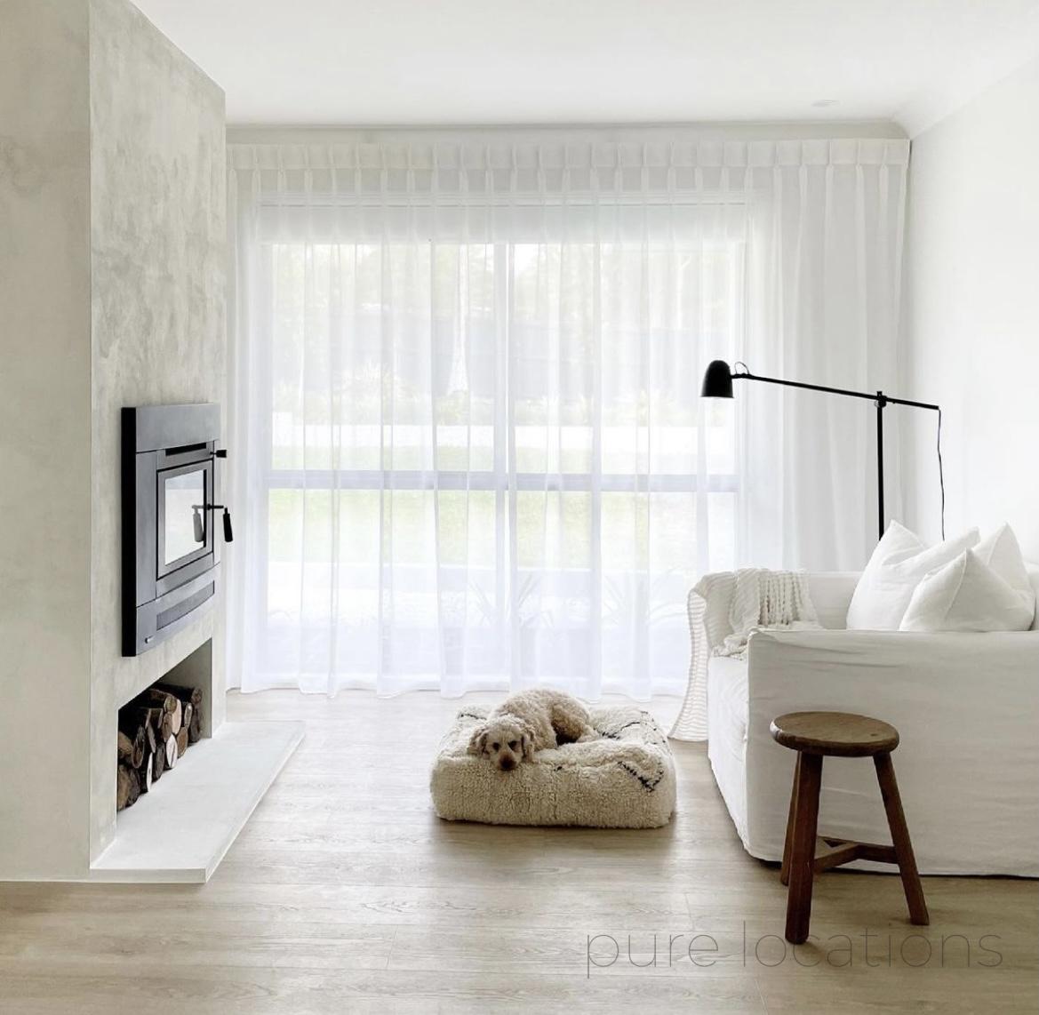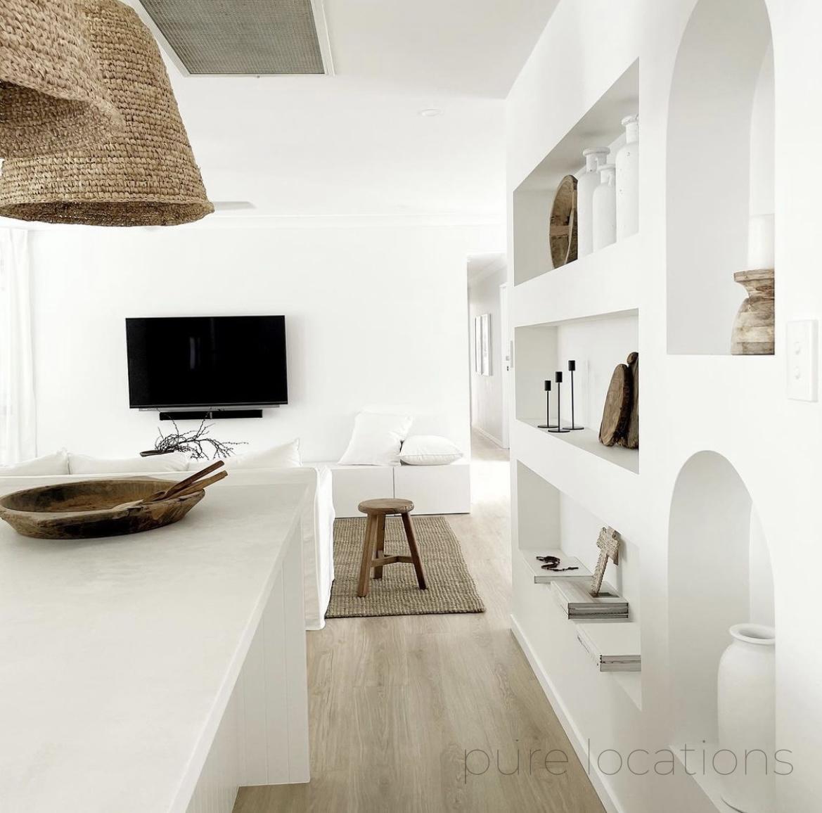 The Boho Chic design of Greenview House sets the scene for a bohemian-inspired photoshoot, TV commercial, or film production. The interior features a blend of modern amenities and rustic charm, including a feature wall, fireplace, and a newly renovated kitchen that boasts wicker pendants, a concrete benchtop, brass hardware, and custom-designed arch niches.