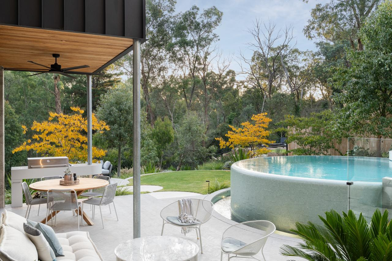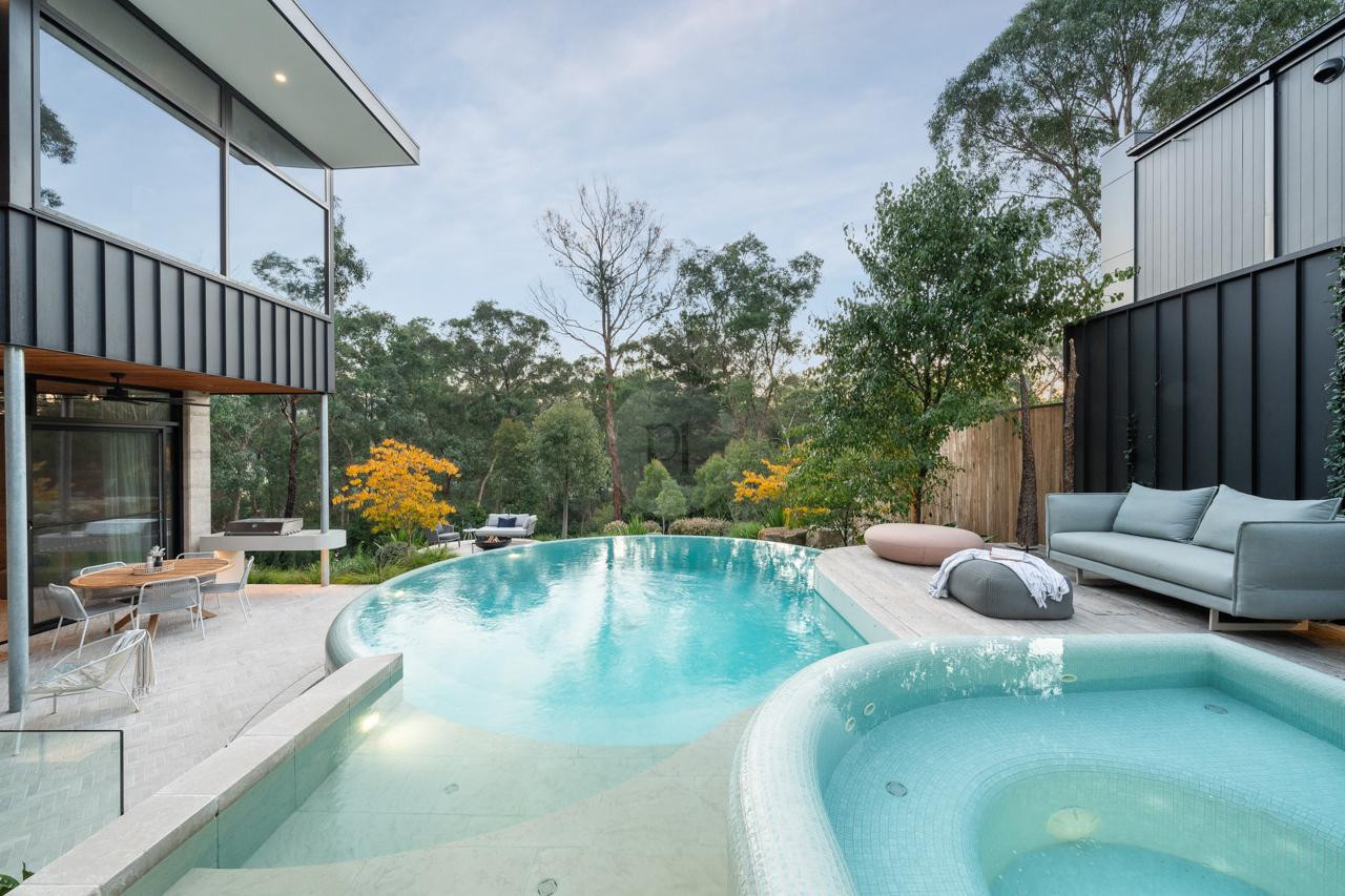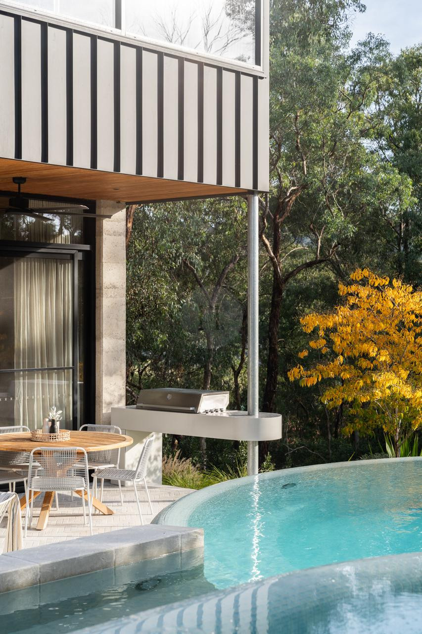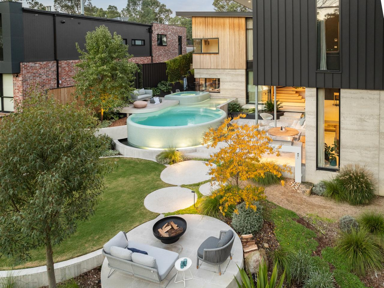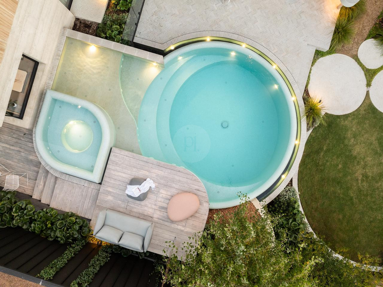 Outdoors, Halo House truly comes into its own. The award-winning swimming pool and spa anchor the outdoor living space and create a visually striking focal point. Established gardens offer layered textures and privacy, while the BBQ area and fire pit provide additional shoot-ready settings that transition seamlessly from day to night.