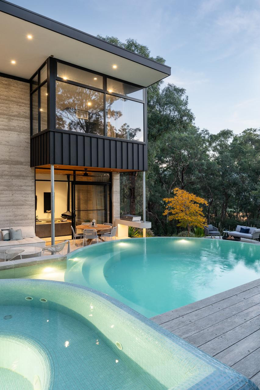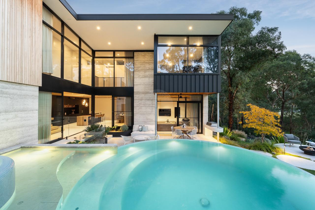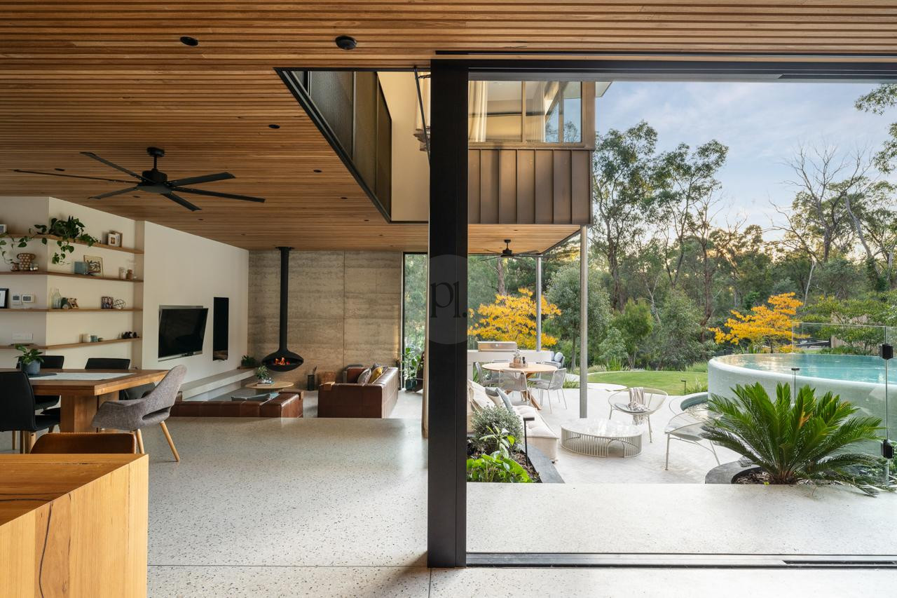 Welcome to Halo House, an architectural statement home set within the natural surrounds of Warrandyte, VIC. This contemporary residence is defined by its striking use of rammed earth walls and polished concrete slabs, delivering a tactile, design-led aesthetic that feels both grounded and elevated. Purposefully designed to blur the line between indoors and out, the home is flooded with natural light and offers a calm, cinematic atmosphere ideal for photoshoots, TV commercials, and filming projects.