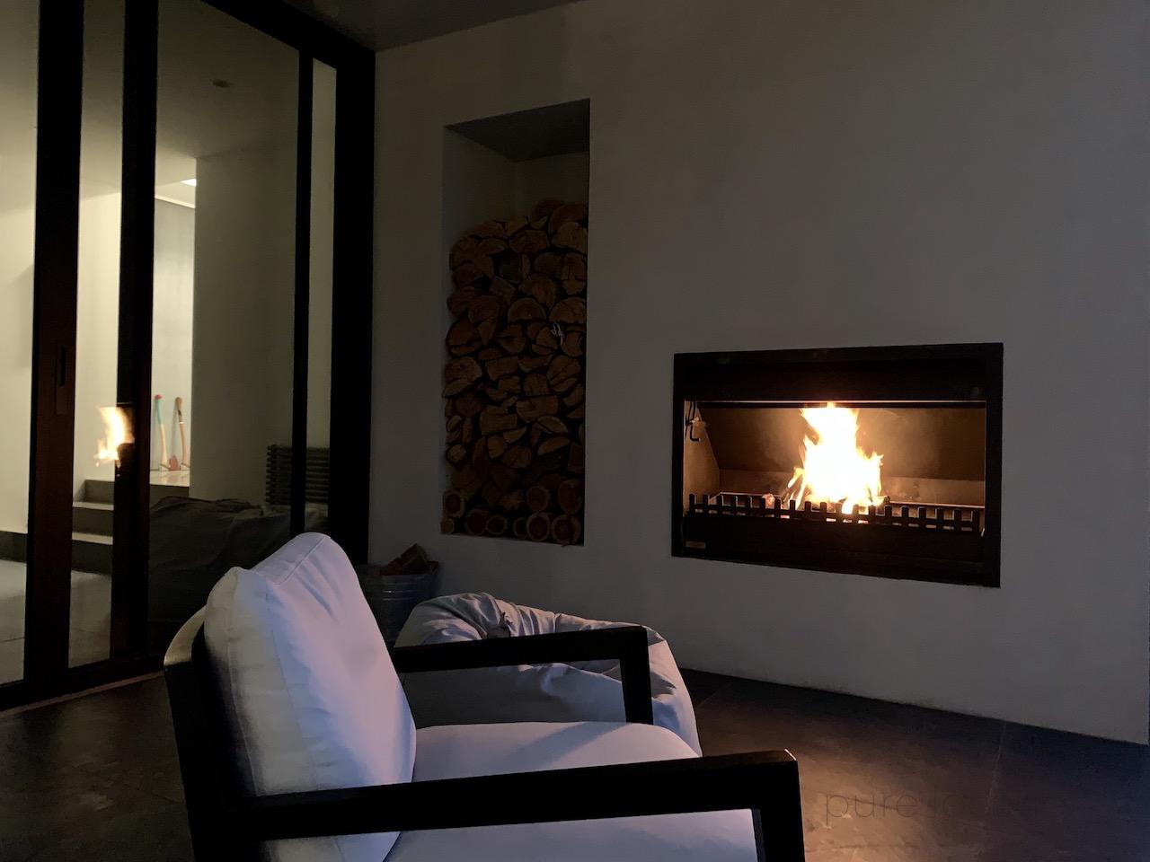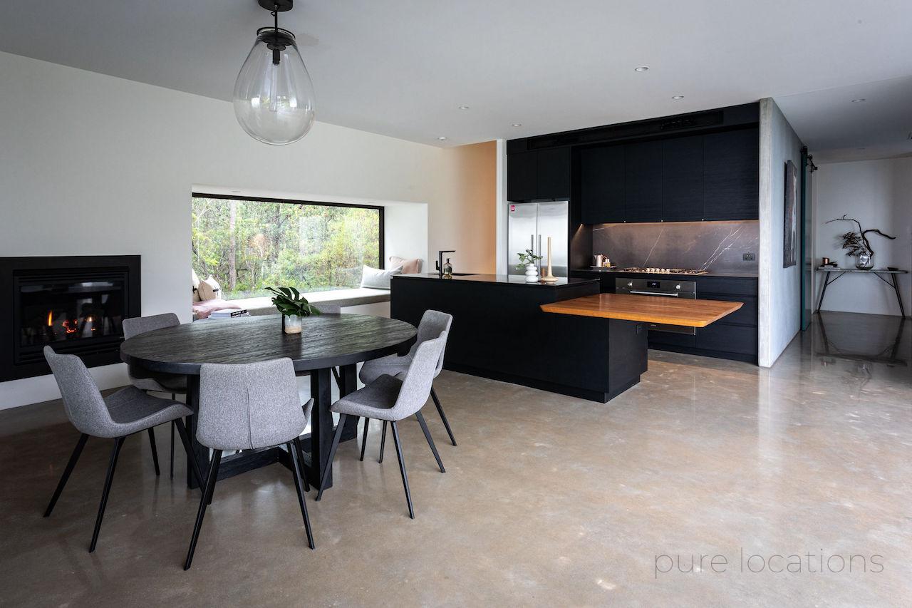 The sleek modern kitchen, minimalist furniture, and concrete floors exude a sense of modern luxury, while a cozy fireplace adds a touch of warmth to the space. Step outside to discover a haven of relaxation and entertainment, featuring a sparkling pool, outdoor living spaces, and a verandah offering sweeping views of the picturesque surroundings.