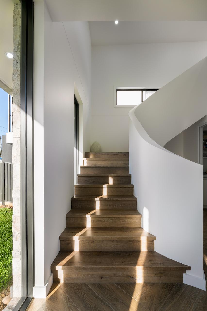 A newly built 3 storey home with herringbone flooring and an internal balcony. This home would make a great photoshoot location home for furniture and fashion. The balcony allows you to shoot from above, and the high end finishes in the home would elevate your product or photoshoot. The white walls give a clean and crisp finish to productions shot here. The home is complete with a swimming pool, marble bench tops and gas cooktop in the kitchen, curved staircase, stone facade and the whole home floods with natural light through the steel-framed glass doors and windows. From the deck you get distant city views and from the bedroom – panoramic views of Harbour Bridge.