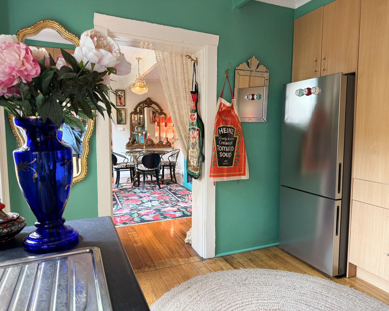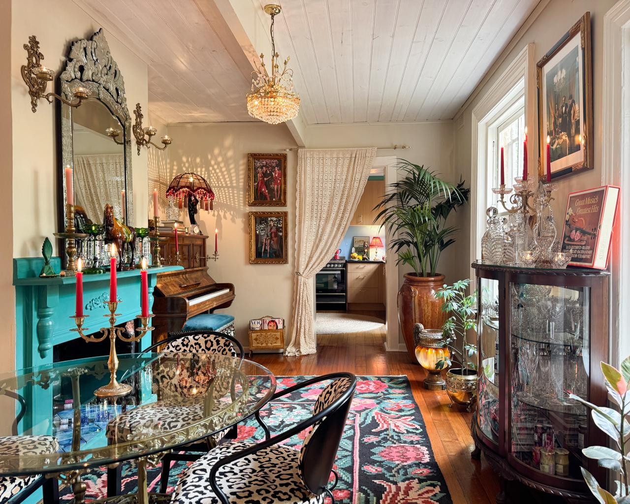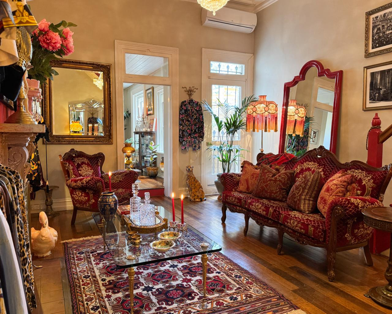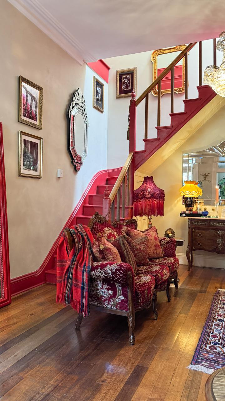 Step into a world of vintage elegance at this two-storey Victorian gem nestled in the heart of Collingwood, Melbourne. This property is a true jewel box, showcasing a striking palette of reds, mirrors, and antique glamour. Adorned with vintage photography in ornate frames, the walls are a canvas of artistry, while antique mirrors beautifully reflect light and shadow, enhancing the cinematic atmosphere.