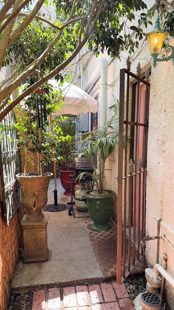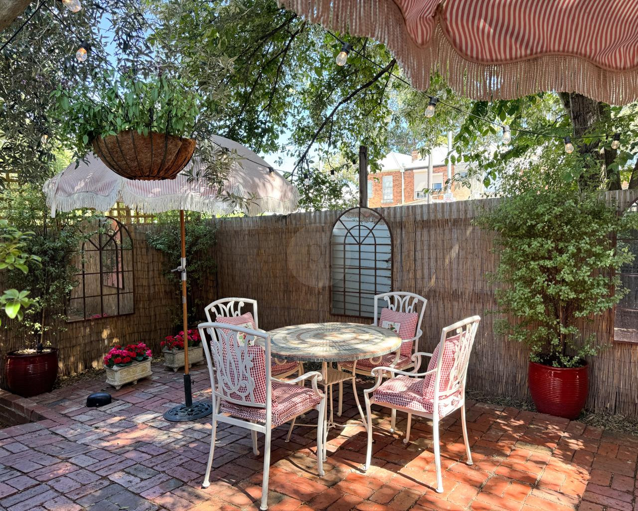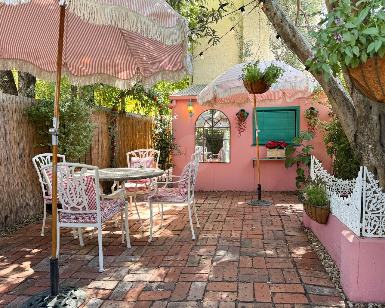 Outside, the brick-paved alfresco courtyard exudes a European feel, adorned with festoon lighting and lush greenery, complemented by a unique pink studio-style outbuilding with teal shutters, an ideal backdrop for creative projects. A 60+ year old olive tree adds to the Mediterranean charm of the outdoor space.