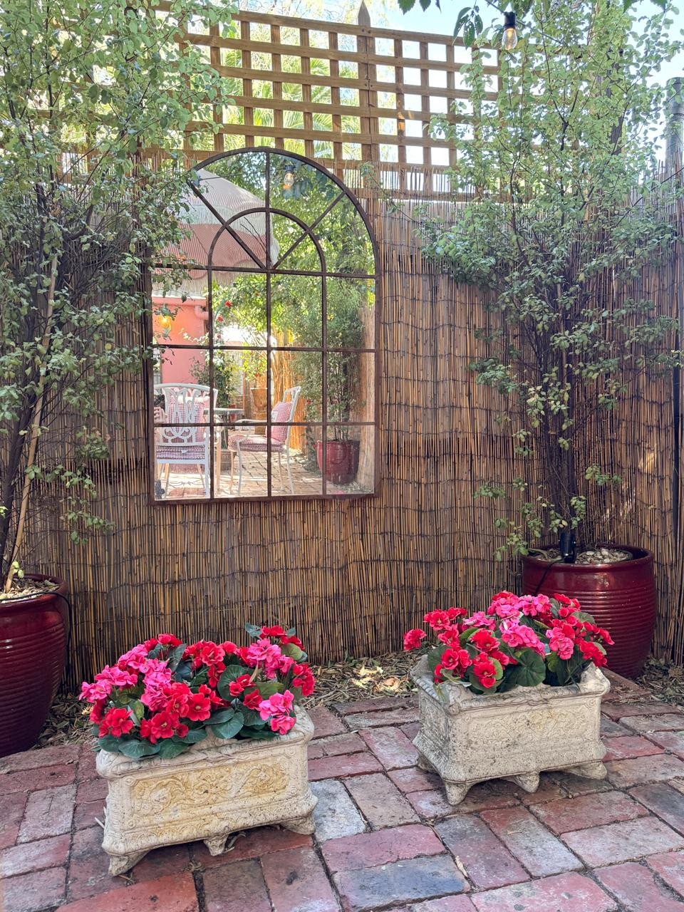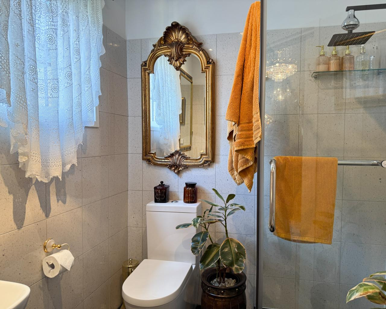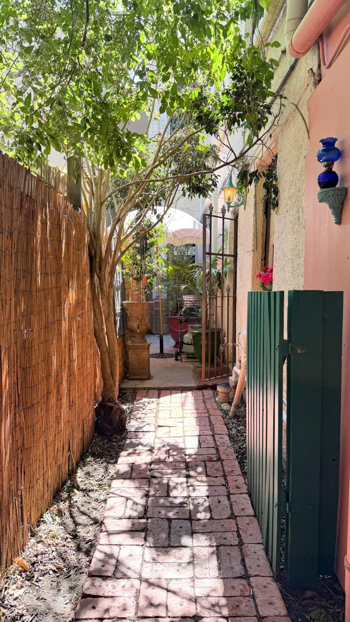 Outside, the brick-paved alfresco courtyard exudes a European feel, adorned with festoon lighting and lush greenery, complemented by a unique pink studio-style outbuilding with teal shutters, an ideal backdrop for creative projects. A 60+ year old olive tree adds to the Mediterranean charm of the outdoor space.