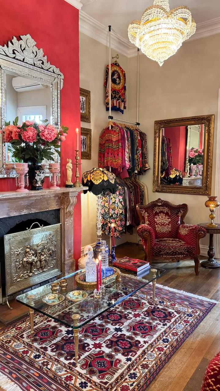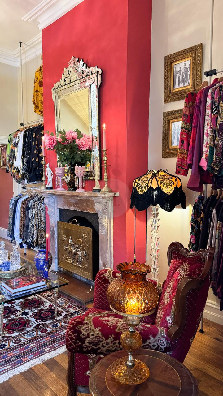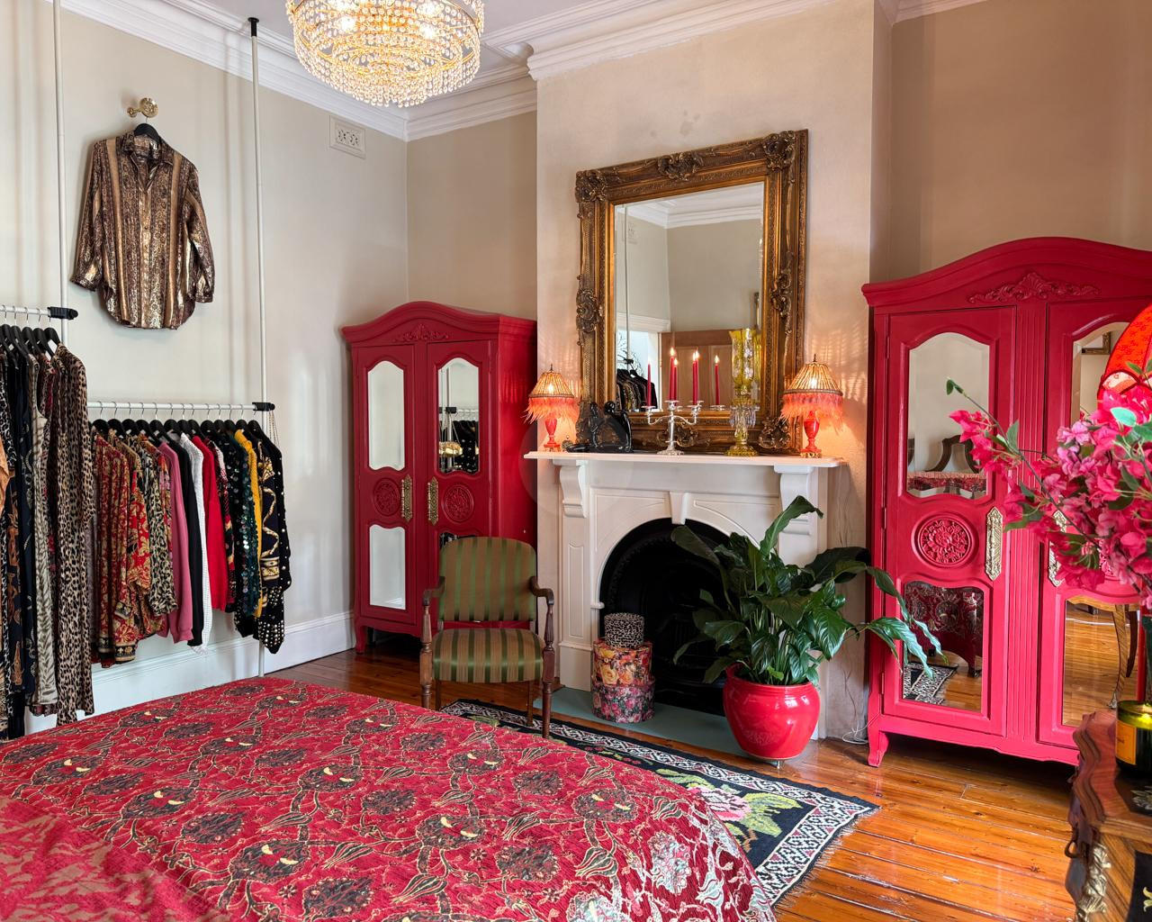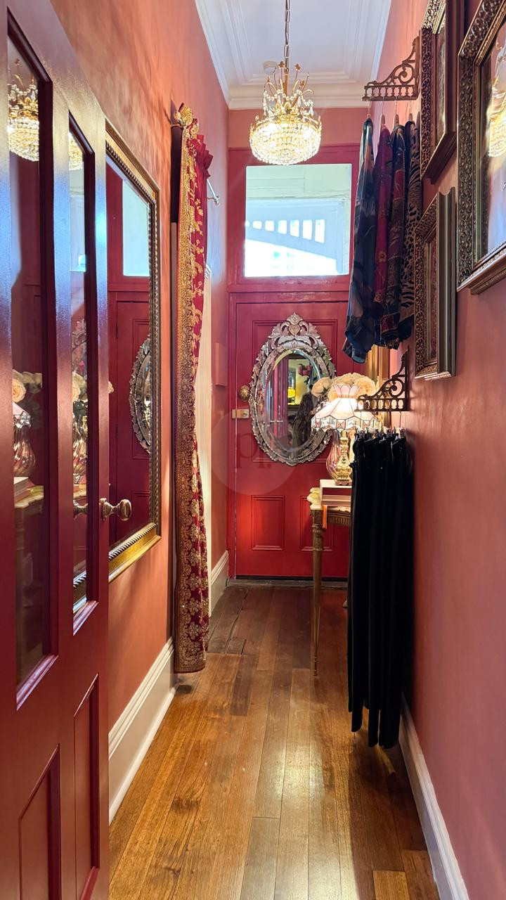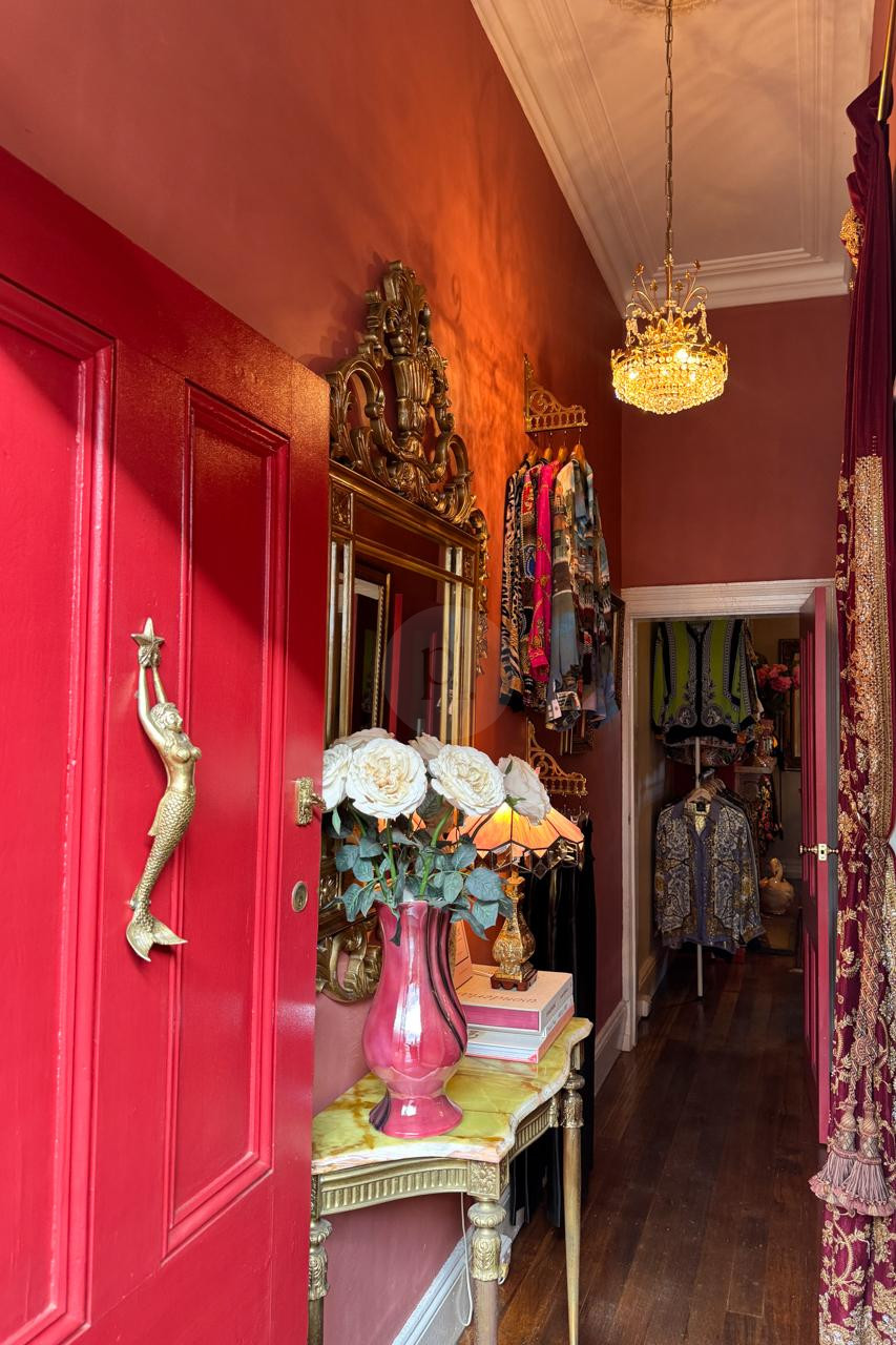 As you enter, the grand lounge captivates with its bold red fireplace wall and dramatic matching red staircase, surrounded by a curated collection of antiques and unique pieces. The front room doubles as a luxe vintage dressing room, featuring floor-to-ceiling racks of exquisite silk blouses and statement garments, perfect for fashion shoots.