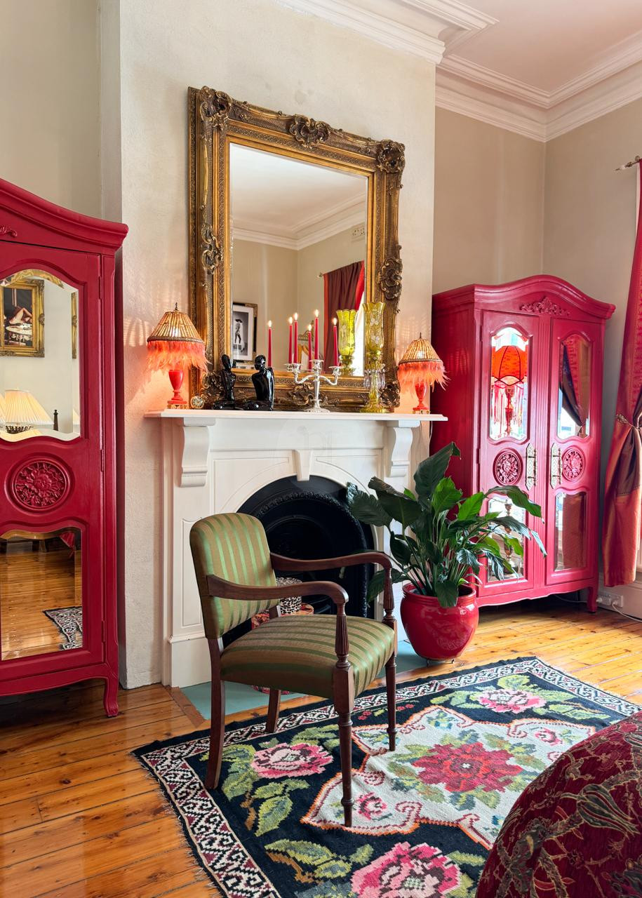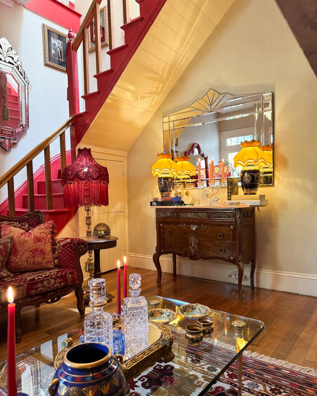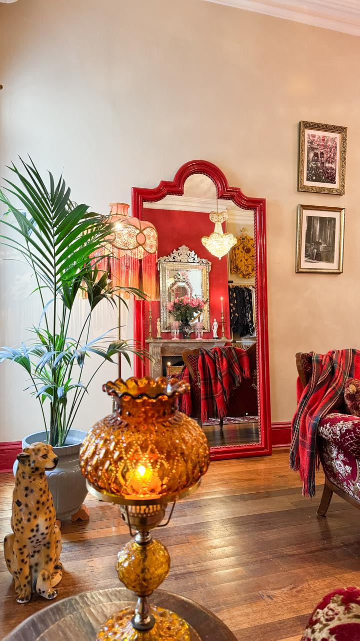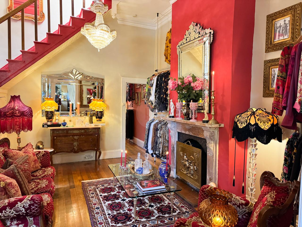 As you enter, the grand lounge captivates with its bold red fireplace wall and dramatic matching red staircase, surrounded by a curated collection of antiques and unique pieces. The front room doubles as a luxe vintage dressing room, featuring floor-to-ceiling racks of exquisite silk blouses and statement garments, perfect for fashion shoots.