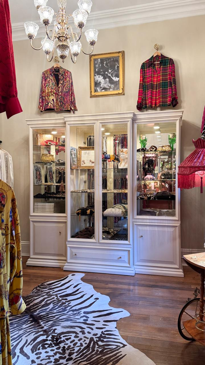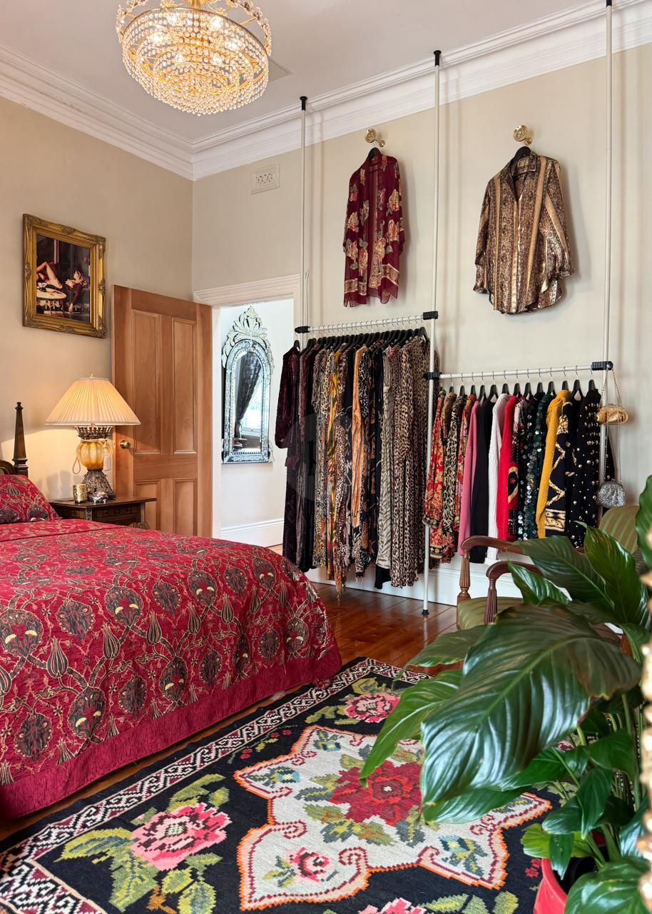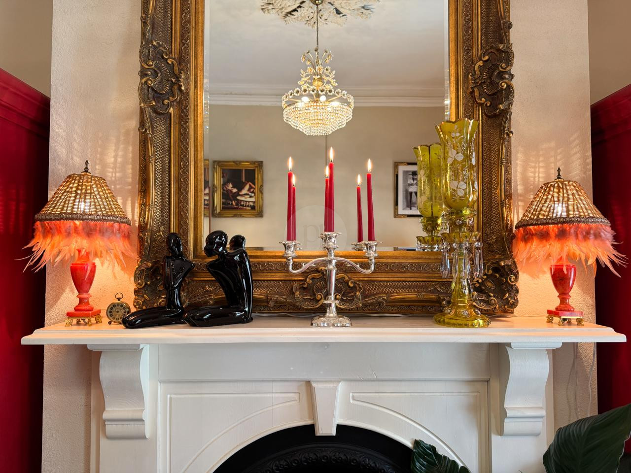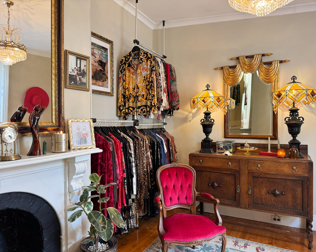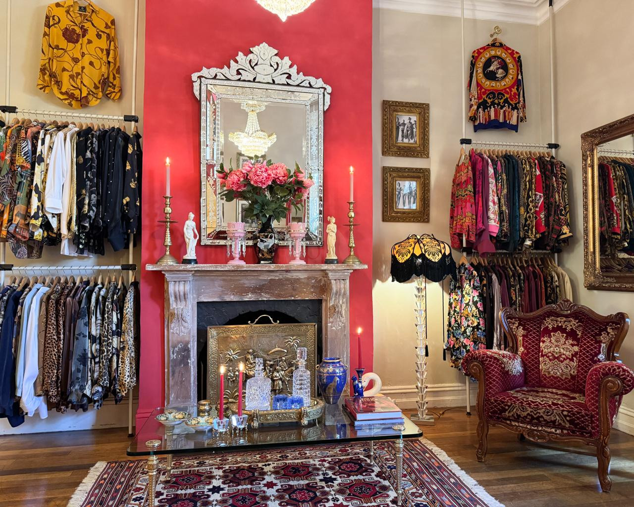 As you enter, the grand lounge captivates with its bold red fireplace wall and dramatic matching red staircase, surrounded by a curated collection of antiques and unique pieces. The front room doubles as a luxe vintage dressing room, featuring floor-to-ceiling racks of exquisite silk blouses and statement garments, perfect for fashion shoots.