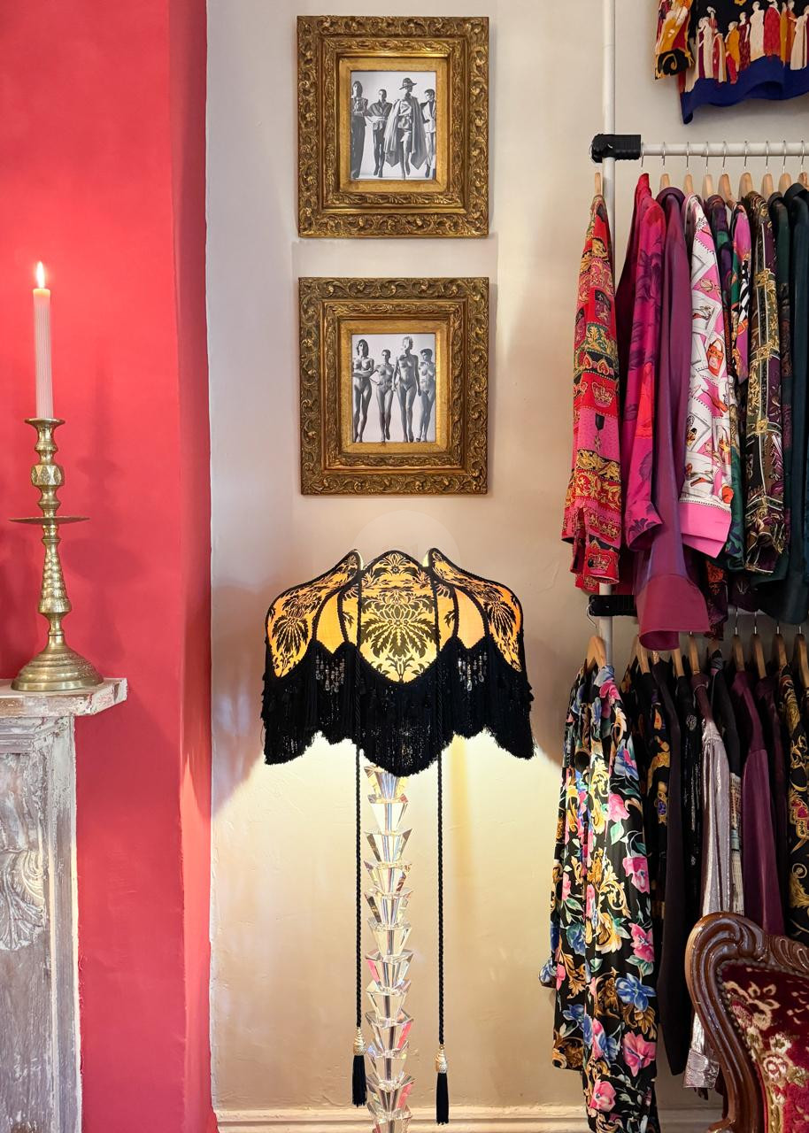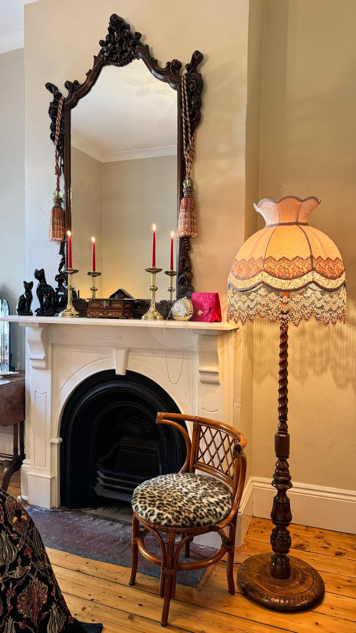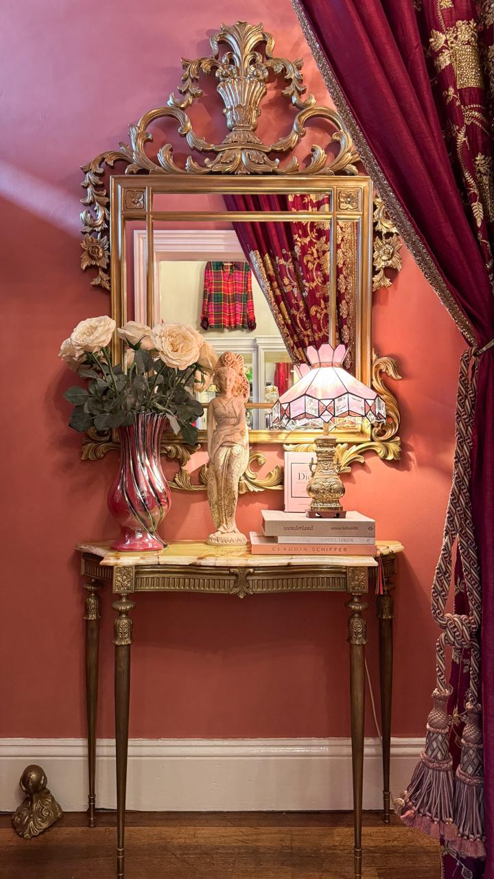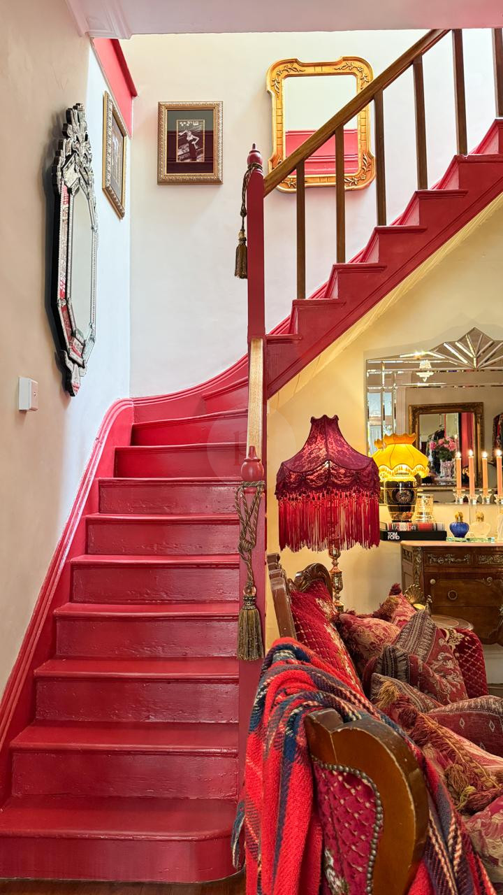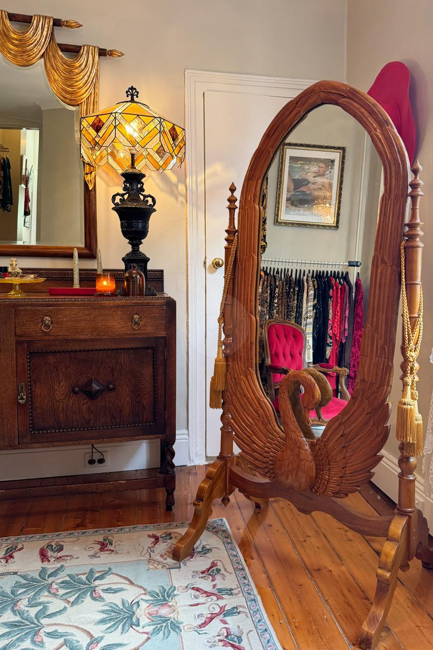 As you enter, the grand lounge captivates with its bold red fireplace wall and dramatic matching red staircase, surrounded by a curated collection of antiques and unique pieces. The front room doubles as a luxe vintage dressing room, featuring floor-to-ceiling racks of exquisite silk blouses and statement garments, perfect for fashion shoots.