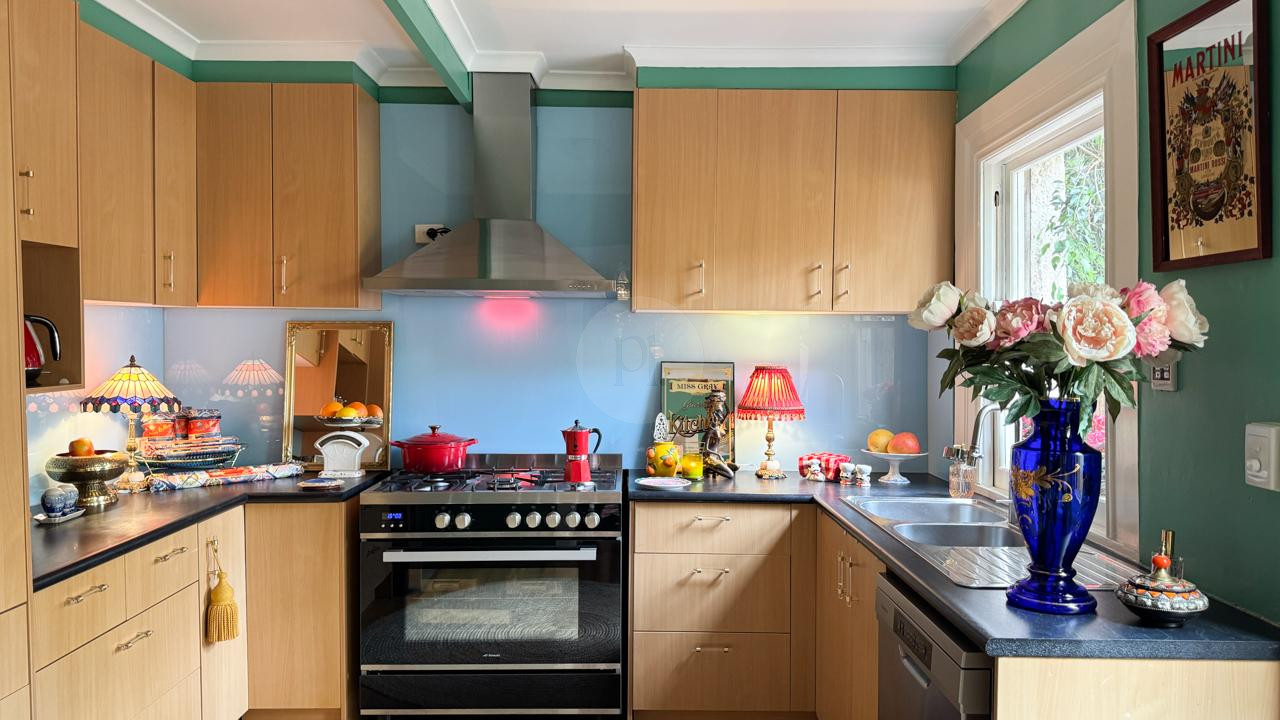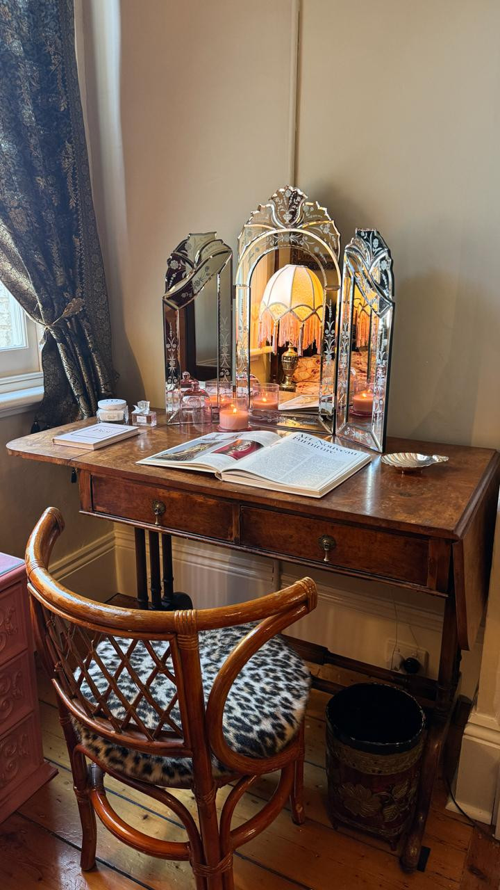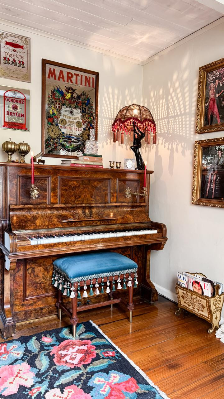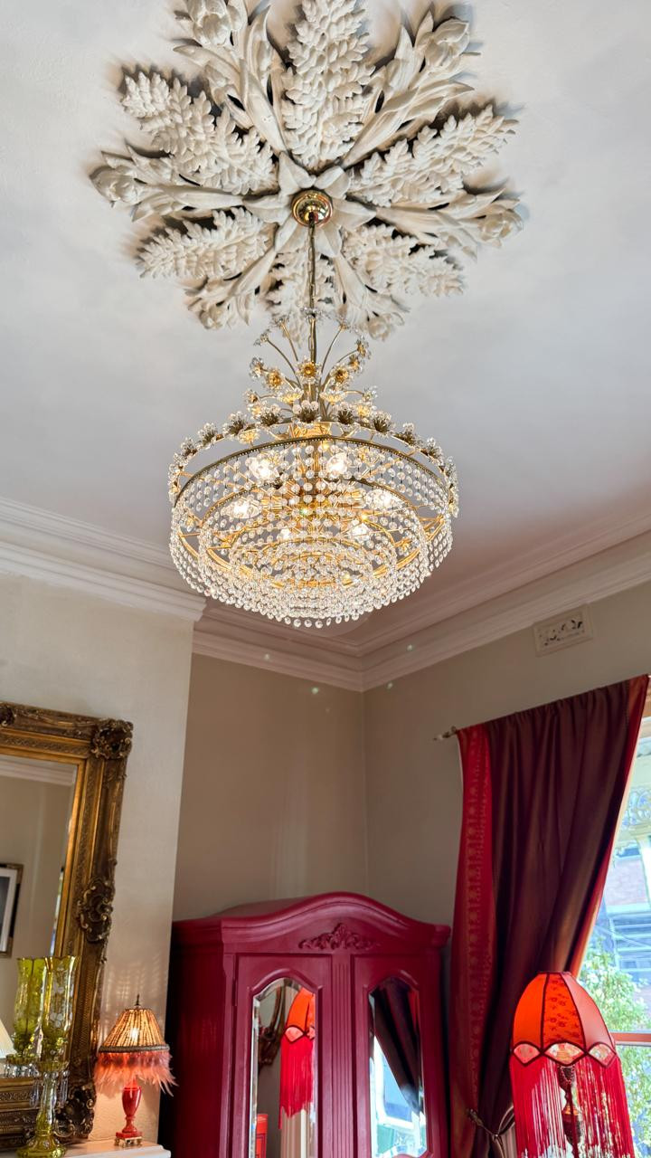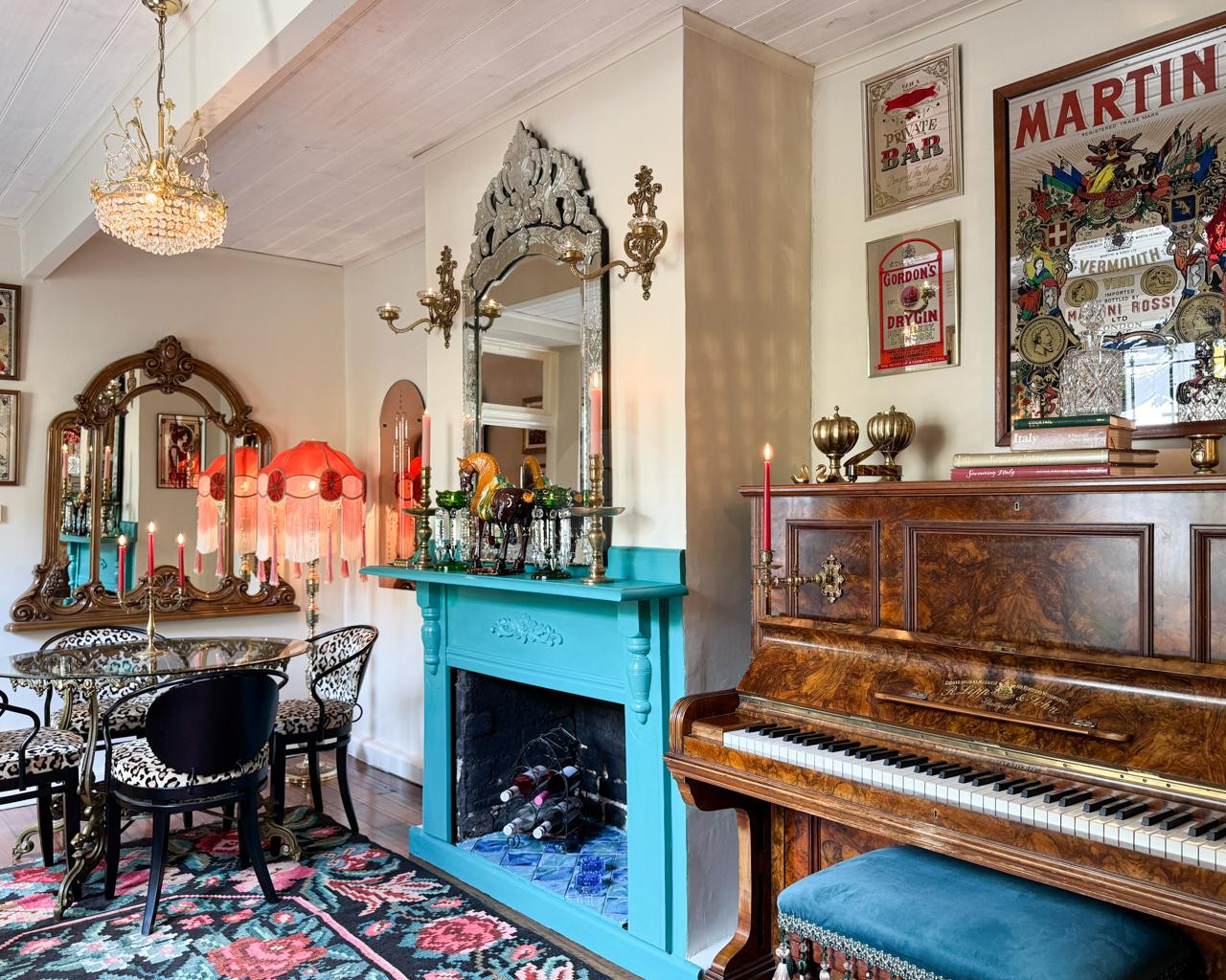 Upstairs, the Turkish-inspired bedrooms offer an intimate retreat with layered textiles, vintage furnishings, and warm lighting, creating an inviting ambience. The dining area and kitchen are candlelit and romantic, highlighted by chandeliers and an antique piano that serves as a charming centrepiece.
