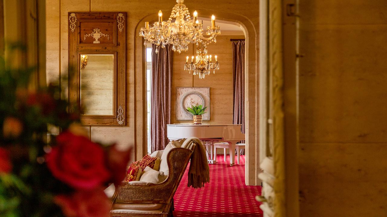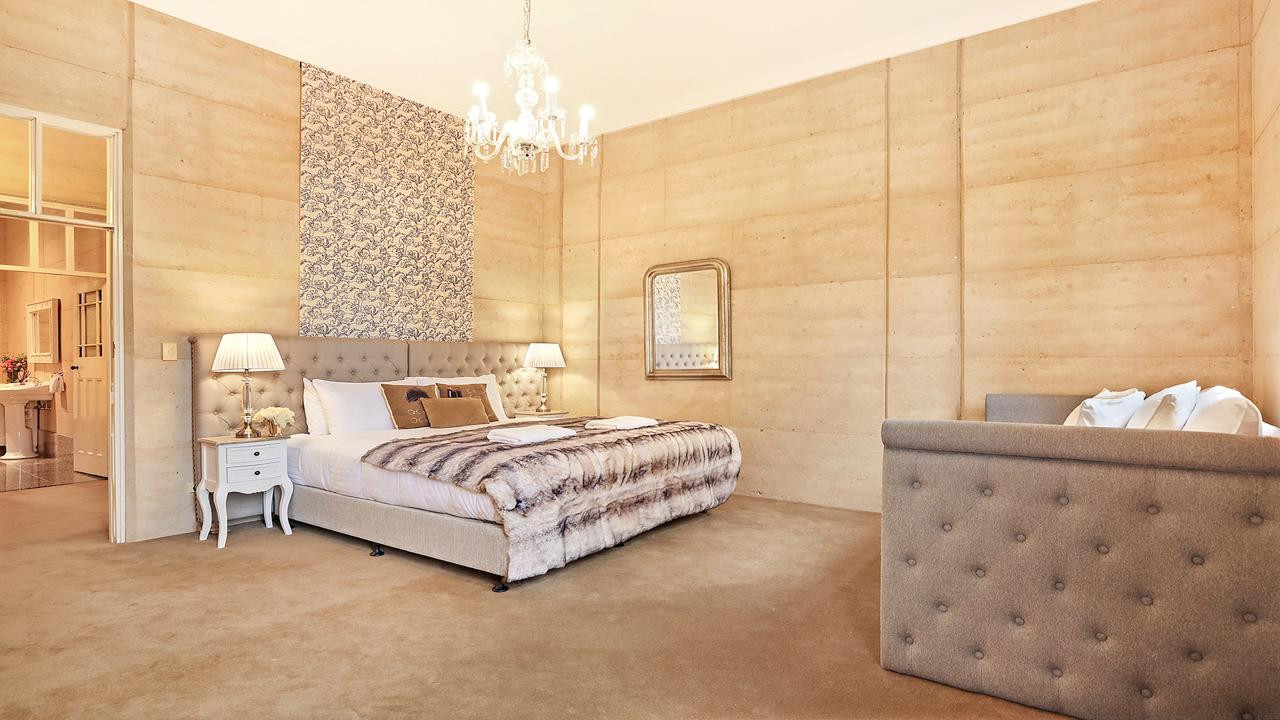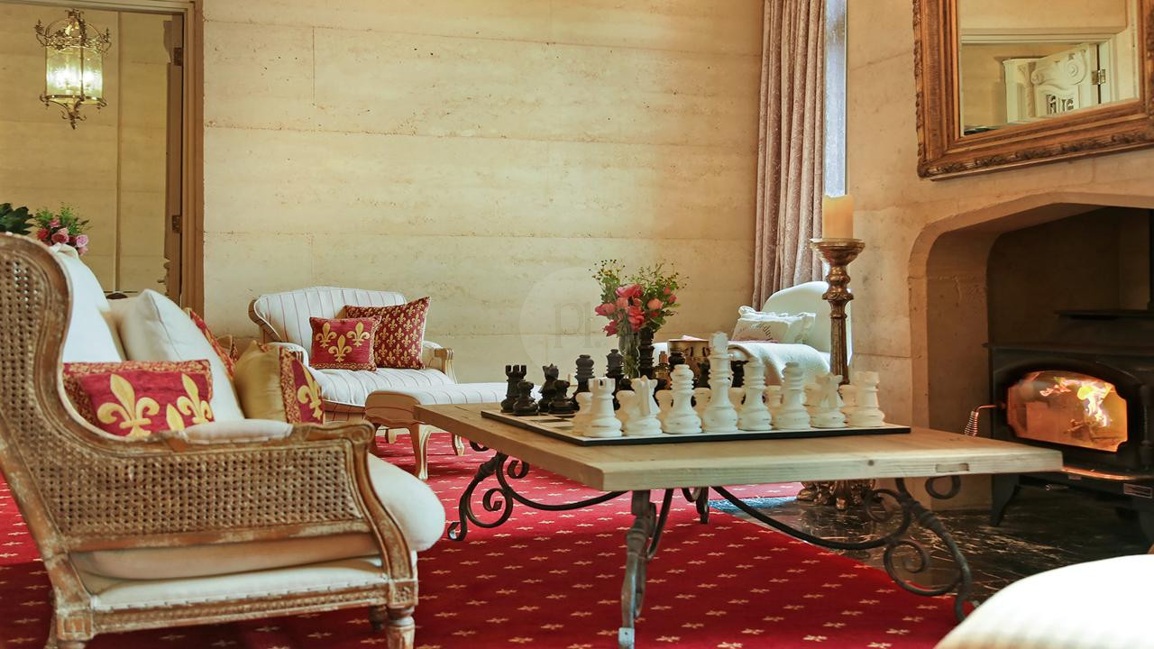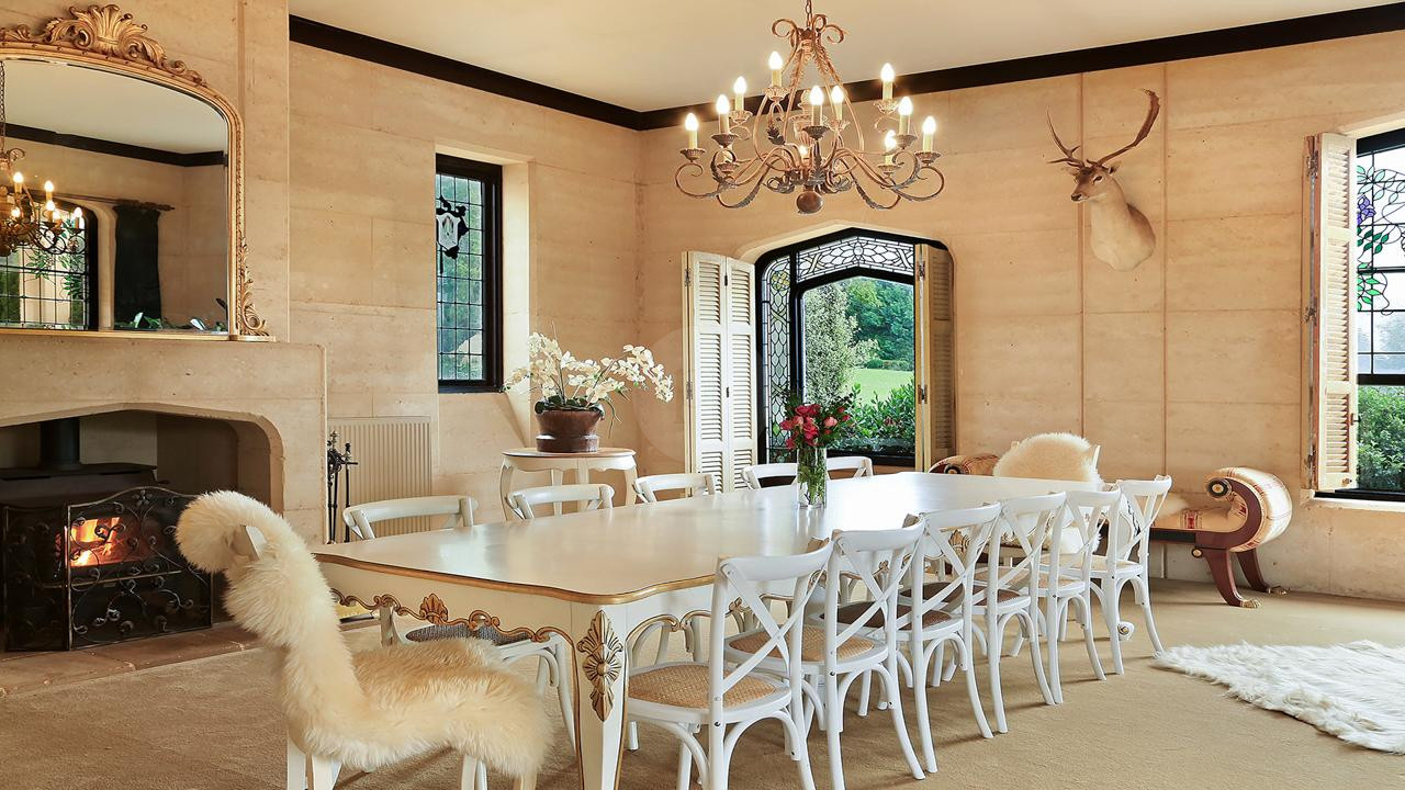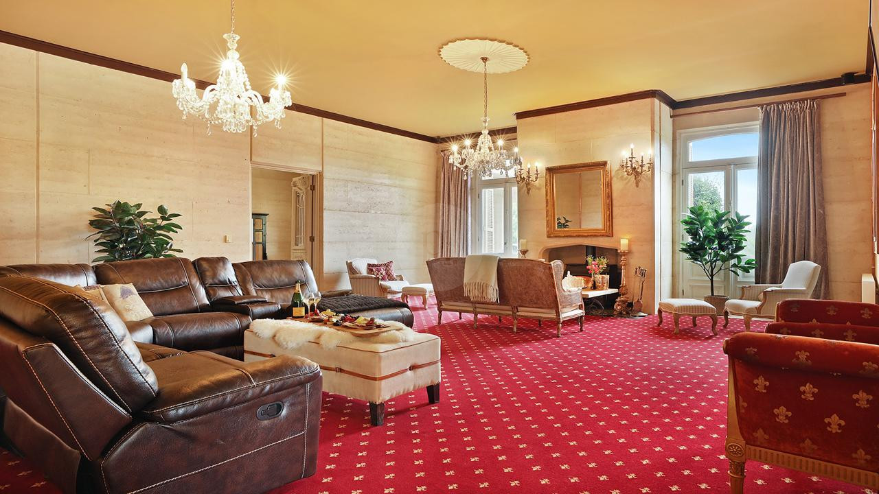 Inside, expansive interiors are flooded with natural light via an abundance of French doors that open onto sweeping rural vistas. The opulent French-style kitchen and baroque dining room, anchored by an impressive five-metre dining table, create striking settings for editorial, lifestyle, and cinematic productions. Multiple living areas feature grand fireplaces, while the wine cellar and cloakroom add further layers of character and visual depth.