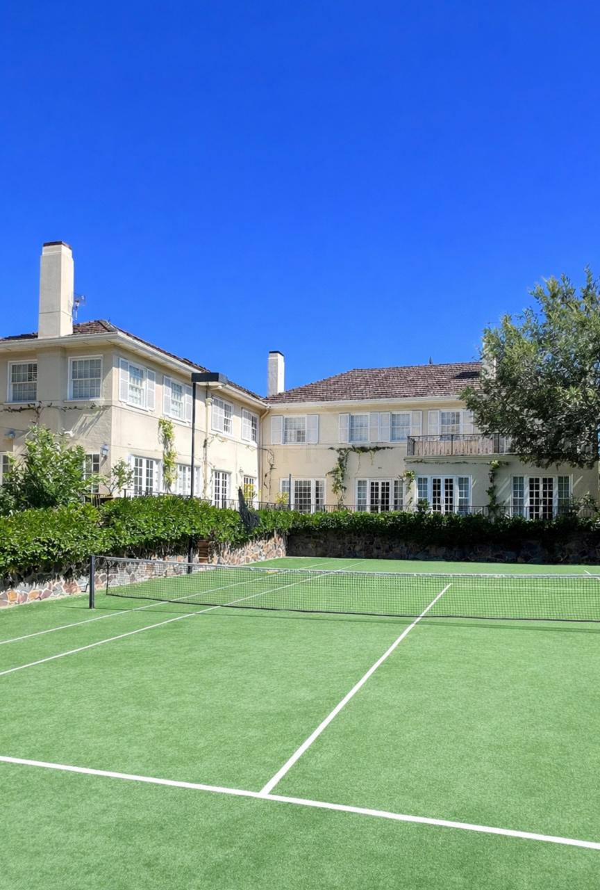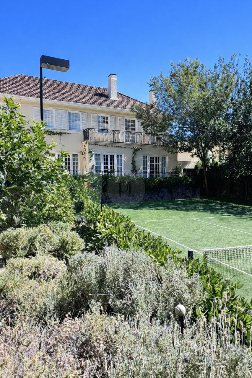 Beyond the manor-inspired exterior, the estate unfolds into a lush sanctuary. The heart of the home is the stunning designer pool with sandstone water features, adjacent to an expansive synthetic grass tennis court. Complementing the old money aesthetic of this grand residence is the multiple outdoor living spaces that include a wood-fired pizza oven, lounge settings, outdoor dining shaded by chic umbrellas that create a perfectly relaxed atmosphere.