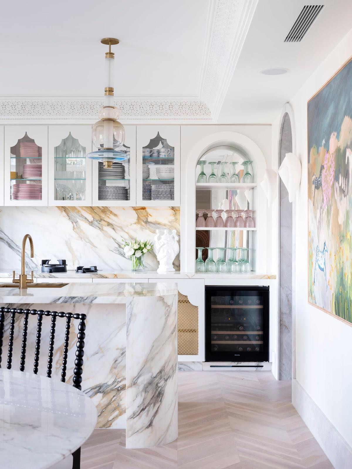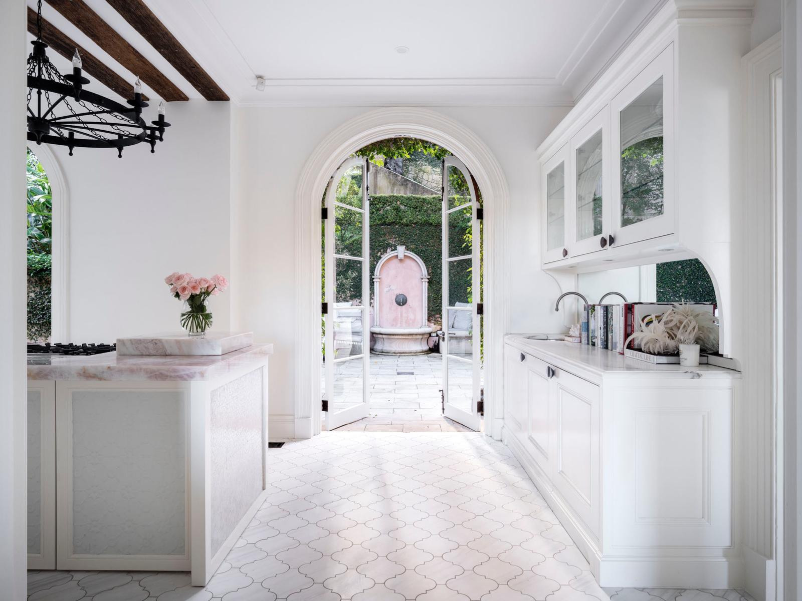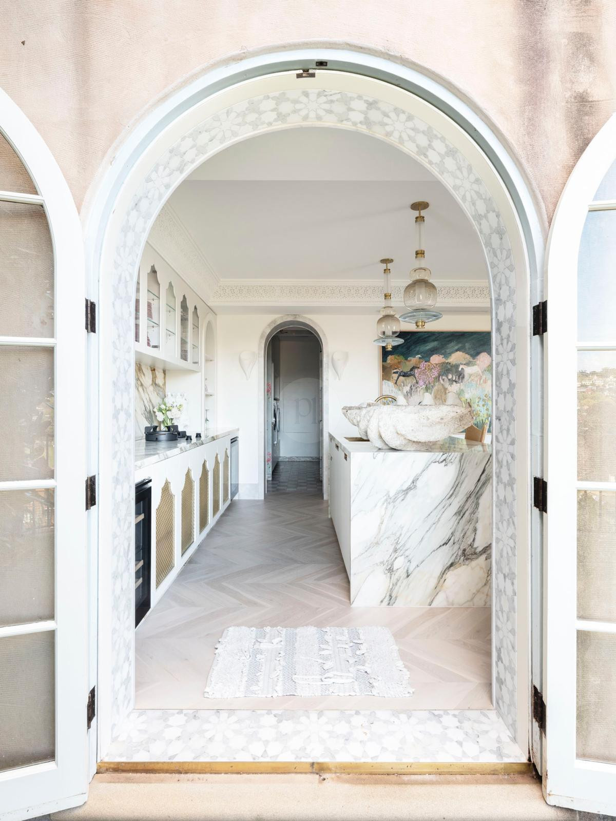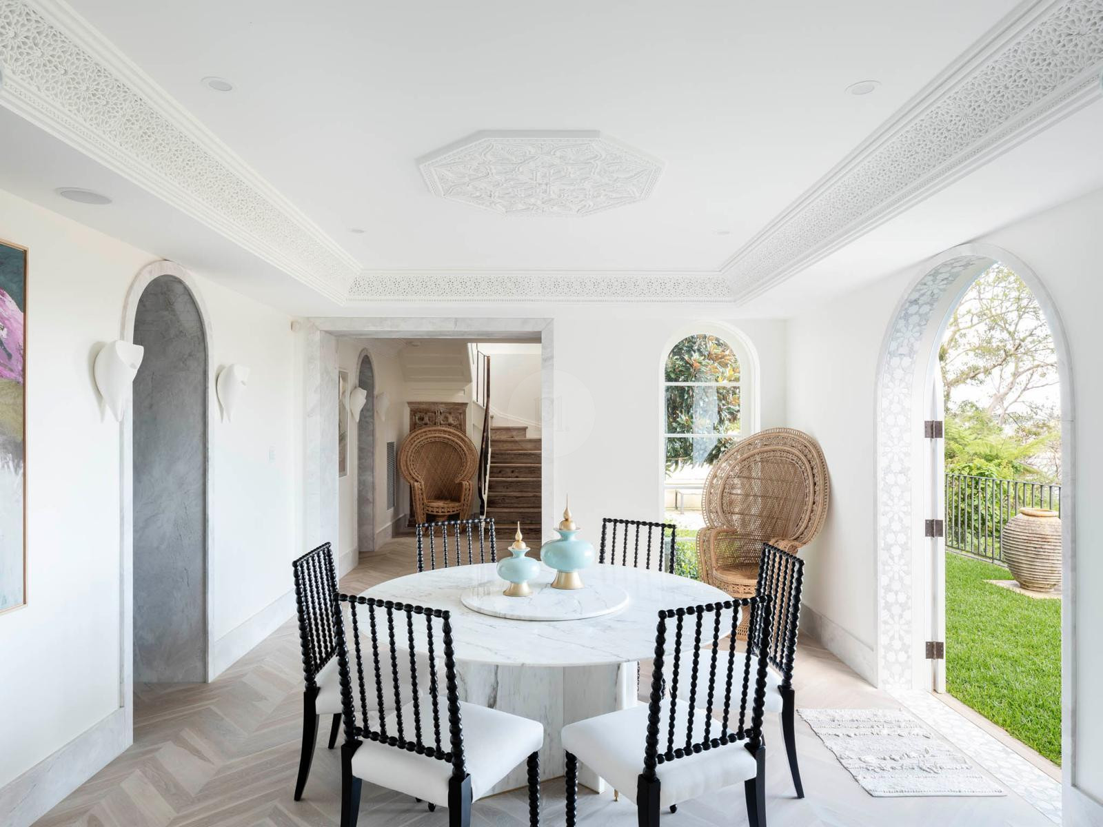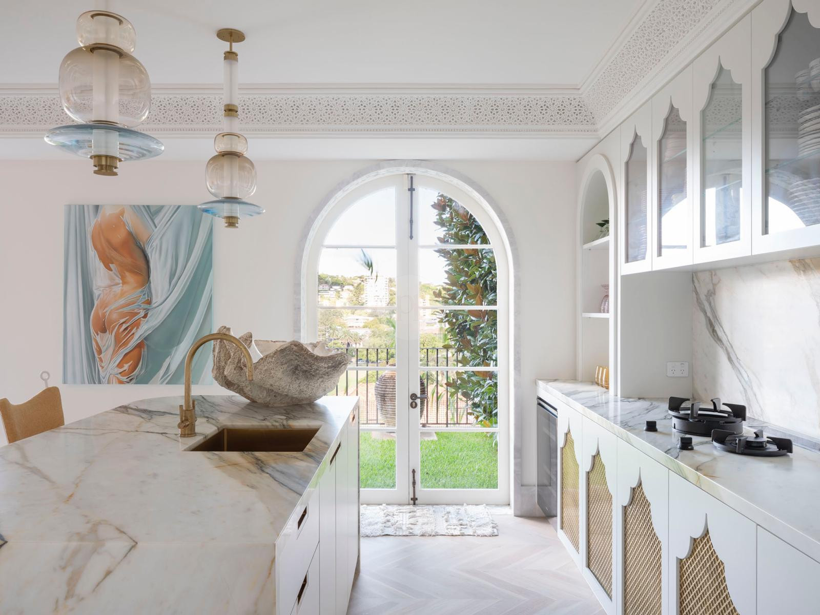 The lower level of the home has been reinvented into an enchanting outdoor entertaining space, seamlessly connecting to the garden, where sparkling harbour views await. The imaginative, bar-like kitchen on this level is also a key highlight of the home, featuring an island and splashback crafted from exquisite Calacatta Oro marble, and further complemented by Arabian-inspired white and gold cabinetry, vibrant glassware and statement pendant lighting.