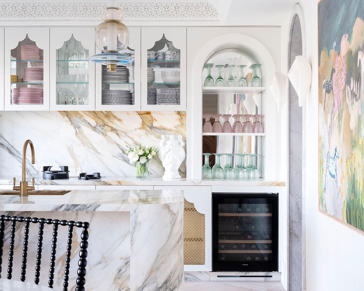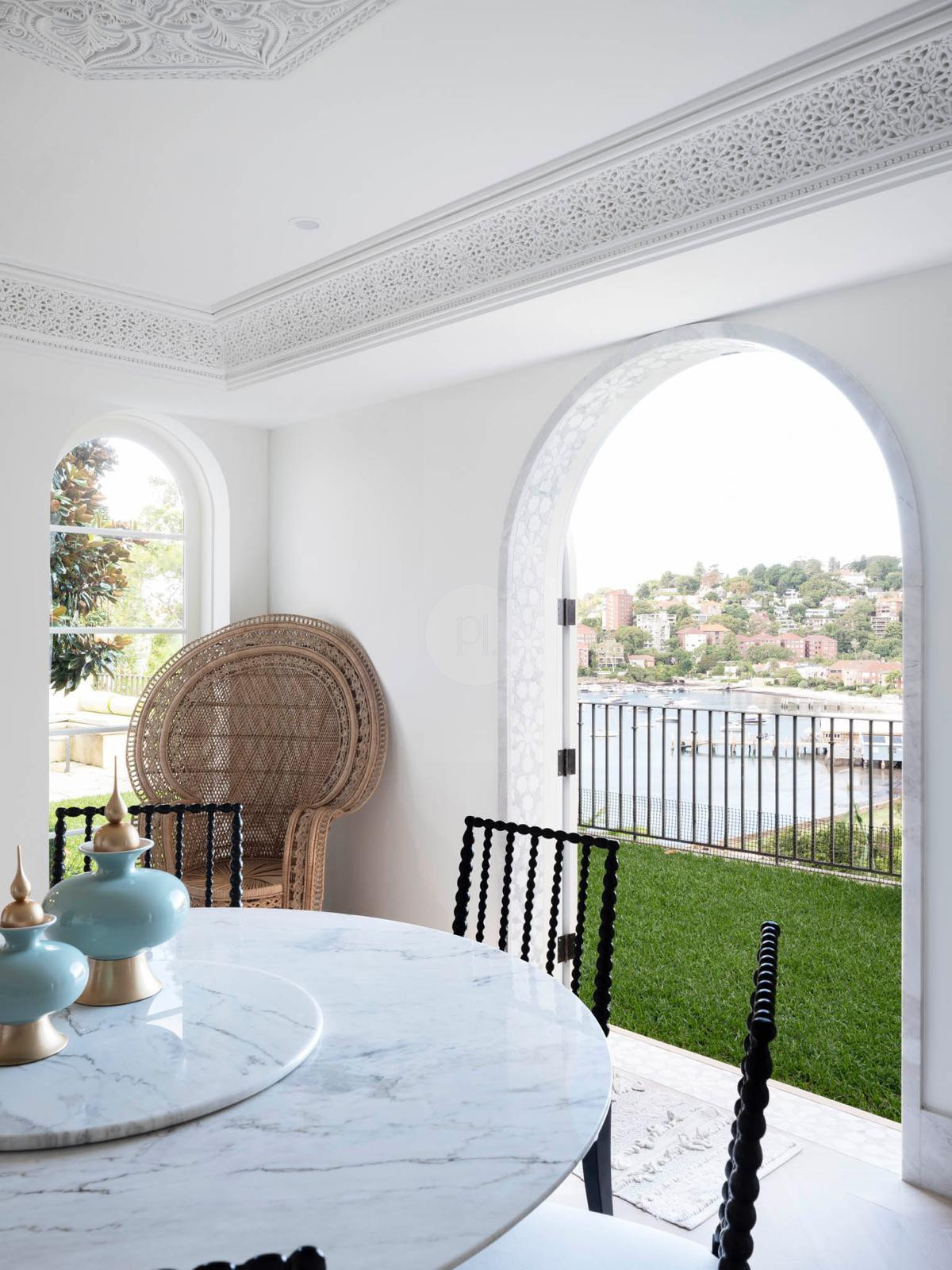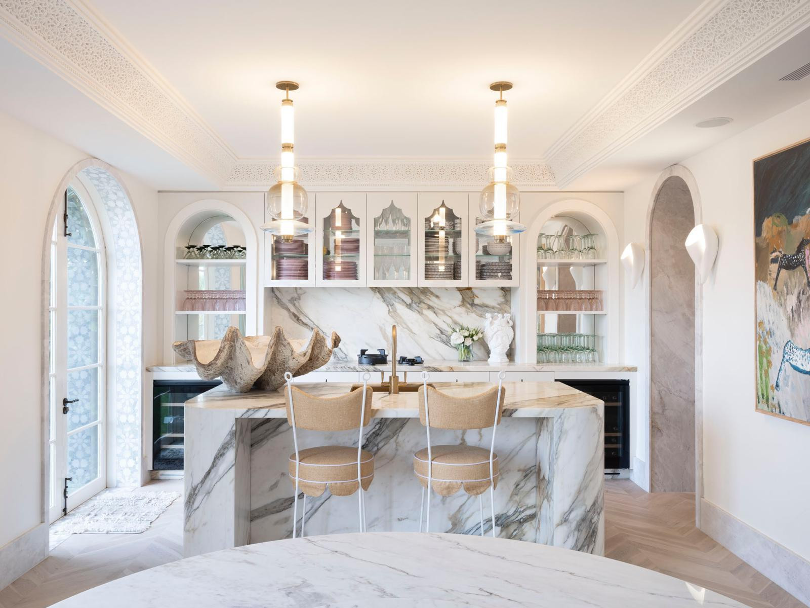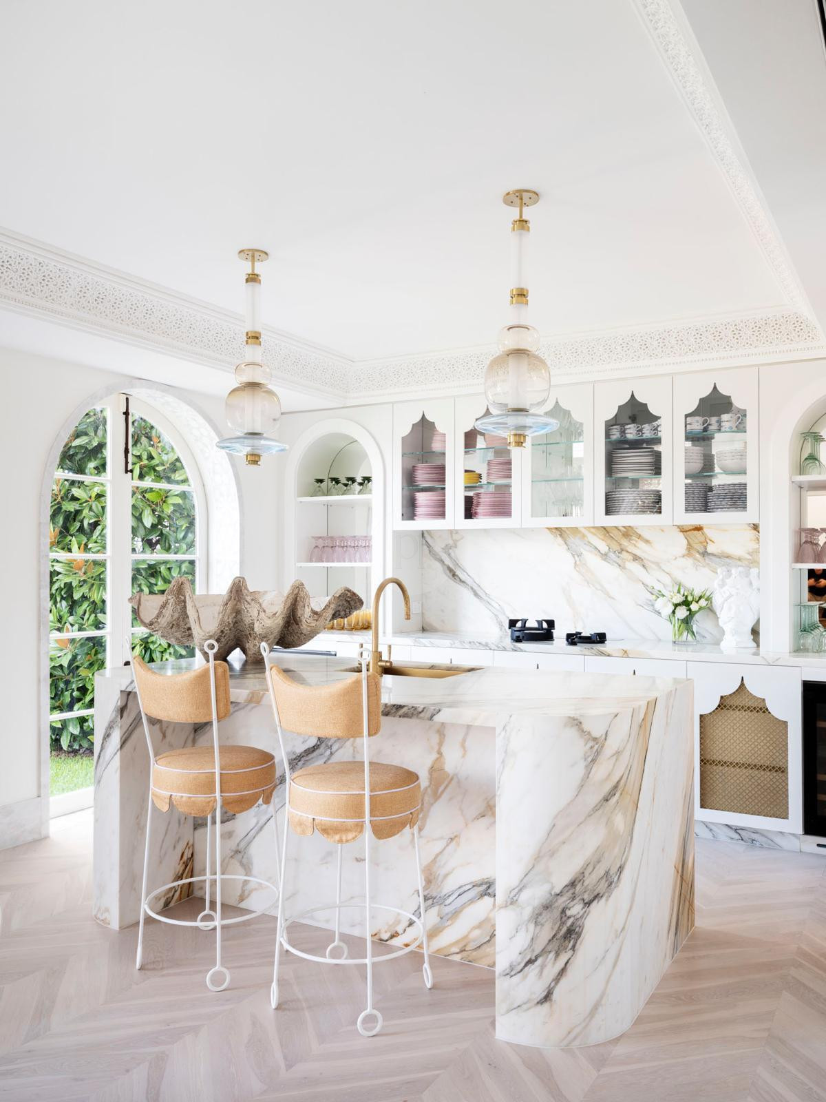 The lower level of the home has been reinvented into an enchanting outdoor entertaining space, seamlessly connecting to the garden, where sparkling harbour views await. The imaginative, bar-like kitchen on this level is also a key highlight of the home, featuring an island and splashback crafted from exquisite Calacatta Oro marble, and further complemented by Arabian-inspired white and gold cabinetry, vibrant glassware and statement pendant lighting.