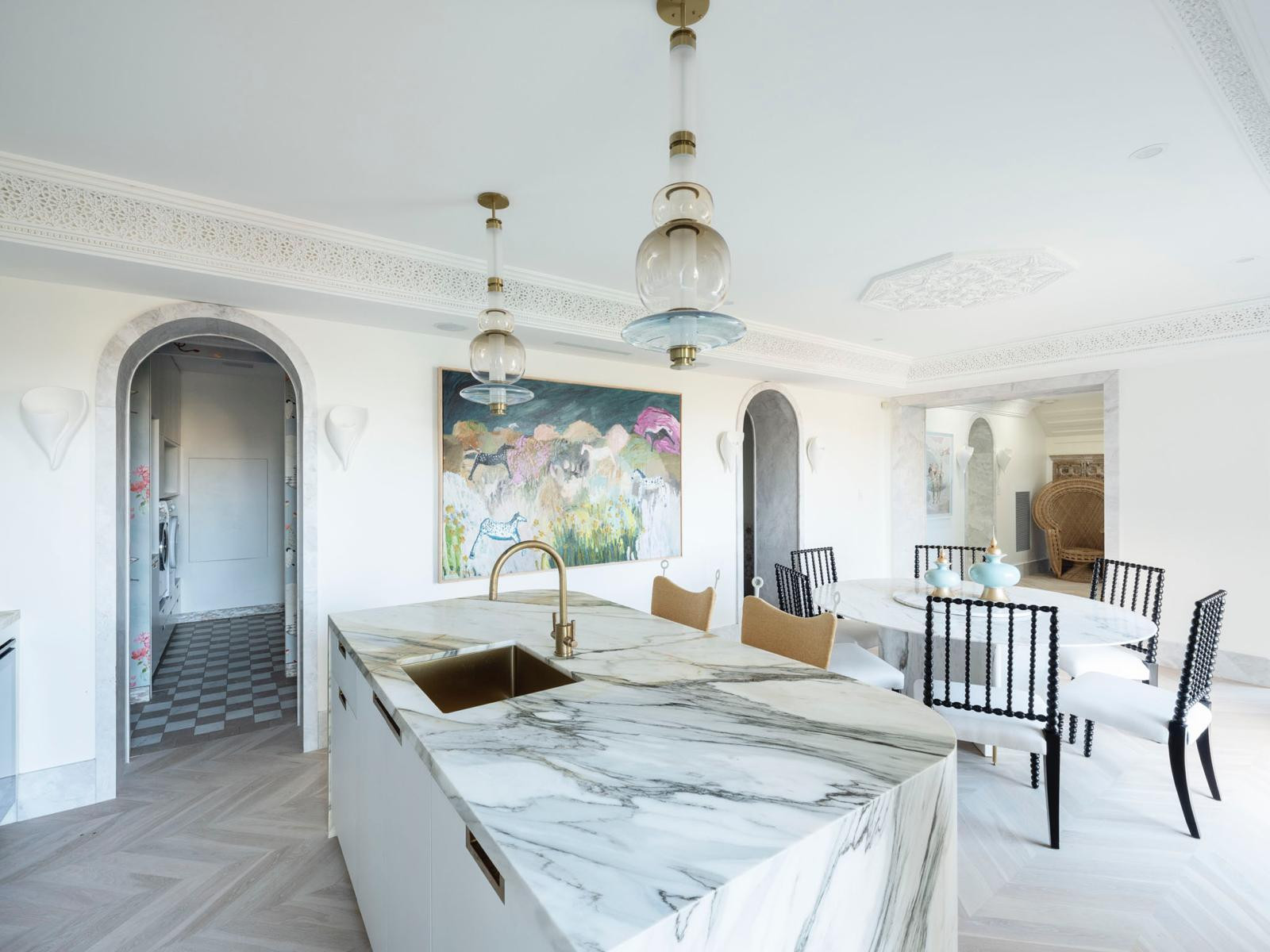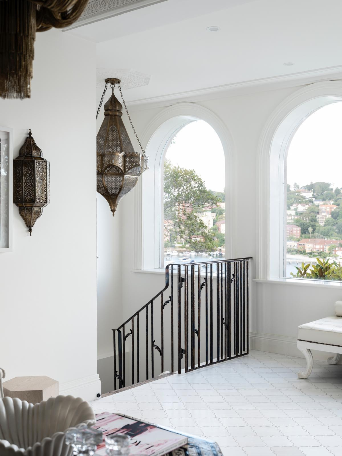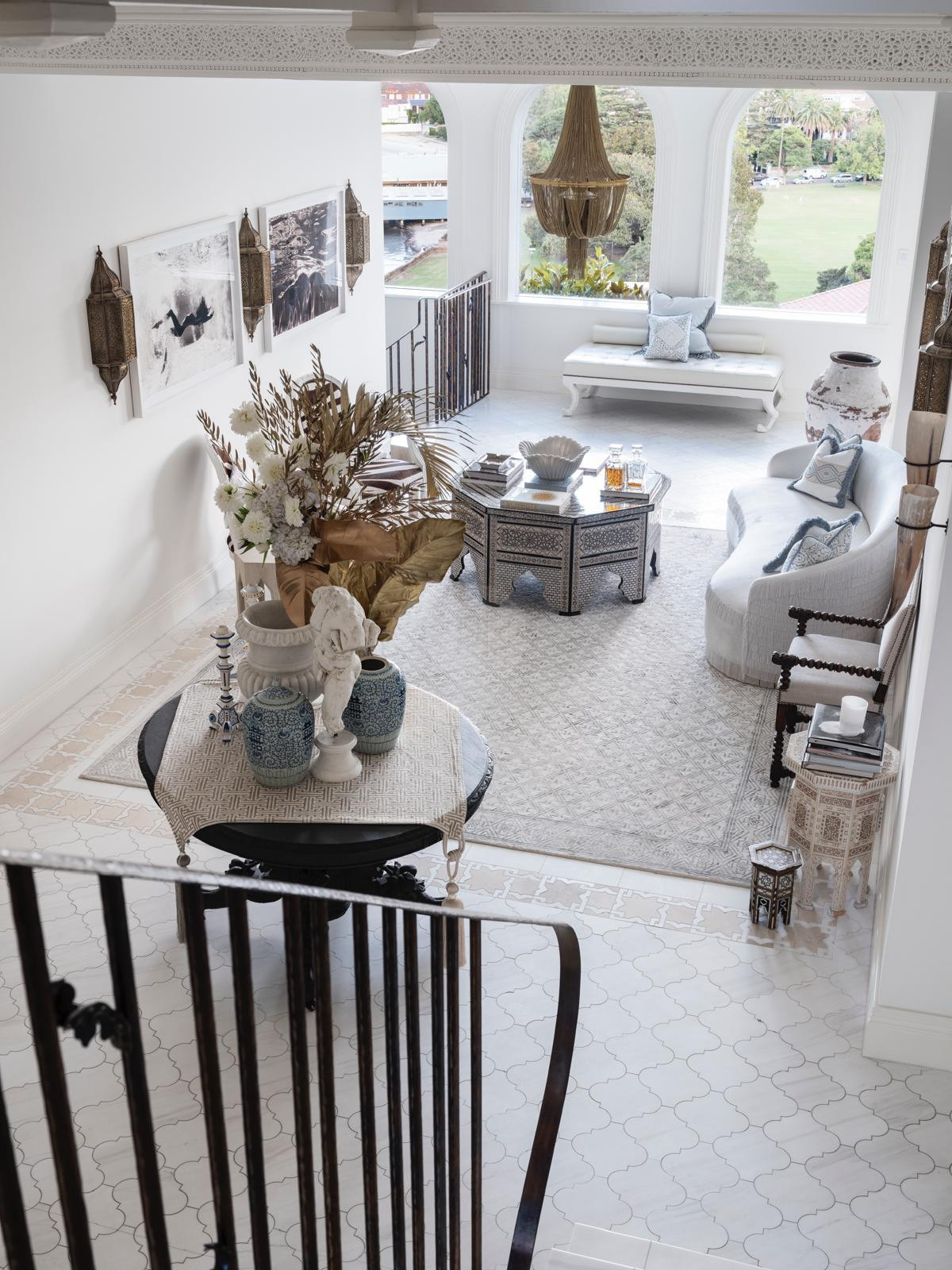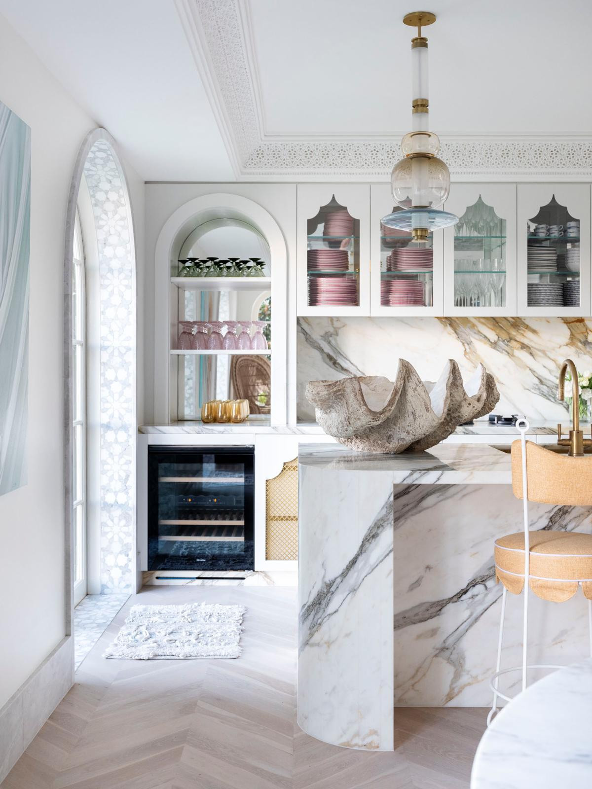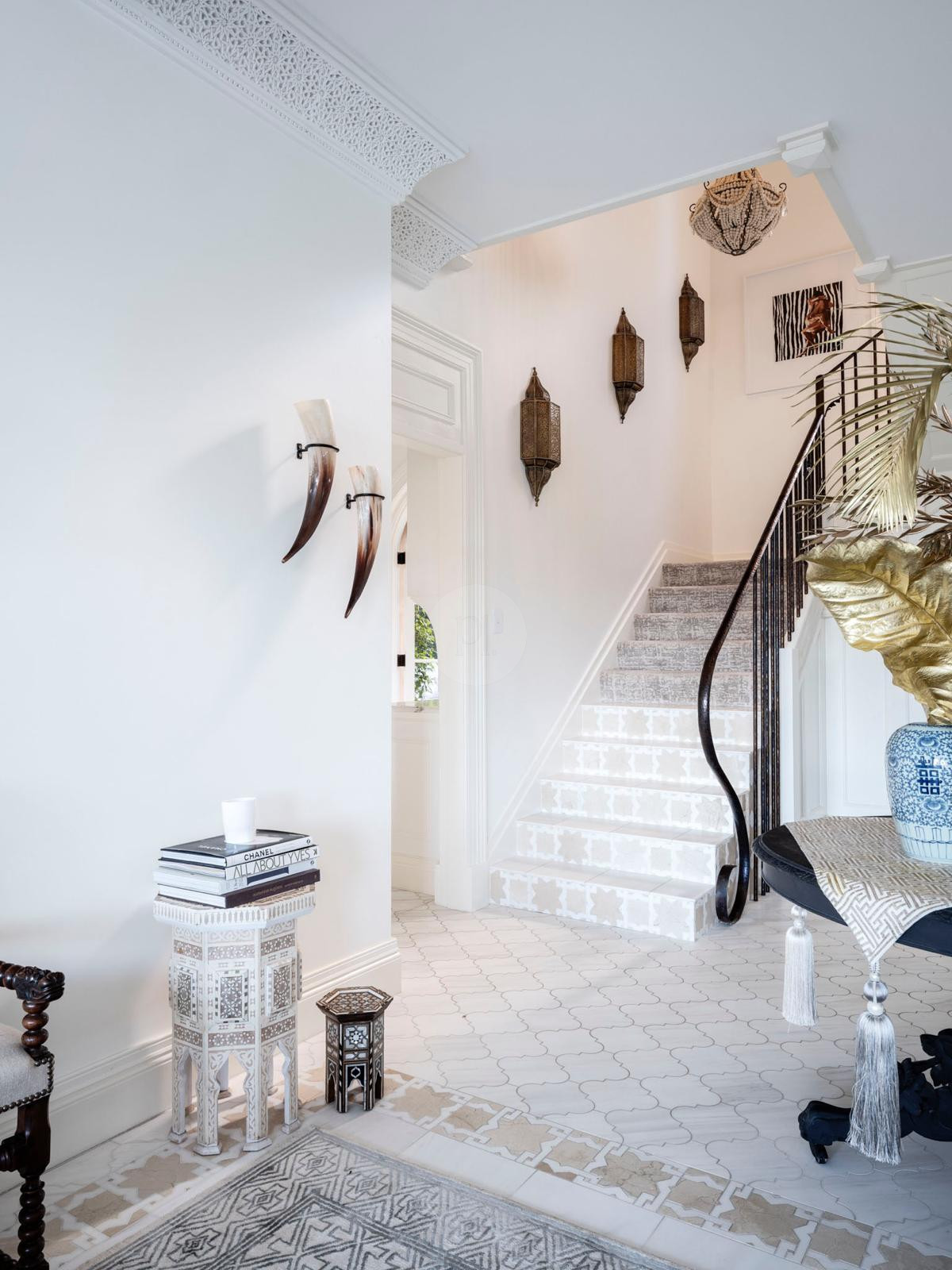 The lower level of the home has been reinvented into an enchanting outdoor entertaining space, seamlessly connecting to the garden, where sparkling harbour views await. The imaginative, bar-like kitchen on this level is also a key highlight of the home, featuring an island and splashback crafted from exquisite Calacatta Oro marble, and further complemented by Arabian-inspired white and gold cabinetry, vibrant glassware and statement pendant lighting.