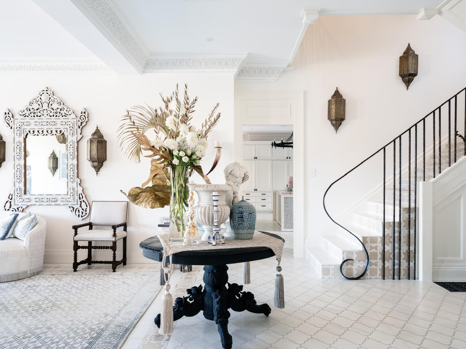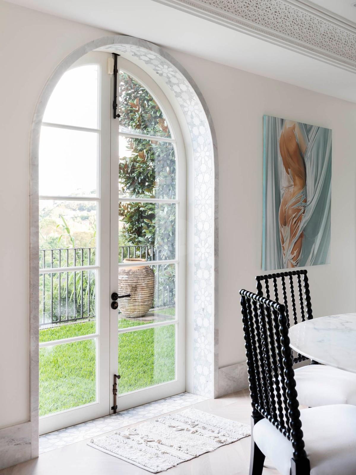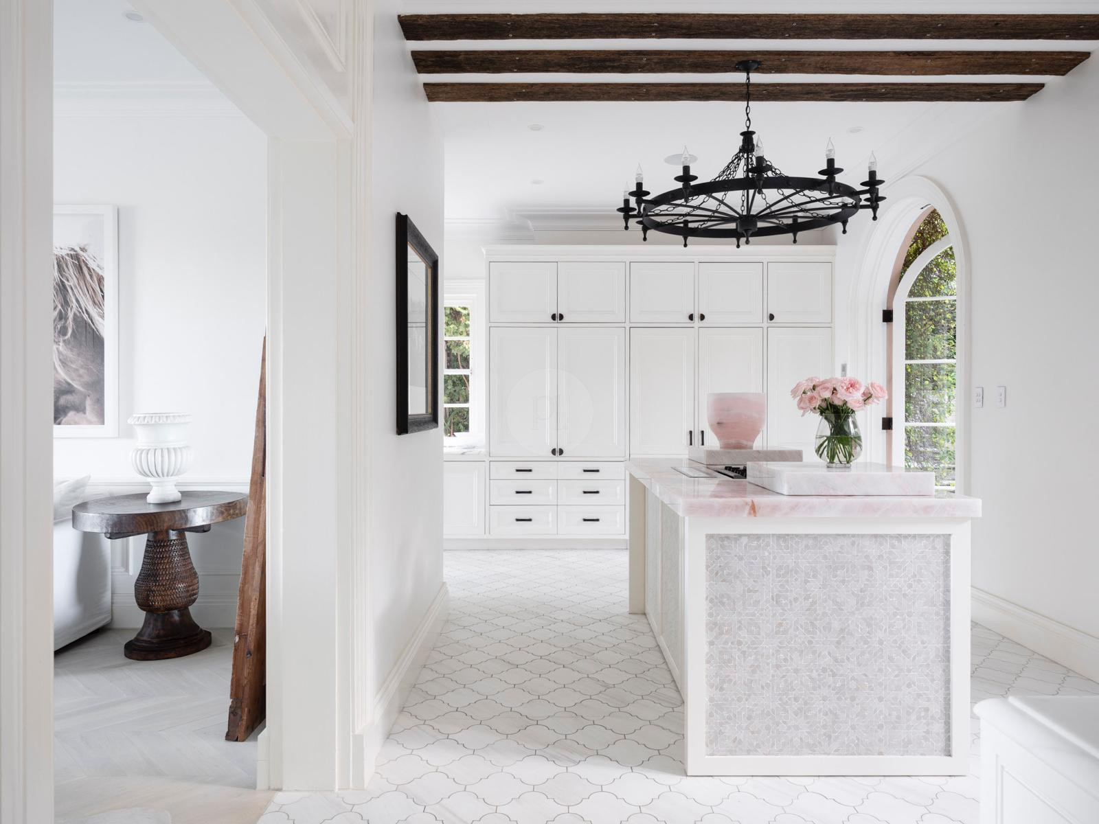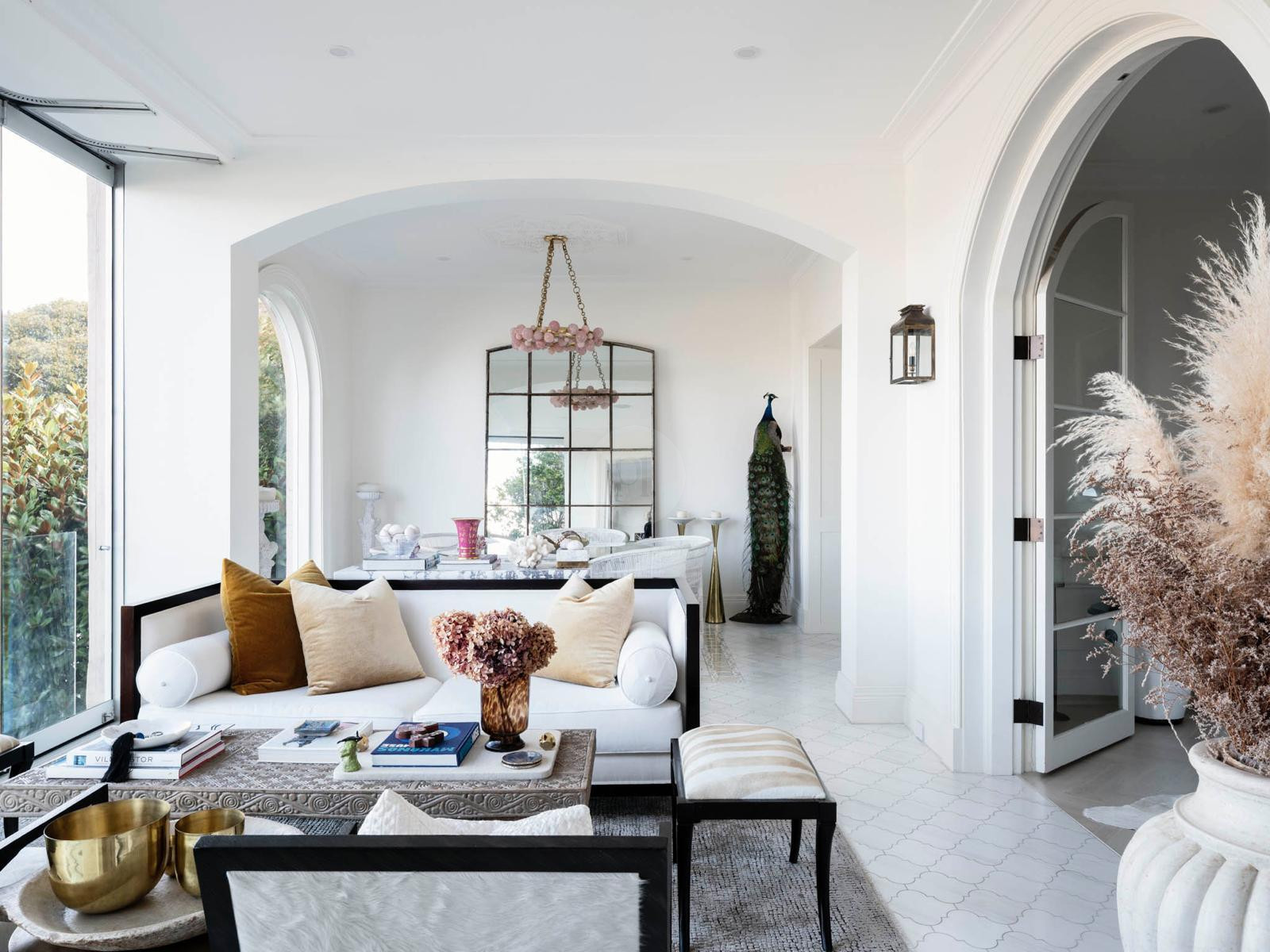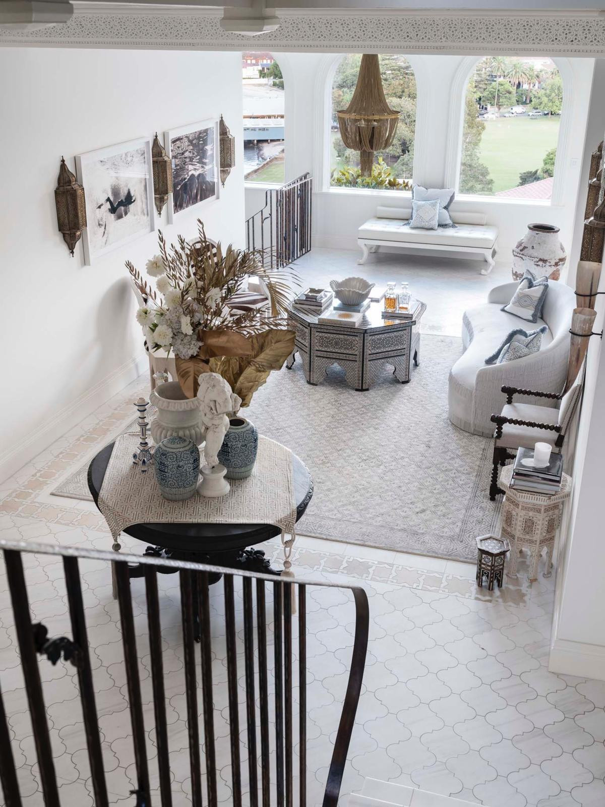 The lower level of the home has been reinvented into an enchanting outdoor entertaining space, seamlessly connecting to the garden, where sparkling harbour views await. The imaginative, bar-like kitchen on this level is also a key highlight of the home, featuring an island and splashback crafted from exquisite Calacatta Oro marble, and further complemented by Arabian-inspired white and gold cabinetry, vibrant glassware and statement pendant lighting.