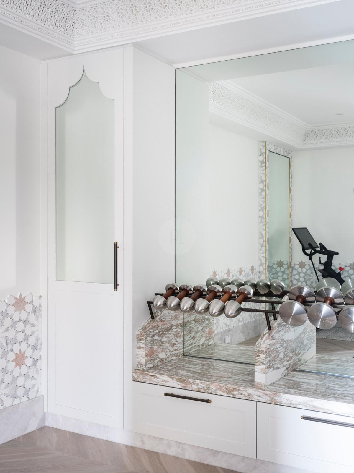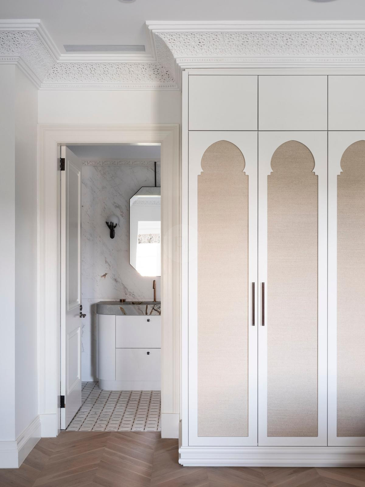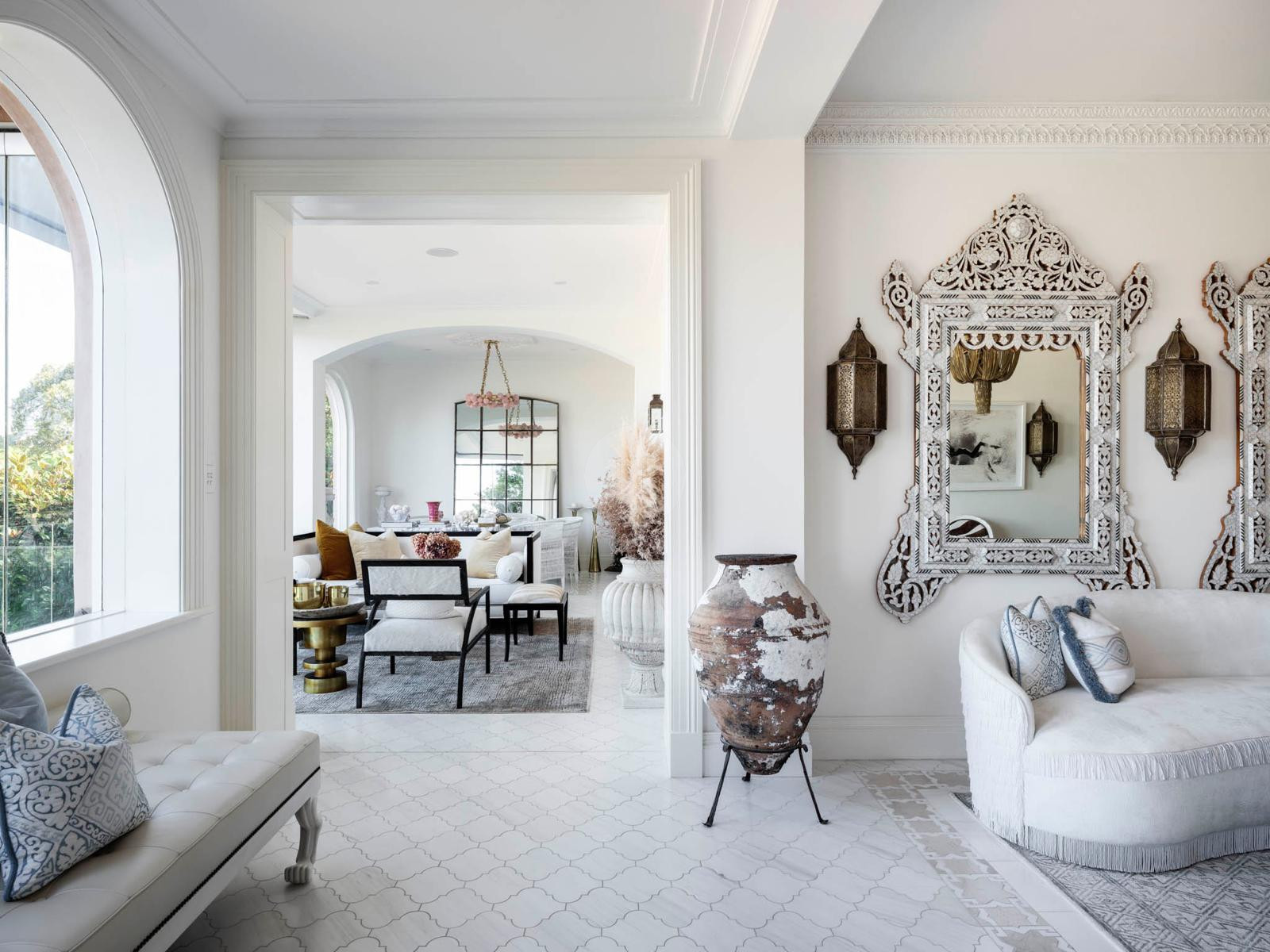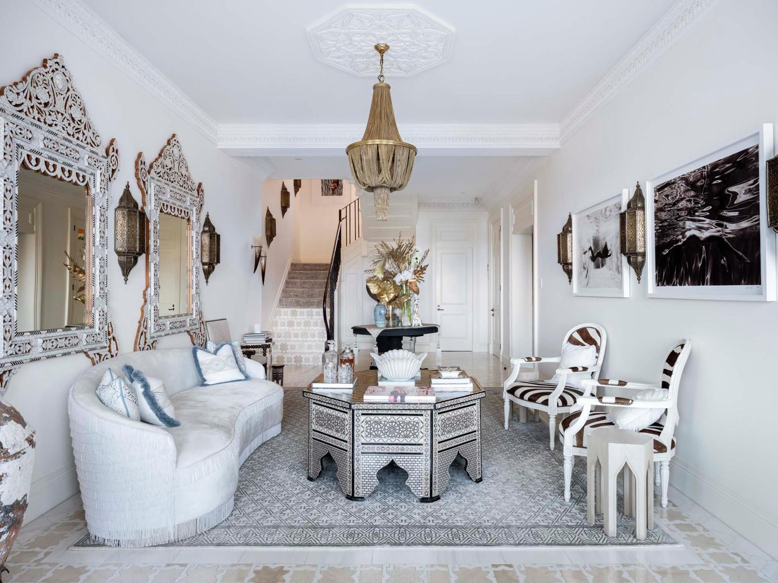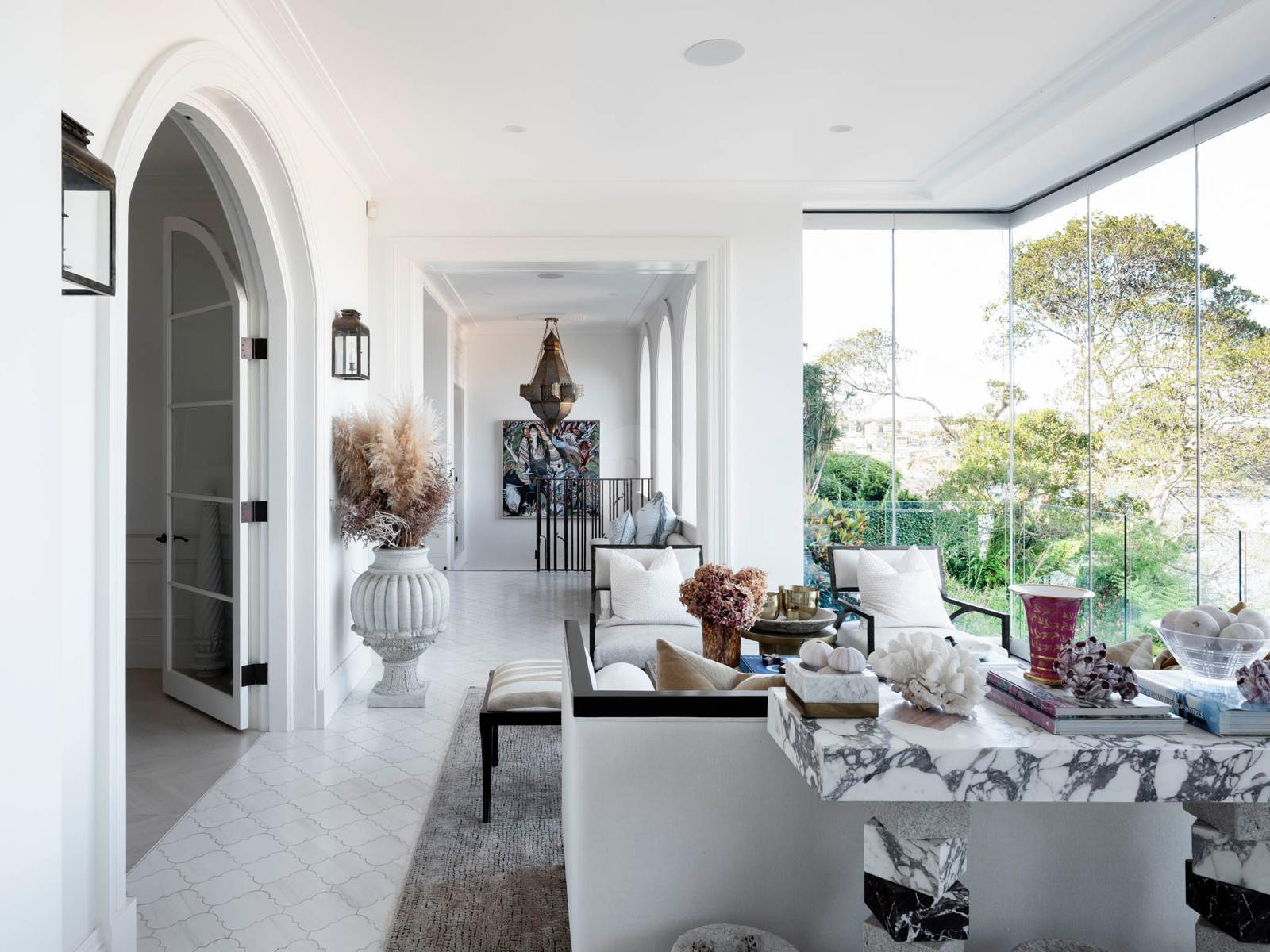 The lower level of the home has been reinvented into an enchanting outdoor entertaining space, seamlessly connecting to the garden, where sparkling harbour views await. The imaginative, bar-like kitchen on this level is also a key highlight of the home, featuring an island and splashback crafted from exquisite Calacatta Oro marble, and further complemented by Arabian-inspired white and gold cabinetry, vibrant glassware and statement pendant lighting.