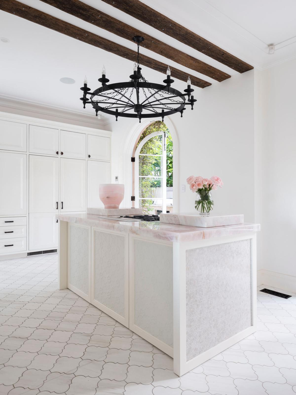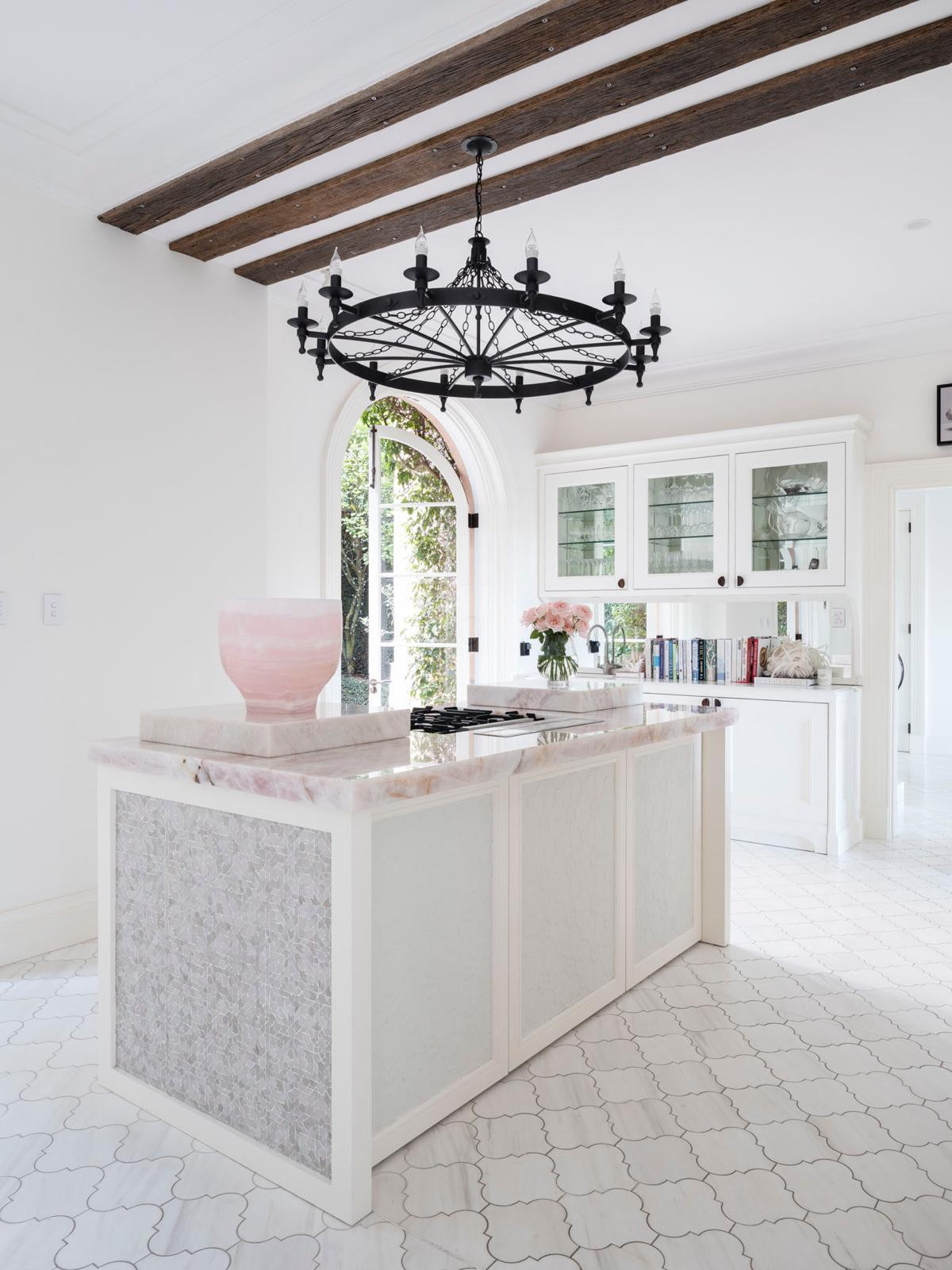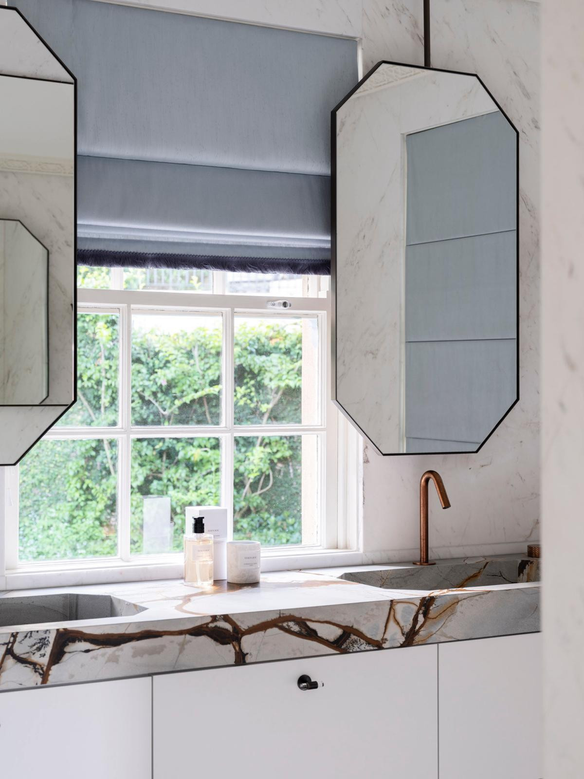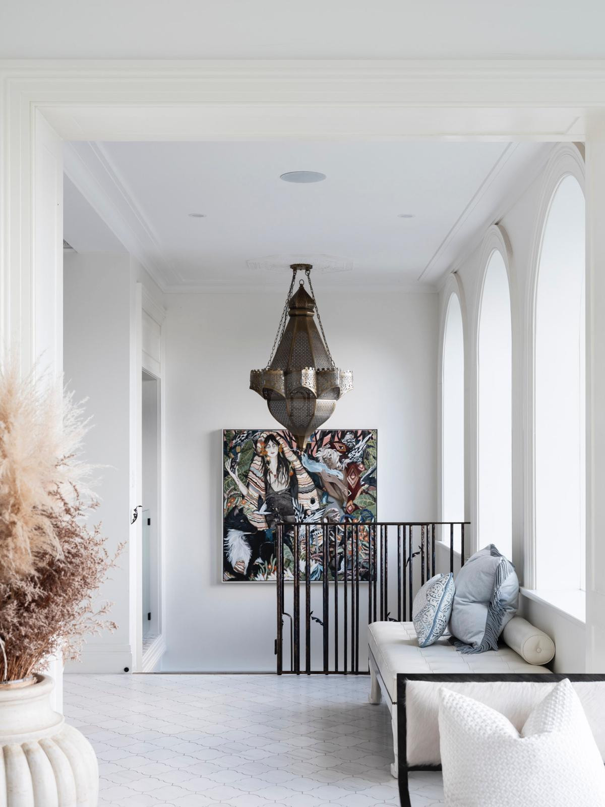 The lower level of the home has been reinvented into an enchanting outdoor entertaining space, seamlessly connecting to the garden, where sparkling harbour views await. The imaginative, bar-like kitchen on this level is also a key highlight of the home, featuring an island and splashback crafted from exquisite Calacatta Oro marble, and further complemented by Arabian-inspired white and gold cabinetry, vibrant glassware and statement pendant lighting.