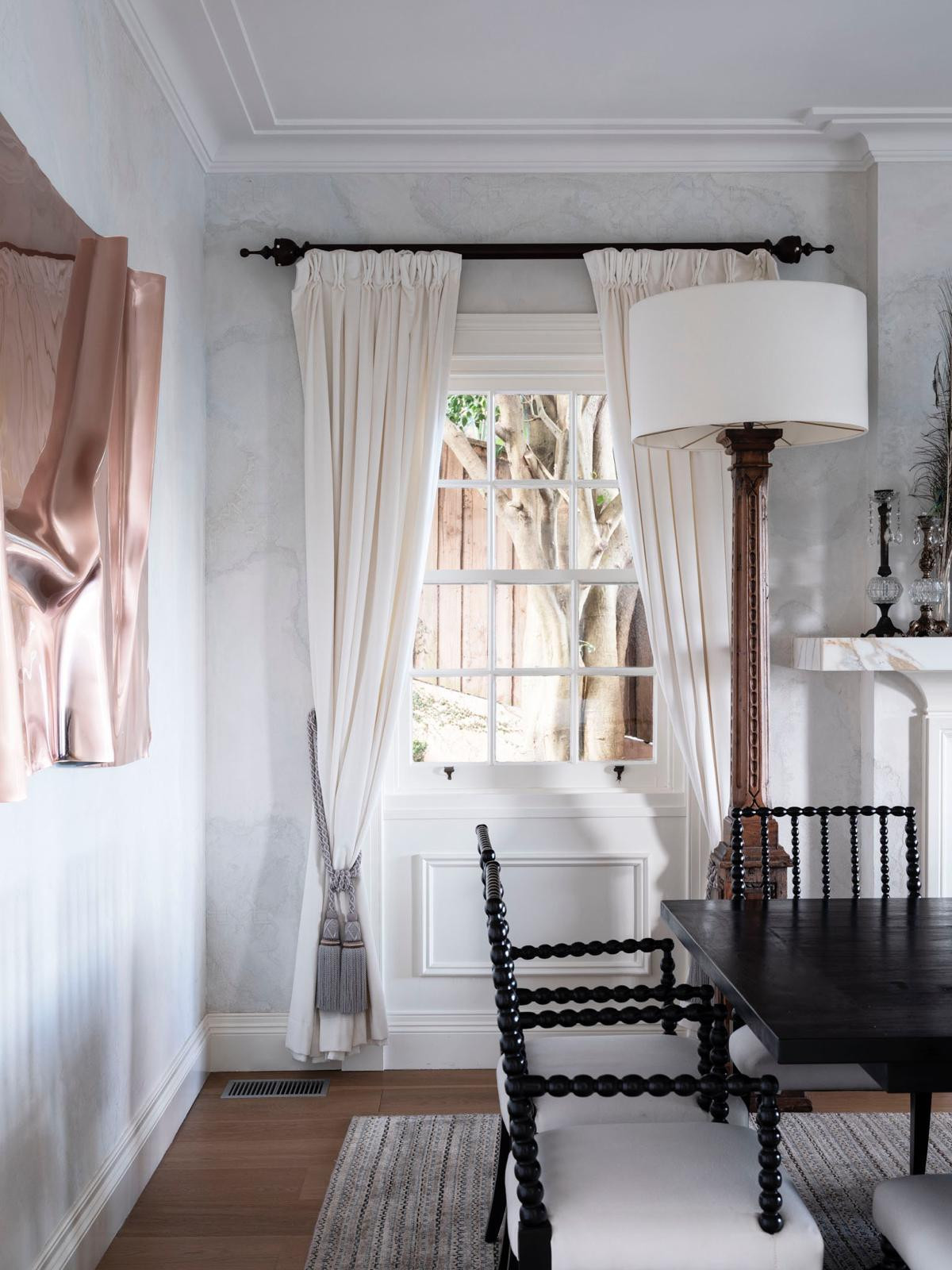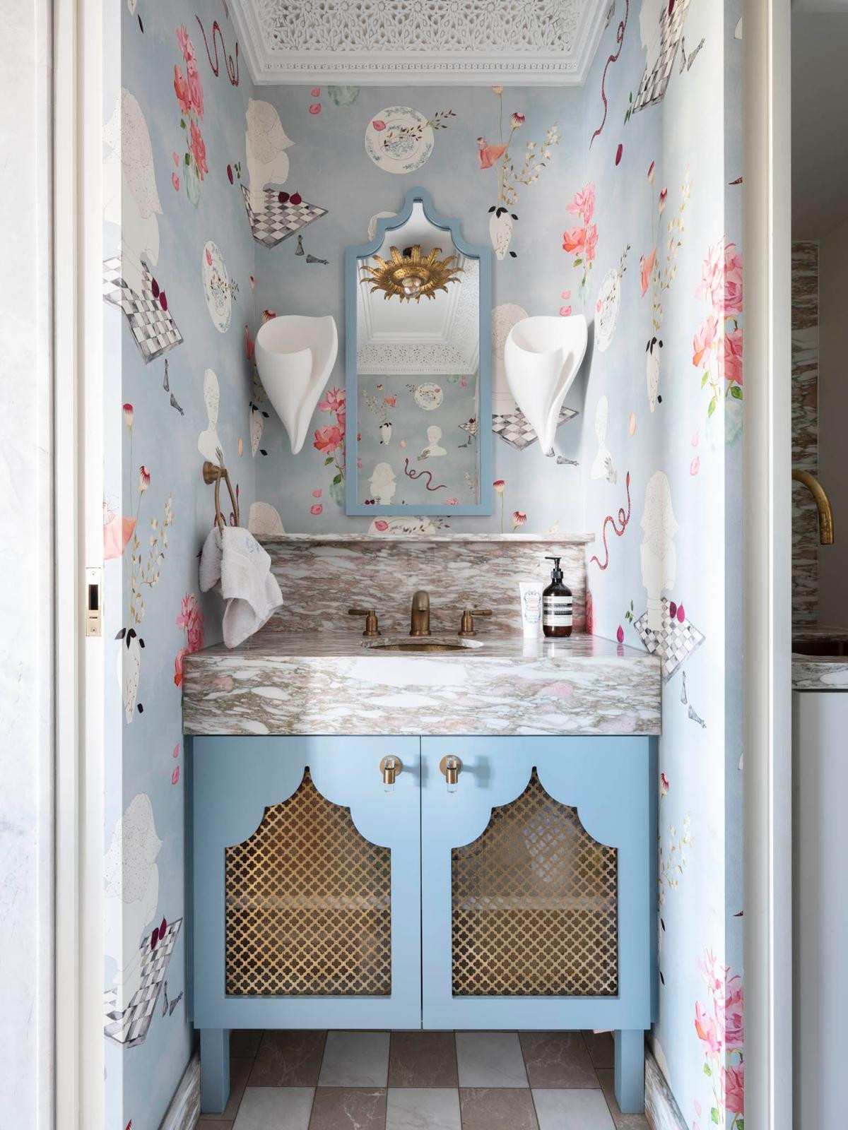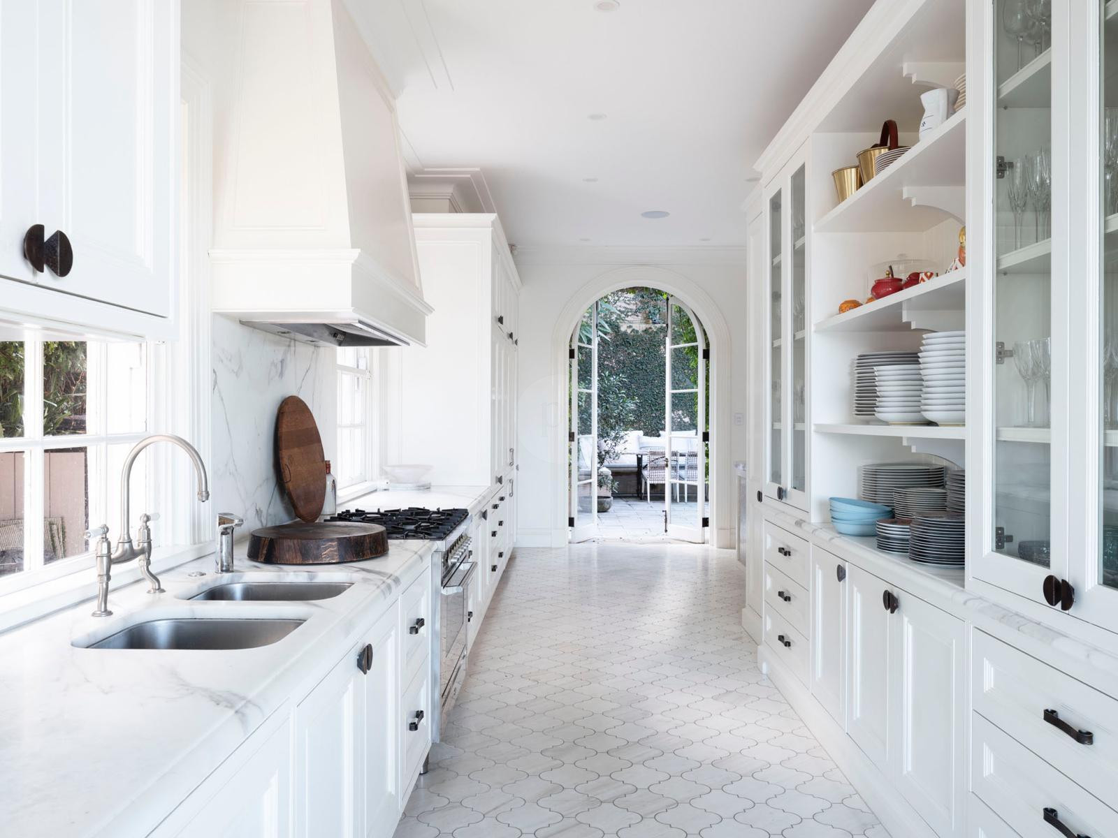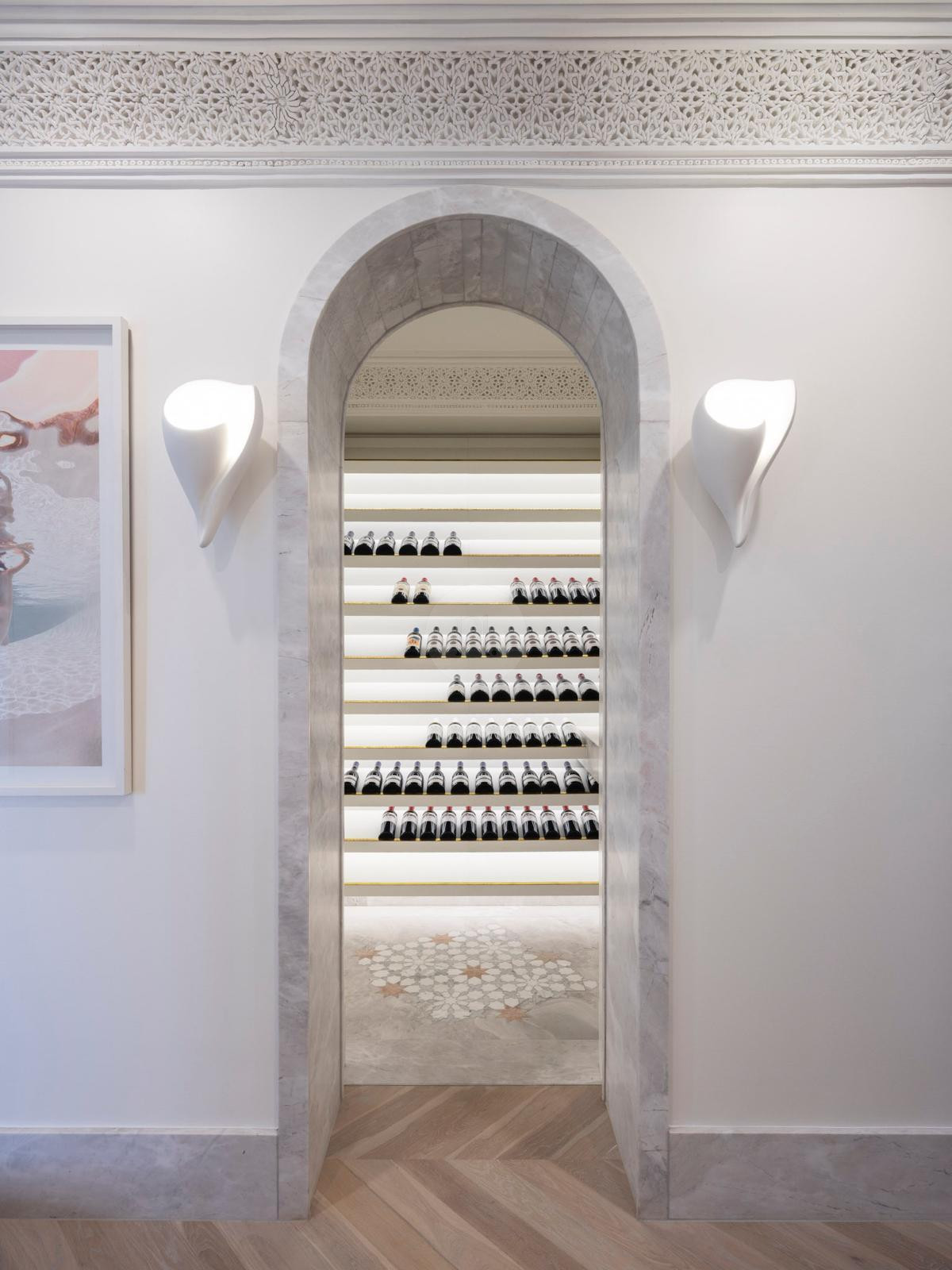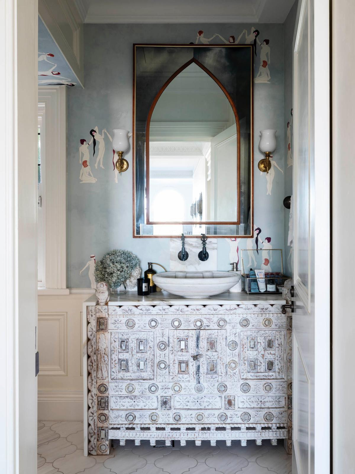 The lower level of the home has been reinvented into an enchanting outdoor entertaining space, seamlessly connecting to the garden, where sparkling harbour views await. The imaginative, bar-like kitchen on this level is also a key highlight of the home, featuring an island and splashback crafted from exquisite Calacatta Oro marble, and further complemented by Arabian-inspired white and gold cabinetry, vibrant glassware and statement pendant lighting.