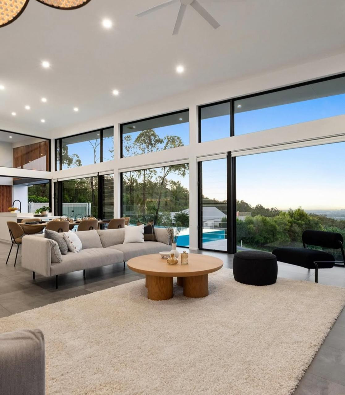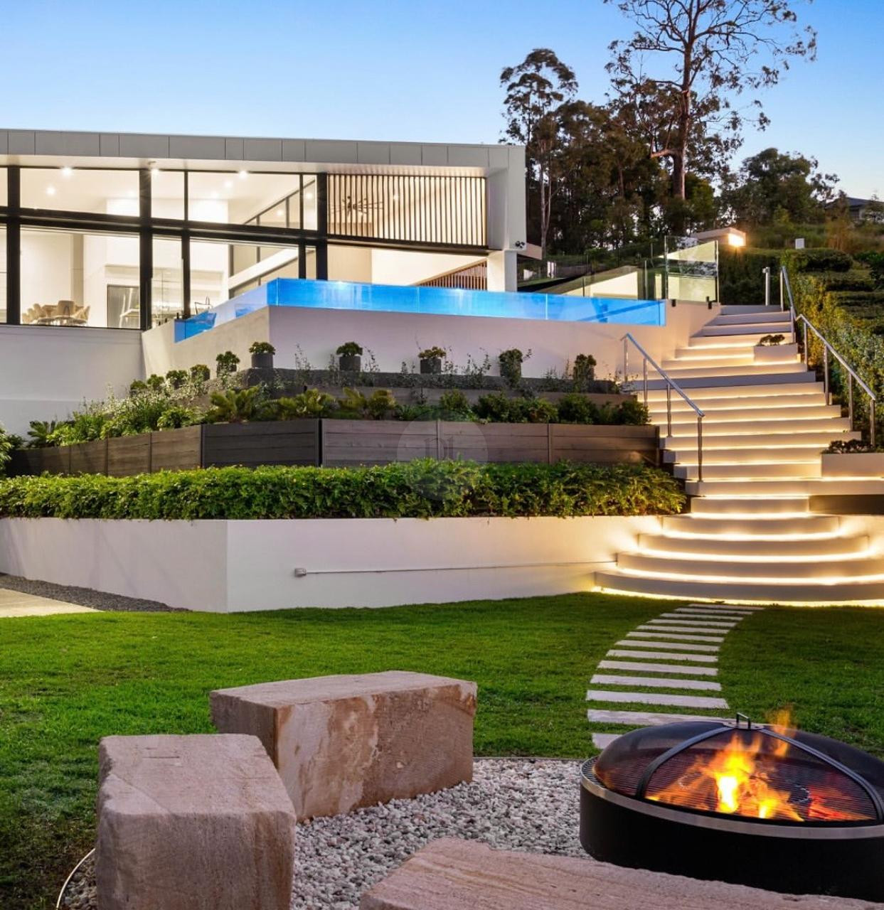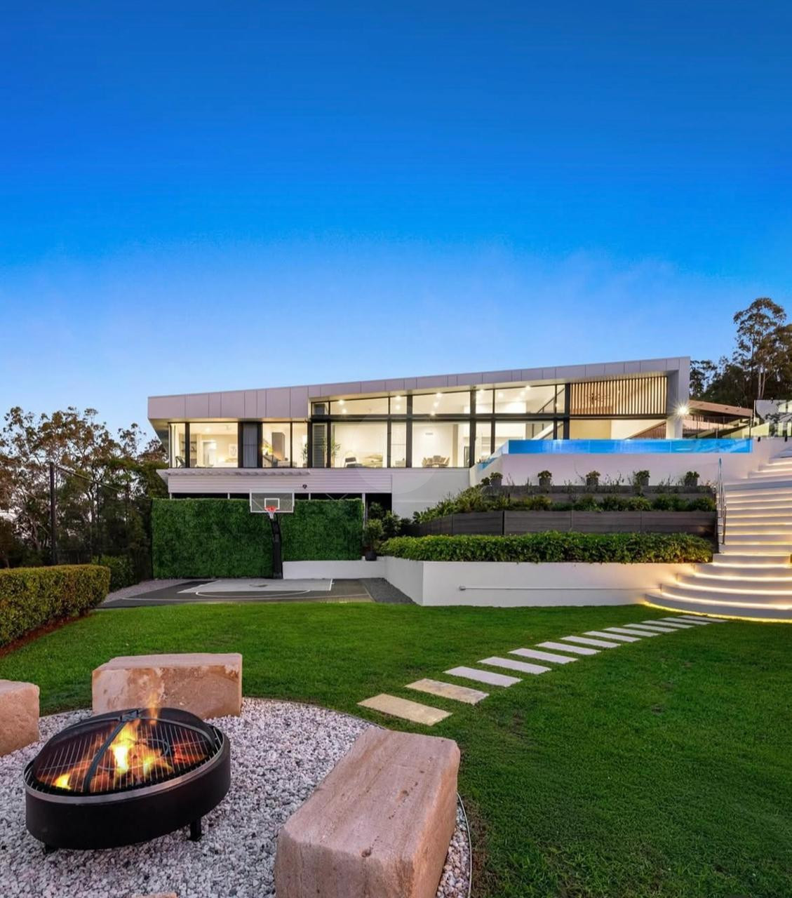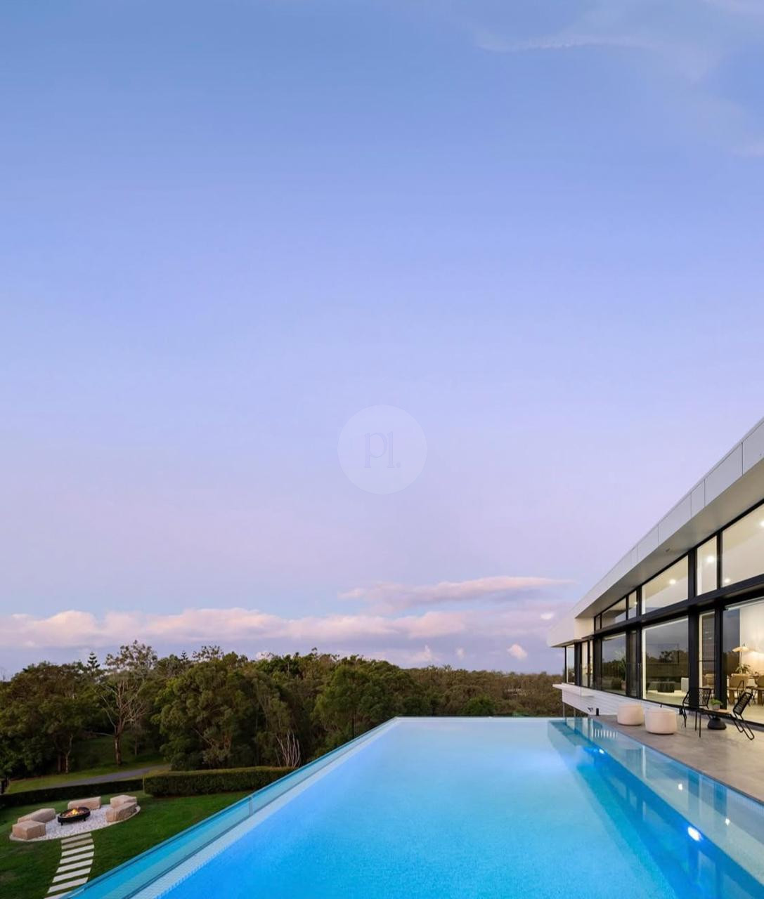 The property features expansive living areas with lofty 4.5 metre ceilings, creating an inviting atmosphere filled with natural light. Floor-to-ceiling glass windows seamlessly connect the indoors with the outdoors, showcasing the beautifully landscaped gardens and the sparkling glass-edged infinity pool. The alfresco entertaining area, complete with a BBQ zone and fire pit, is ideal for capturing those magical alfresco, lifestyle stills.