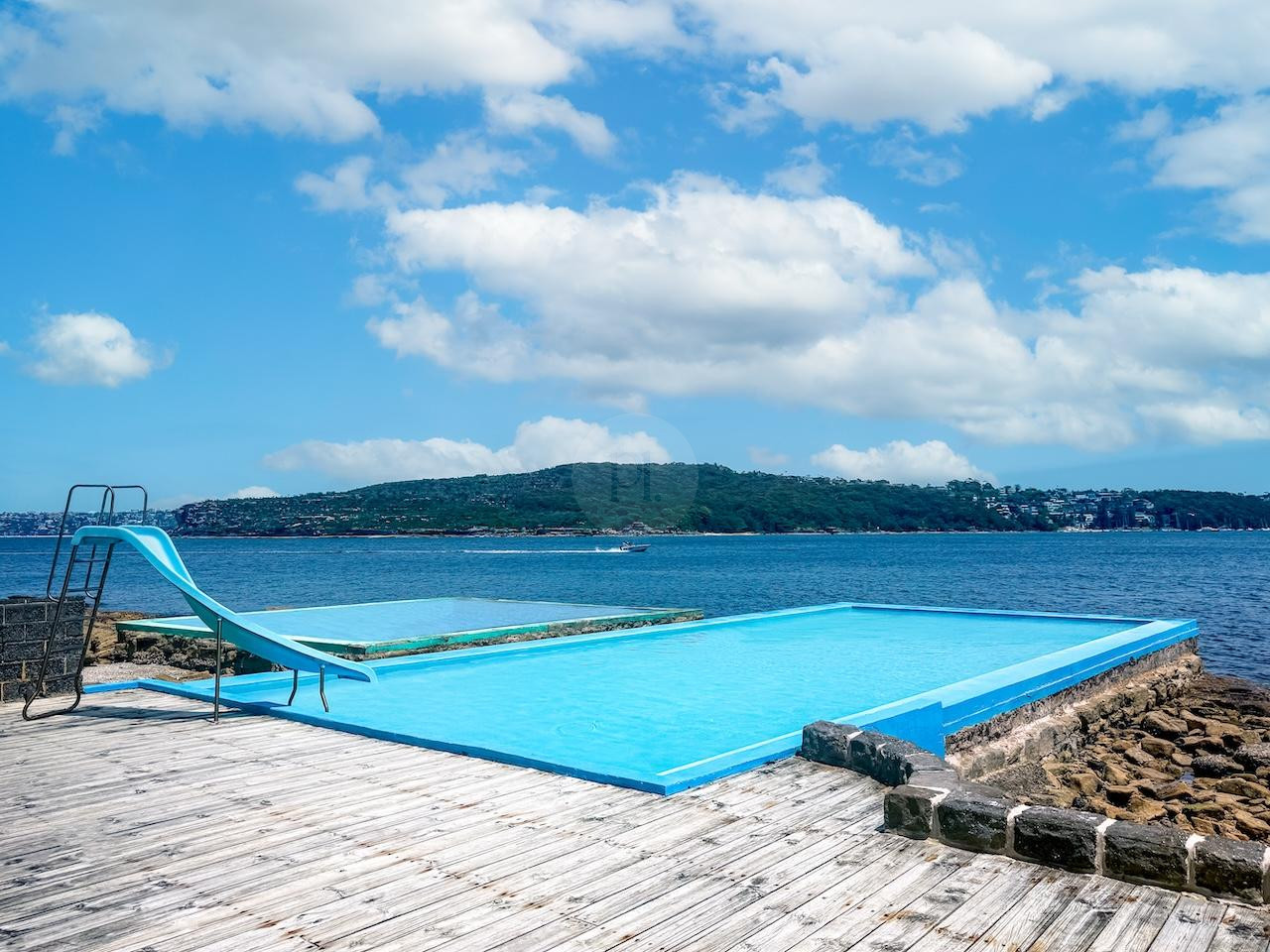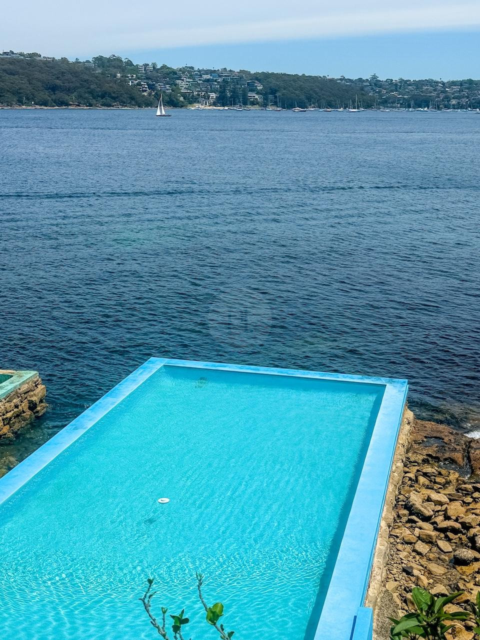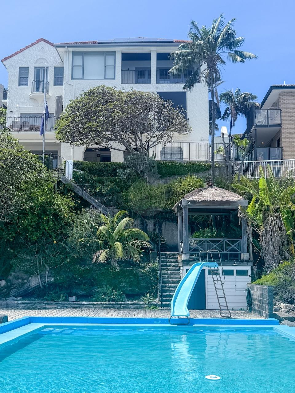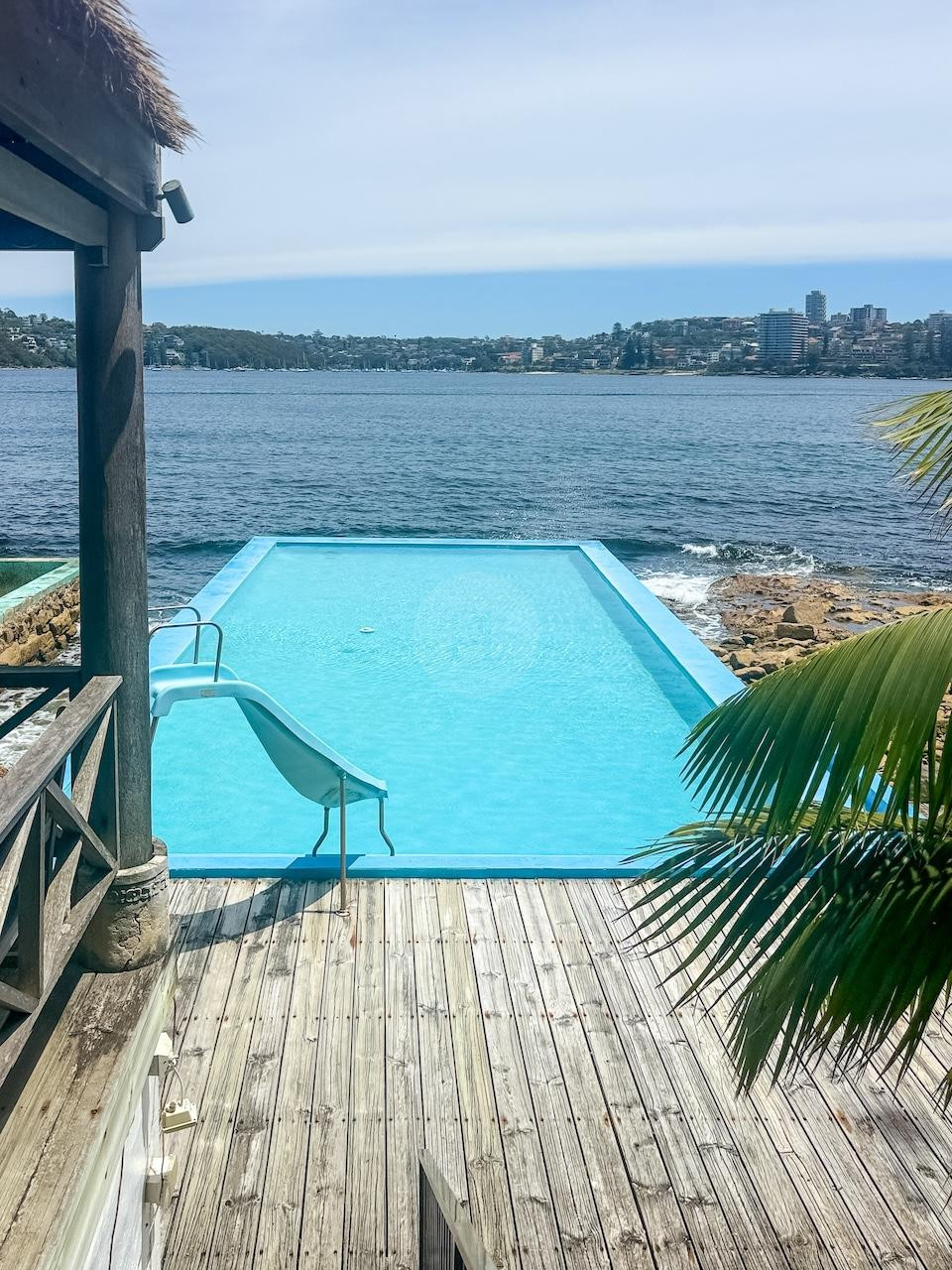 As you step inside, you’ll be greeted by an open-plan kitchen and living area that boasts spectacular views over the shimmering sea. Venture to the lower level, where you’ll find a spacious bedroom for HMU and direct access to the enchanting outdoor area. Here, the true magic unfolds. The outdoor living space is a haven for creativity, complete with a lounge area, outdoor dining space, and a magnificent infinity-edge pool, which features a retro resort-style slide that adds a playful touch. The charming pastel green and white boat shed adds to the nautical theme, making it an ideal setting for brand productions.