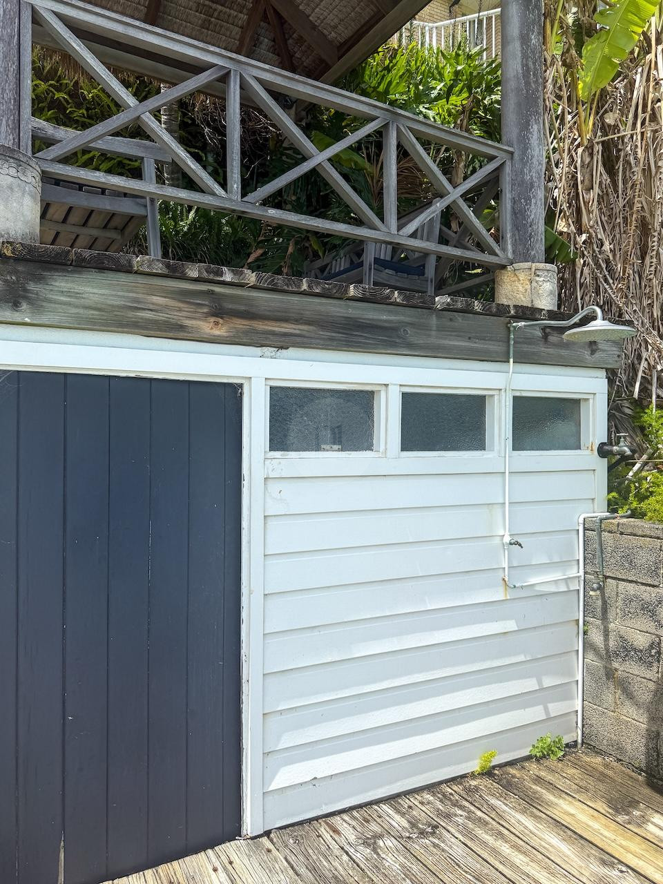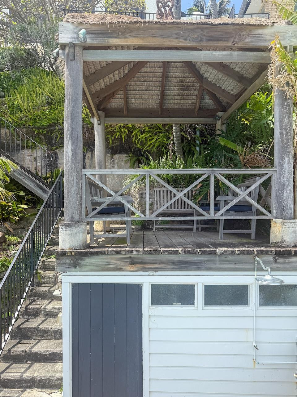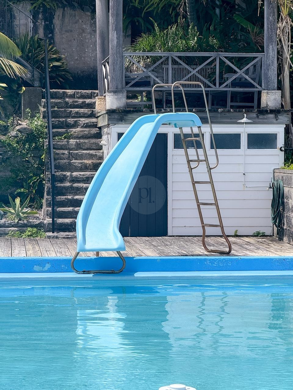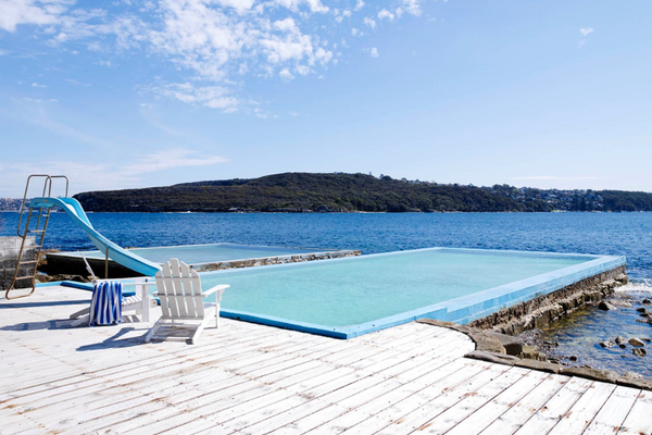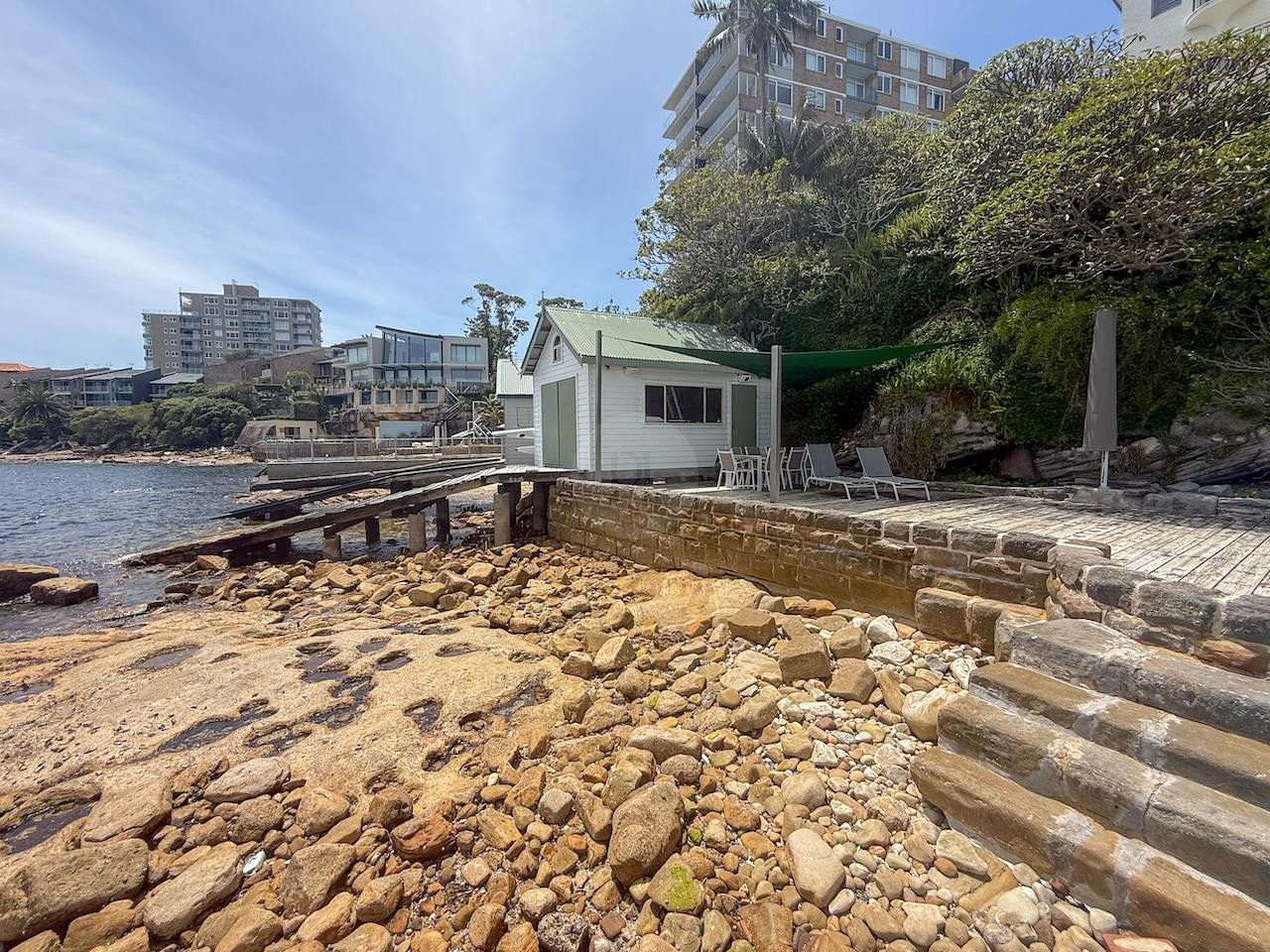 As you step inside, you’ll be greeted by an open-plan kitchen and living area that boasts spectacular views over the shimmering sea. Venture to the lower level, where you’ll find a spacious bedroom for HMU and direct access to the enchanting outdoor area. Here, the true magic unfolds. The outdoor living space is a haven for creativity, complete with a lounge area, outdoor dining space, and a magnificent infinity-edge pool, which features a retro resort-style slide that adds a playful touch. The charming pastel green and white boat shed adds to the nautical theme, making it an ideal setting for brand productions.
